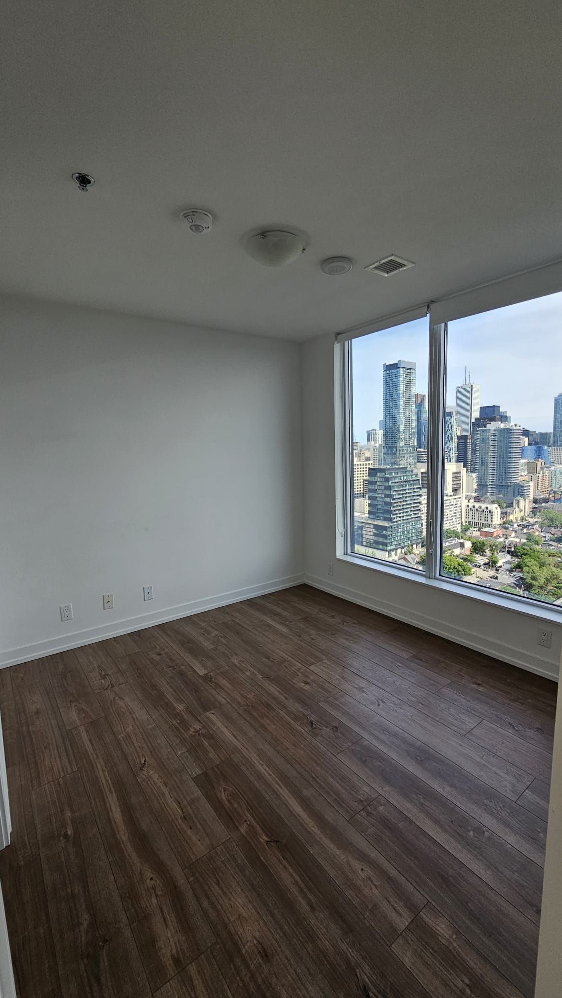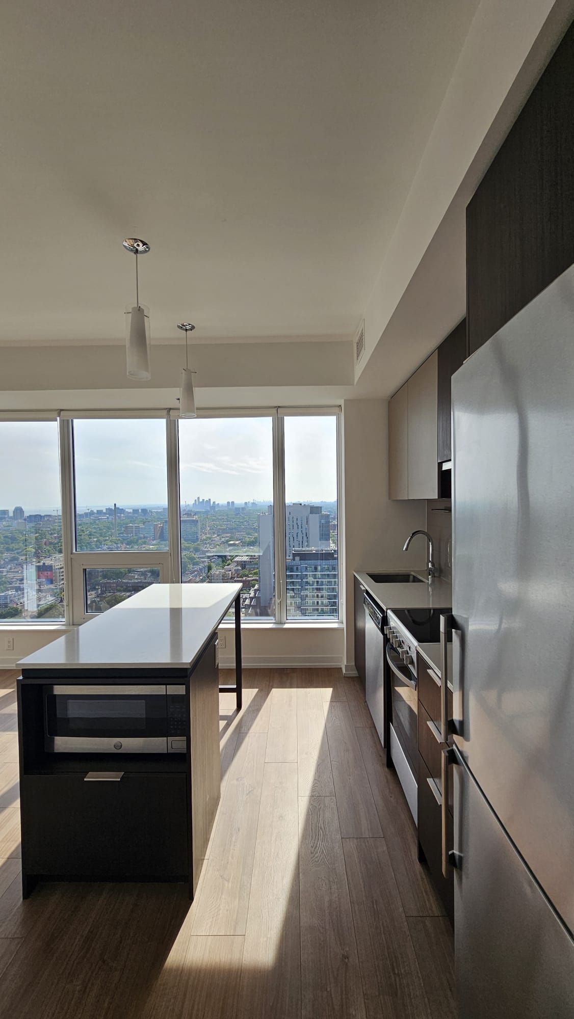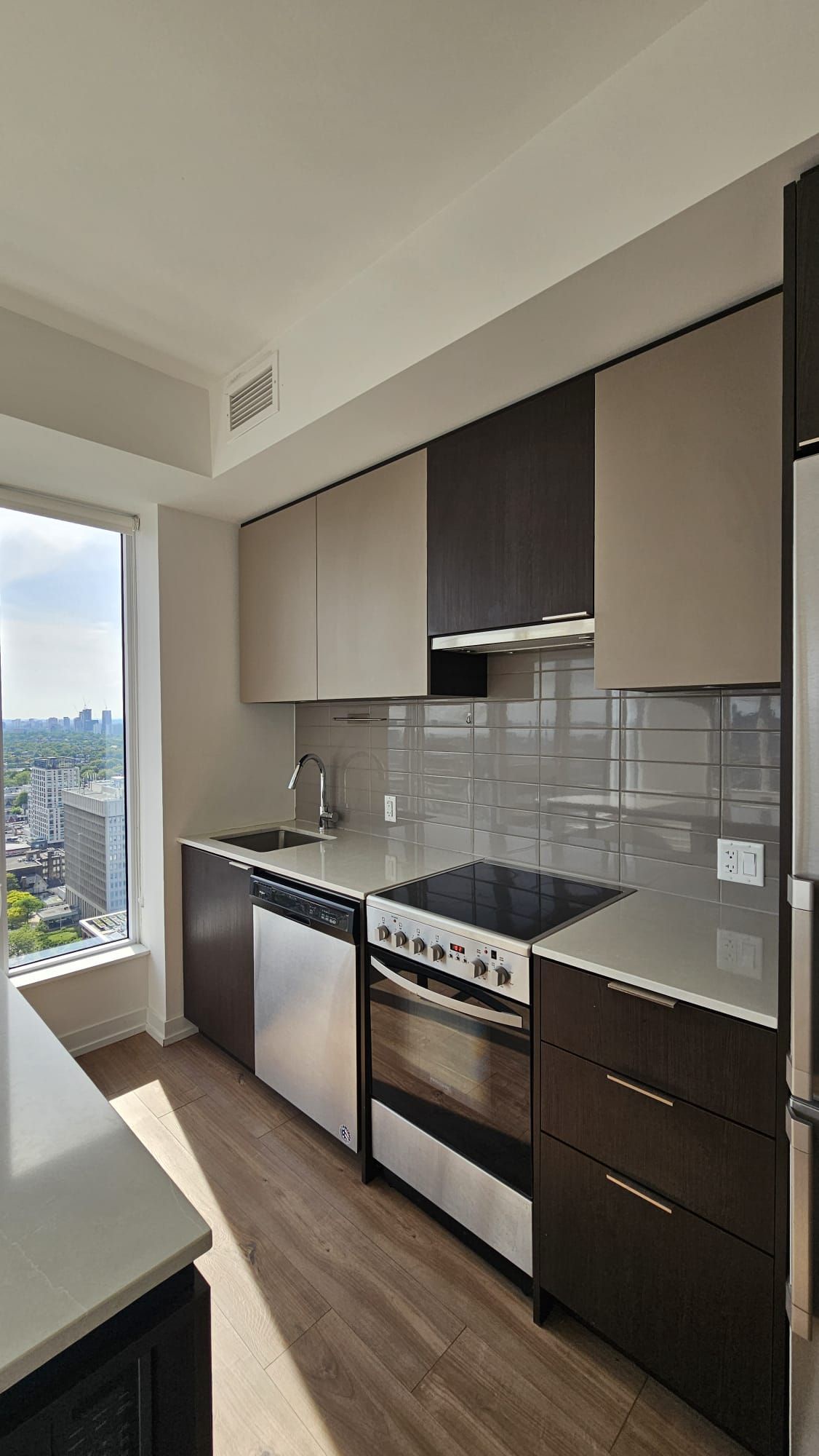 Beautiful southwest-facing corner unit at Theory Condos offering unobstructed CN Tower and sunset views. This 1-bedroom + den, 2 bathroom suite features a well-designed layout with large windows that bring in abundant natural light throughout the day. The modern kitchen is equipped with stainless steel appliances, quartz countertops, and tile backsplash. The den is enclosed with a door, making it perfect for a home office or use as a second bedroom. Amenities include a 24-hour concierge, a fully equipped fitness centre, media and party rooms, BBQ terrace, bike storage, and visitor parking. Ideally located just steps from U of T St. George campus, Queens Park and College subway stations, major hospitals, Grange Park, Kensington Market, and a wide selection of shops and restaurants. Walk Score of 98, Transit Score of 100. A rare opportunity to own a bright, versatile suite in a prime downtown location with unbeatable lifestyle convenience.