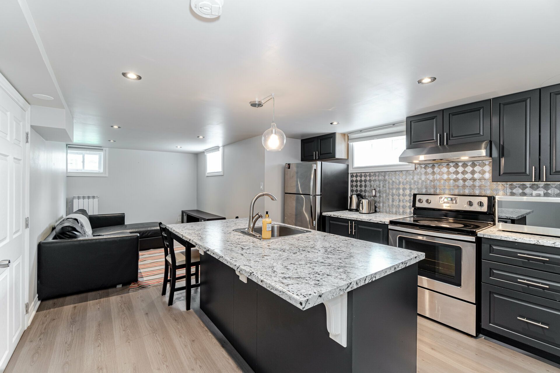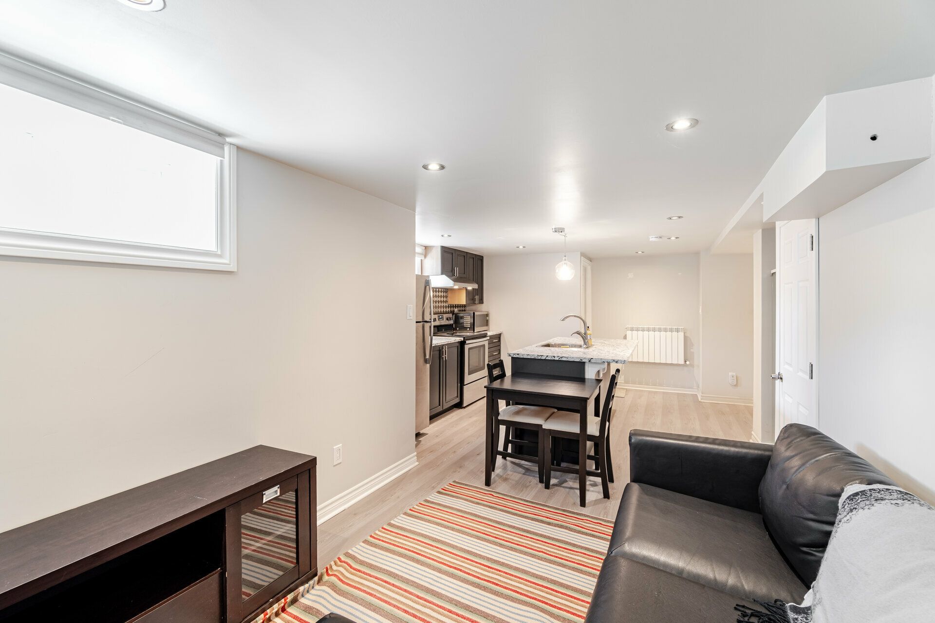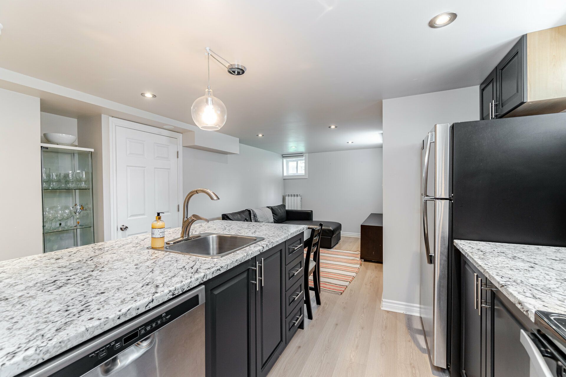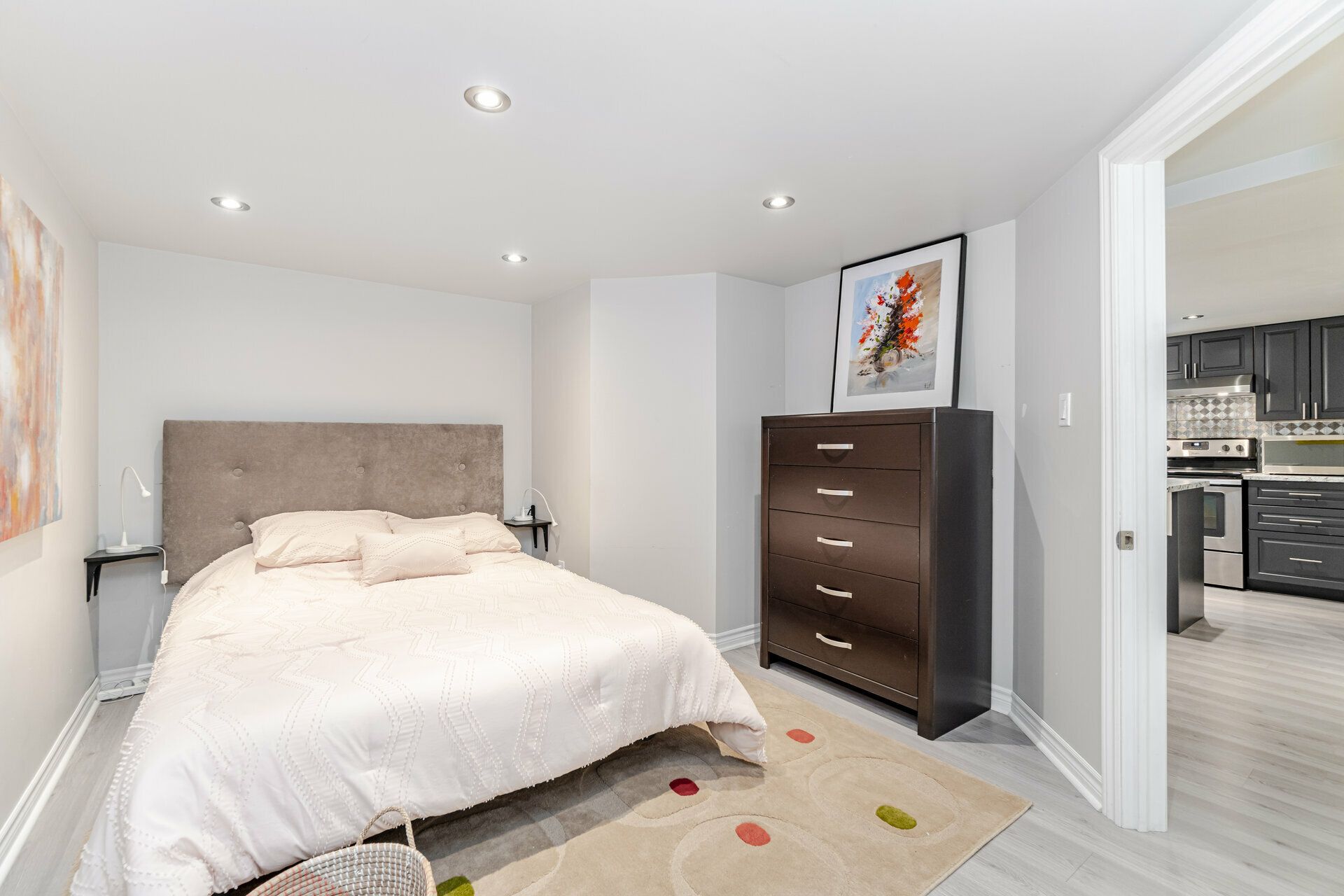 Stunning modern renovated basement apartment for lease in gorgeous historic neighbourhood of Weston Village. This suite boasts one of the best kitchens- featuring ample counter space, an island, & top-of-the-line stainless steel appliances, including a dishwasher! With 824 square feet of space, this furnished & move-in ready unit offers a spacious, bright, & inviting atmosphere. The apartment features large rooms & an ensuite laundry room with plenty of shelving for convenient storage. Sound proofing provides for quiet living. Enjoy a separate entrance at the back of the property, providing privacy & ease of access. Along with 1 driveway parking spot, tenants have the added benefit of using the patio & large backyard, perfect for relaxation.You can even garden! Don't miss the opportunity to make this your home! Experience comfort, style, & convenience in this thoughtfully designed apartment. Schedule a viewing now & embrace a lifestyle of modern living. A/C unit included.Conveniently walkable to Weston GO, farmers market, shops, restaurants+. Centrally located near Up Express, Humber Hospital, 401, 400, Yorkdale. No pets, no smokers. Utilities included. Rogers high-speed internet offered at +$95/m