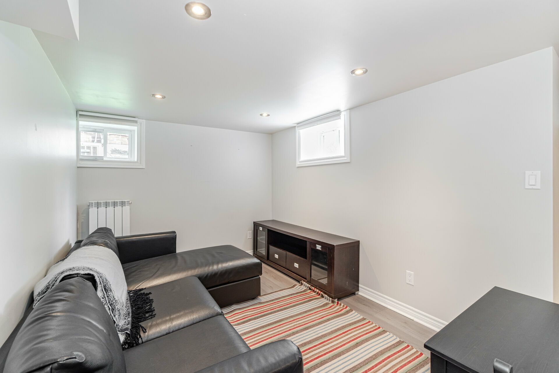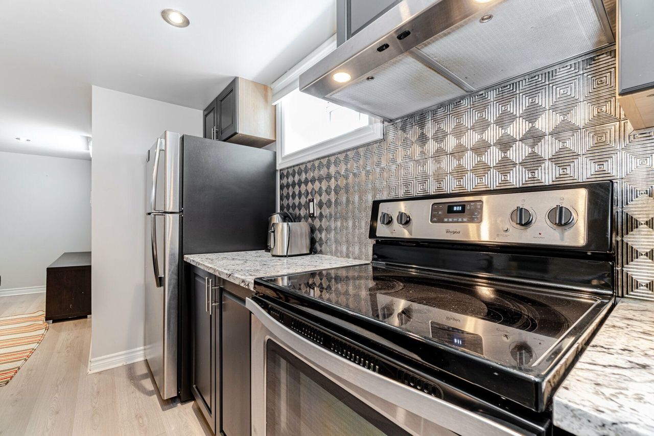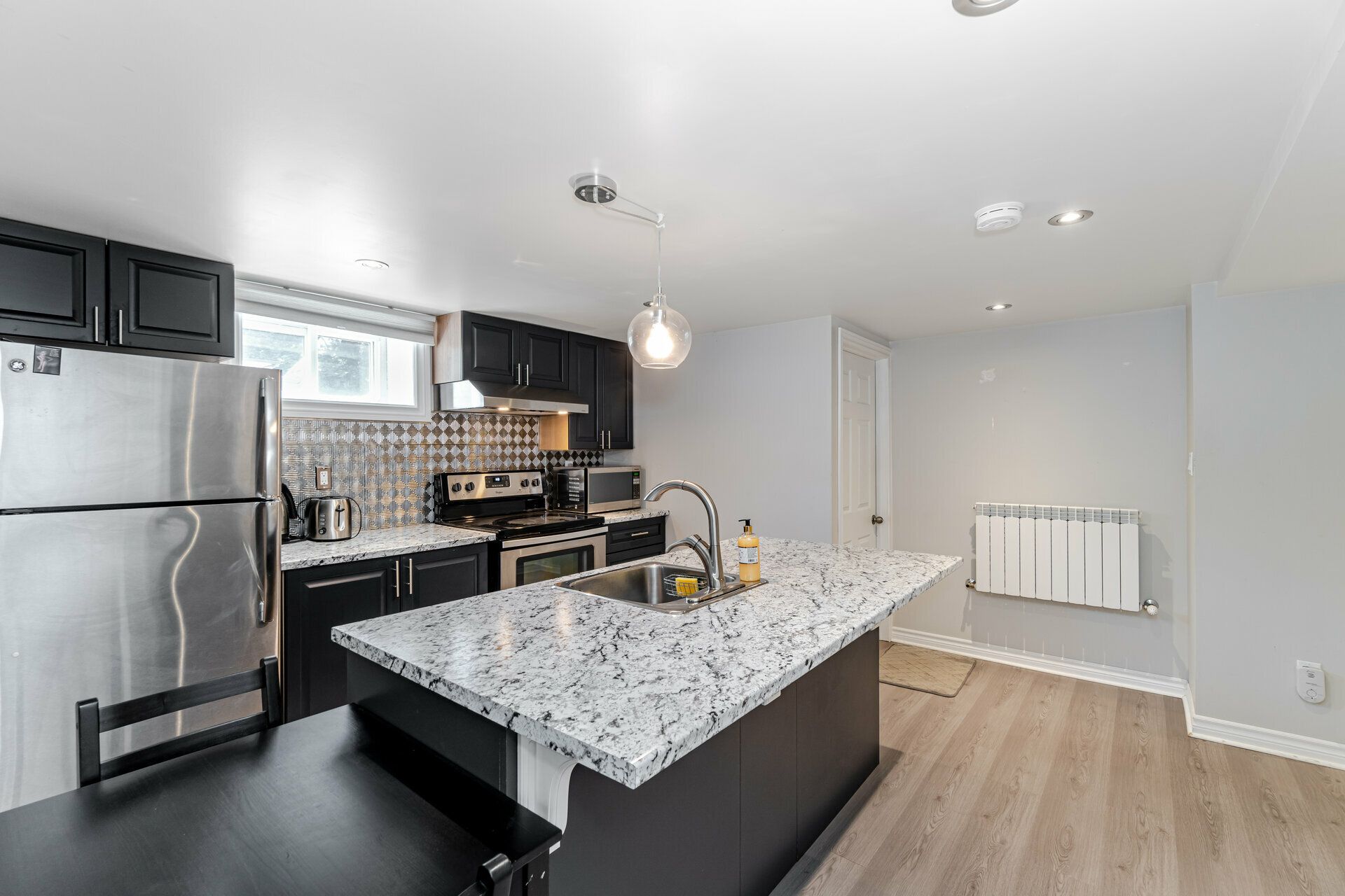Stunning modern renovated basement apartment for lease in gorgeous historic neighbourhood of Weston Village. This suite boasts one of the best kitchens- featuring ample counter space, an island, & top-of-the-line stainless steel appliances, including a dishwasher! With 824 square feet of space, this furnished & move-in ready unit offers a spacious, bright, & inviting atmosphere. The apartment features large rooms & an ensuite laundry room with plenty of shelving for convenient storage. Sound proofing provides for quiet living. Enjoy a separate entrance at the back of the property, providing privacy & ease of access. Along with 1 driveway parking spot, tenants have the added benefit of using the patio & large backyard, perfect for relaxation.You can even garden! Don't miss the opportunity to make this your home! Experience comfort, style, & convenience in this thoughtfully designed apartment. Schedule a viewing now & embrace a lifestyle of modern living. A/C unit included.Conveniently walkable to Weston GO, farmers market, shops, restaurants+. Centrally located near Up Express, Humber Hospital, 401, 400, Yorkdale. No pets, no smokers. Utilities included. Rogers high-speed internet offered at +$95/m