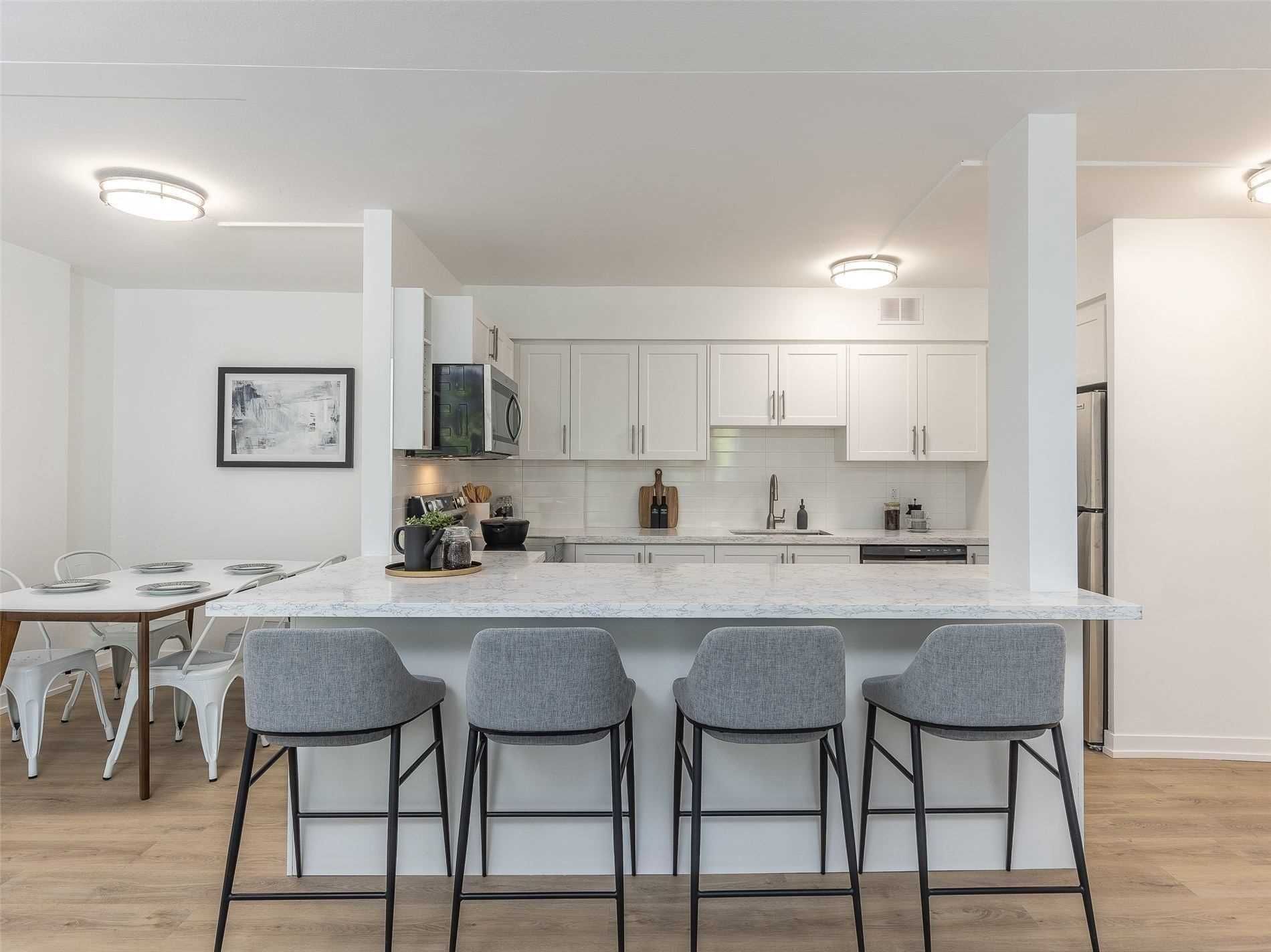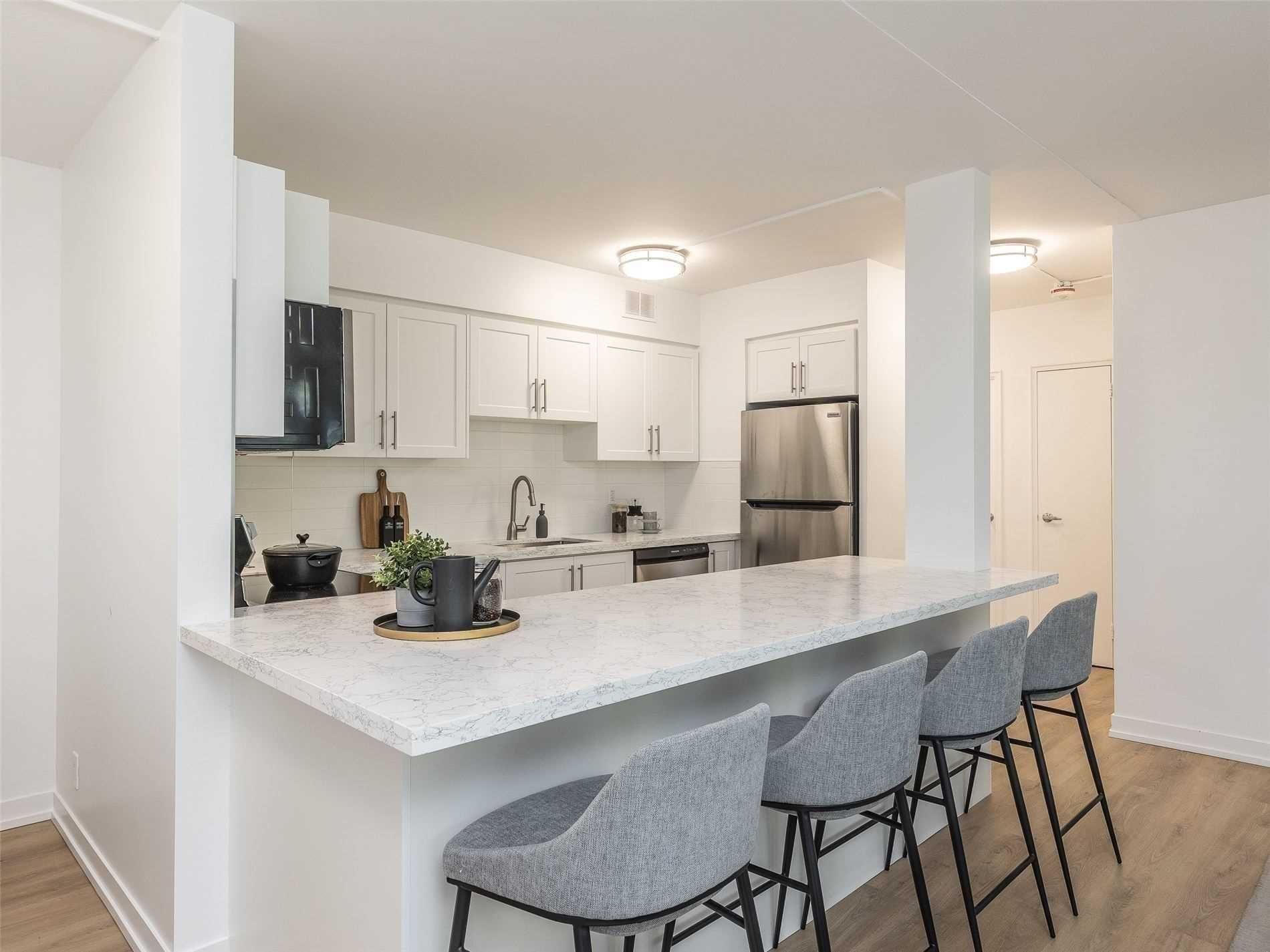 Welcome To 240 Markland - Beautifully Renovated, Like-New Spacious 1 Bedroom + Den Suite Spanning Over 700 Sf Of Functional, Open Concept Living Space. Chefs Kitchen W/ Full-Sized S/S Appliances, Quartz Countertops & Large Island. Enjoy Spa-Like 4Pc Bathroom. Walk Out To Oversized Private Balcony. Located Steps From TTC, Parks & SchoolsS/S Appliances; Fridge, Stove, Dishwasher & Microwave/Fan. Light Fixtures & Roller Blinds Included. Central Ac/Heating. Tenant Pays Hydro. Updated Lobby & On-Site Laundry. Surface Parking Available @ 210 Markland For $100/Month.