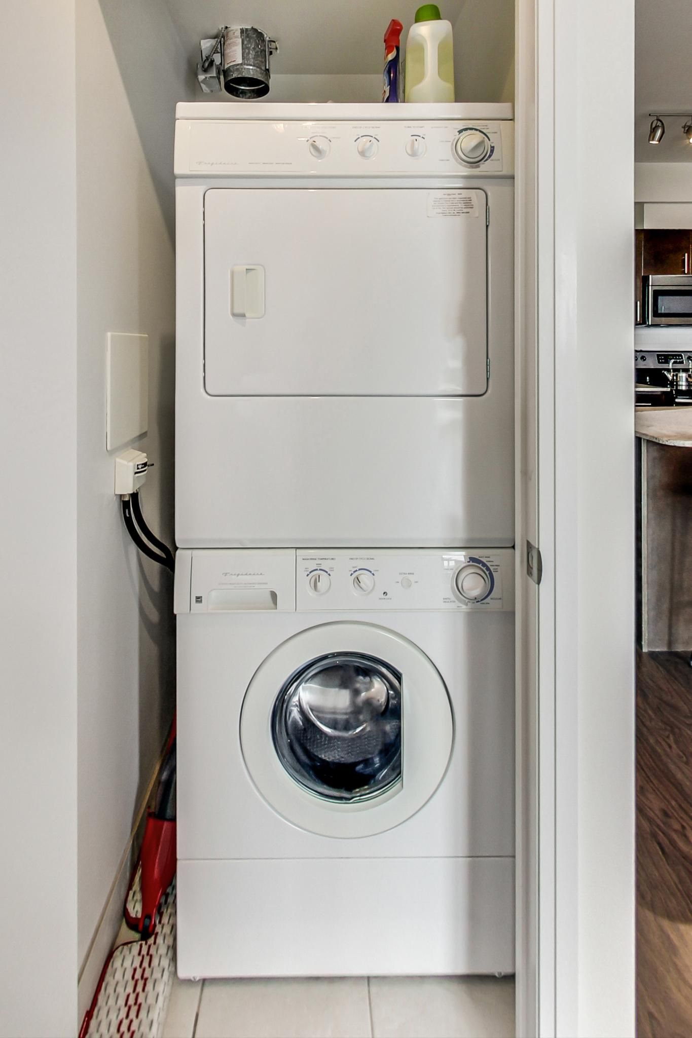 surround system. Comfortable mattress free fold out sofa. In suite stacked washer & dryer. Custom entry closet. Wonderful building