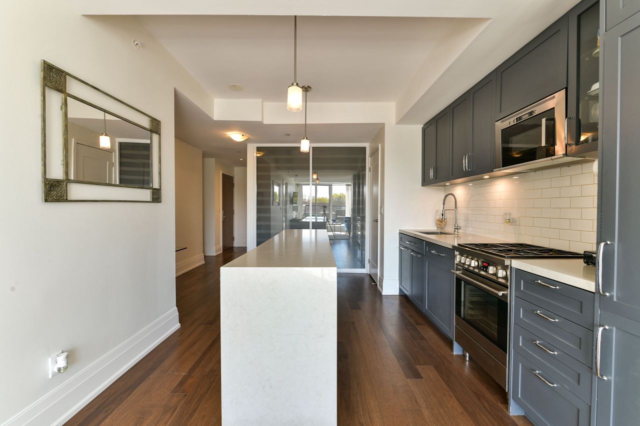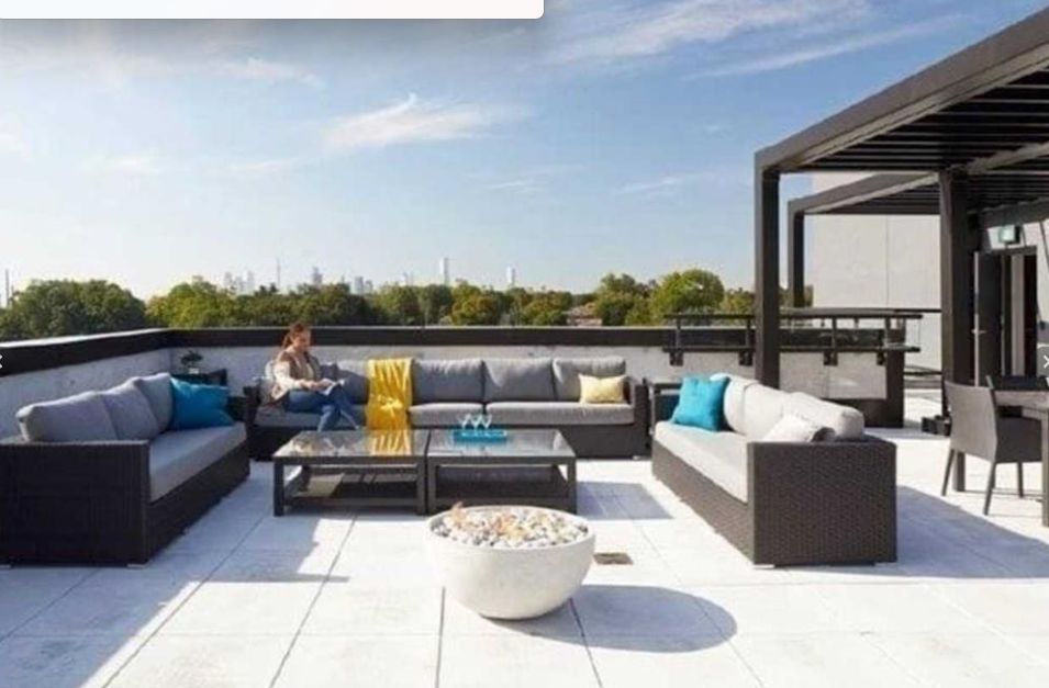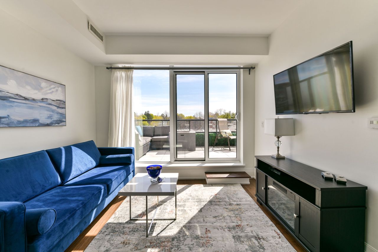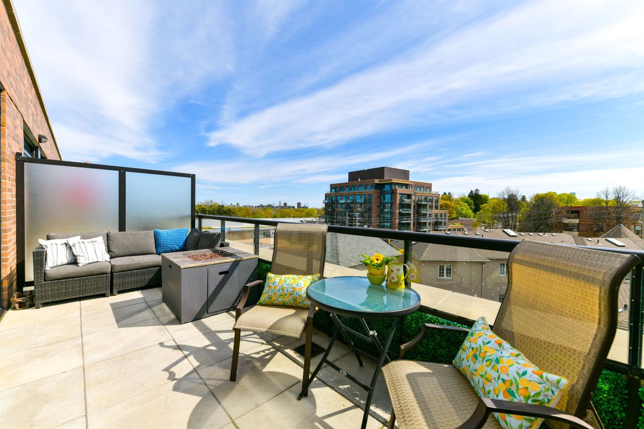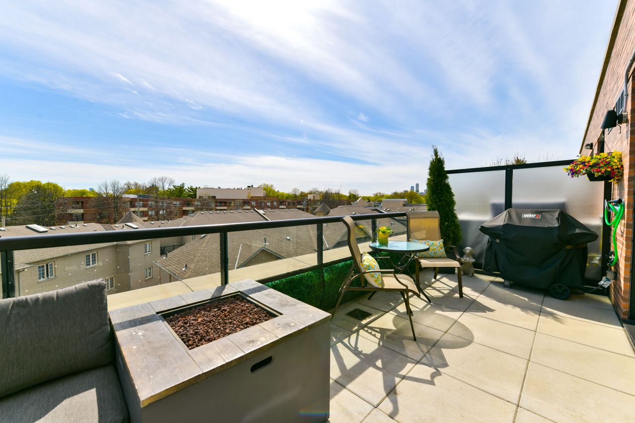 This Stunning, Bright 2 bedroom, 2 bathroom condo unit is unique with a Huge Terrace (171 SF) and an Unobstructed View towards the CN Tower. Engineered Hardwood floors, Granite Waterfall Counters and Centre Island. Unit has many upgrades including a Gas Stove, Water and Gas Hook-ups on the Terrace and Two Walkouts to the over-sized terrace. This Boutique Condo is equipped with a Rooftop Patio, Dog Spa, Guest Suite, Party Room, Gym and Concierge. Close to Excellent Schools, Several Grocery Stores, Shops and Restaurants.Parking and Locker. Possible Terrace Furniture included. Terrace furniture includes Weber Barbeque, Sectional Couch, Table and Chairs.