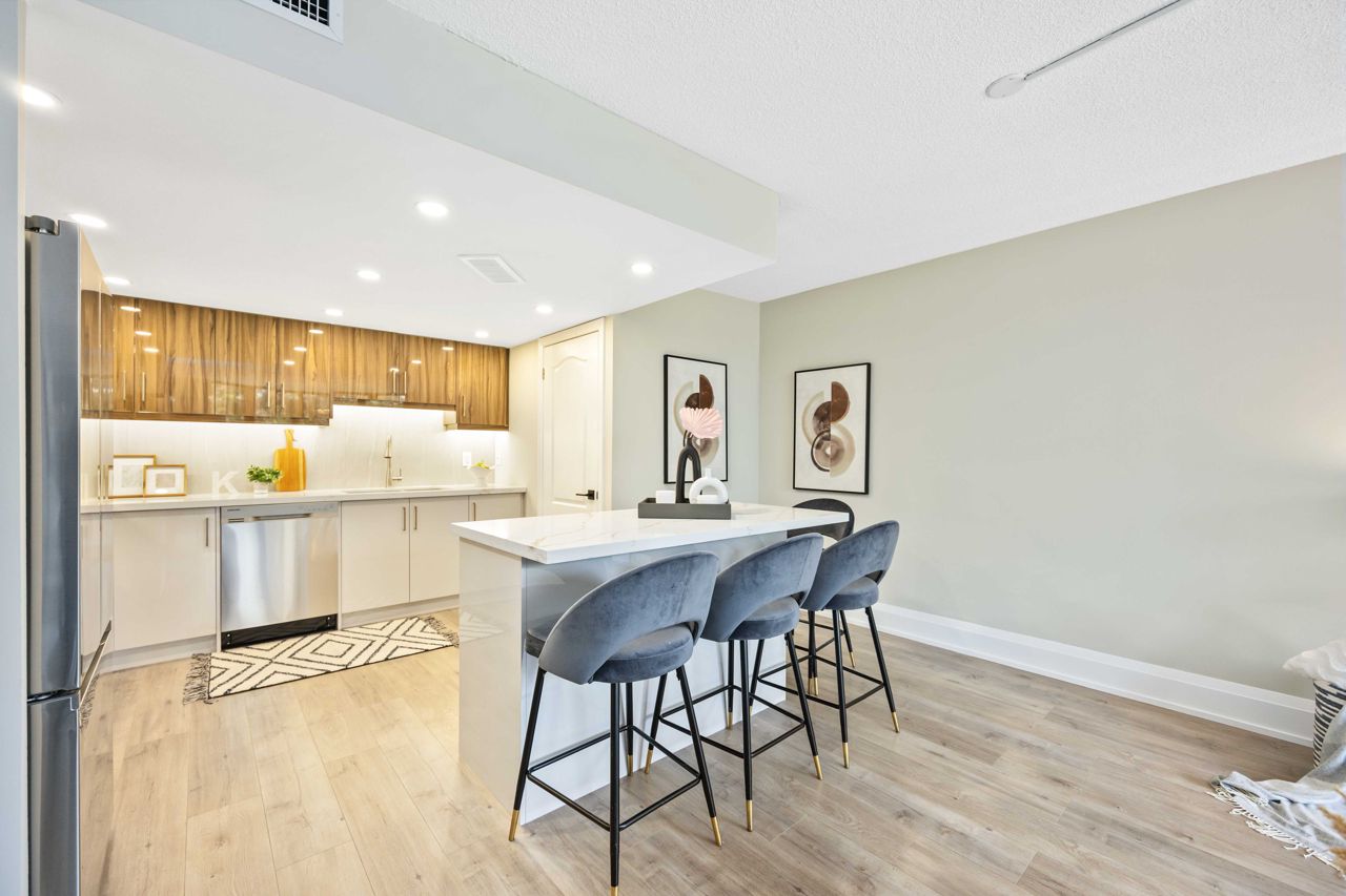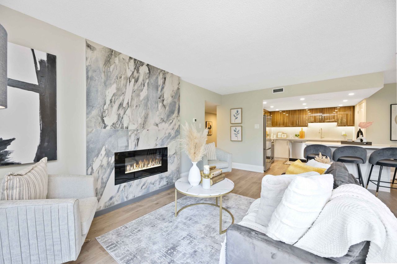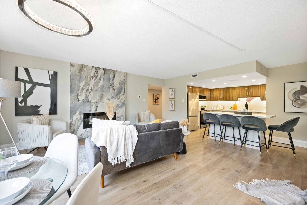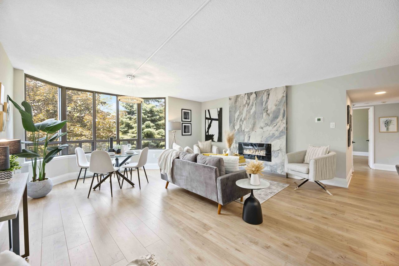 A true gem in the heart of The Don Mills Community & the sought- after Village Mews, This Large 1232 sf 2 bed 2 bath condo could be your luxurious new home & Oasis! This condo is renovated top to bottom, Inside and out, ready for your immediate enjoyment. Featuring a gorgeously remodelled open concept kitchen and breakfast bar, bright & spacious living & dining area with bay window & new fireplace, oversized primary suite w/huge walk-in closet, elegant vanity area & ensuite bath, brand new stainless steel appliances, wood floor, light fixtures and plumbing throughout, it is just steps from the excitement of Shops at Don Mills, as well as the tranquillity of parks and walking trails all at your finger tips! A must see!A meticulously maintained condo complex with a $5 Mil reserve fund. Beautifully manicured grounds, breathtaking gardens, fountains & courtyard. Rogers high speed internet and VIP television included in the maintenance fees.