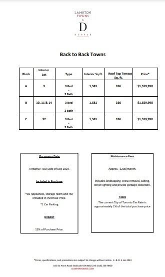 Welcome To Dunpar's Newest Pre-Construction Luxury Townhome Development, Lambton Towns-Nestled Between Bloor West Village And Lambton Woods. Steps From Shopping, Dining, Entertainment. 400 Sq Ft Rooftop Overlooks City. Occupancy Is Set For December 2024. 15% Deposit Required Within A Year. Assignment Is Offered For $5K. Dunpar Offering A Private Mortgage-No Qualification Needed! Terms: 3% Interest Rate With A 20% Down Payment Requirement For 3 Years Or Rates Drop Below 3%.All Stainless Steel Appliances, Undermount Kitchen Sink, 9.7 Ft Smooth Ceilings Throughout, Frameless Glass Shower Enclosure And Deep Soaker Tub In Ensuite. Rooftop Comes With Gas And Water Line With Pergola And Is Water-Pressure Treated.