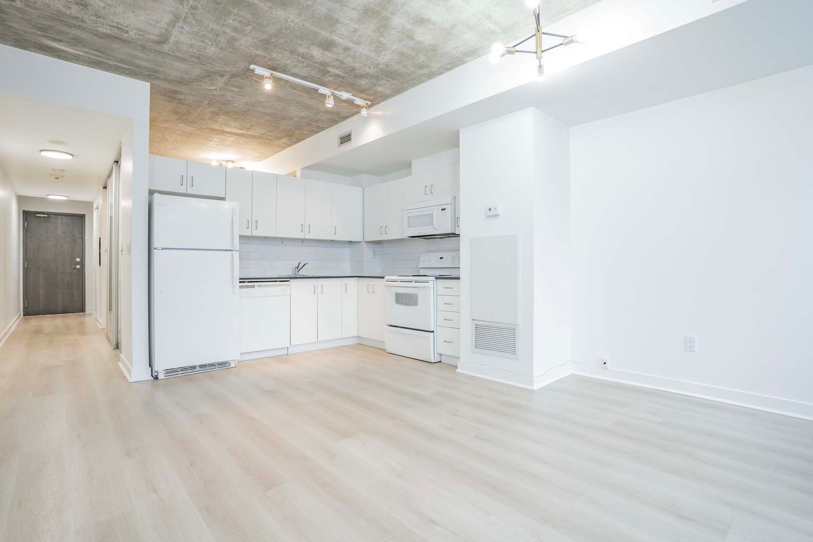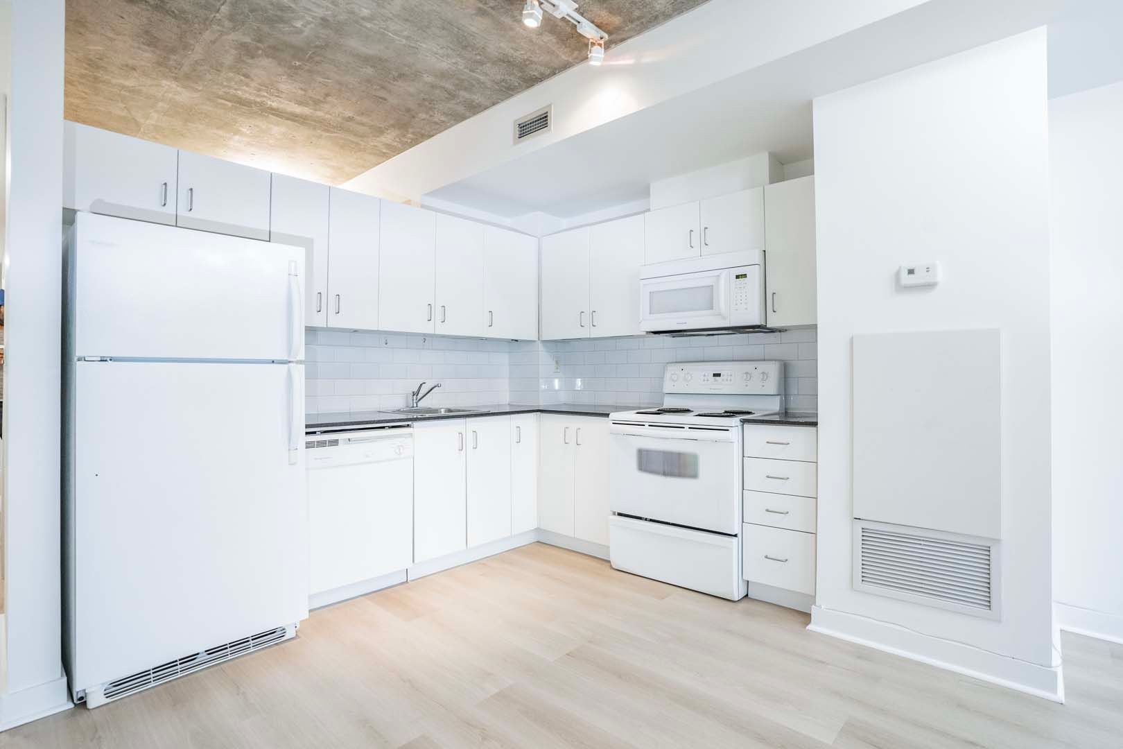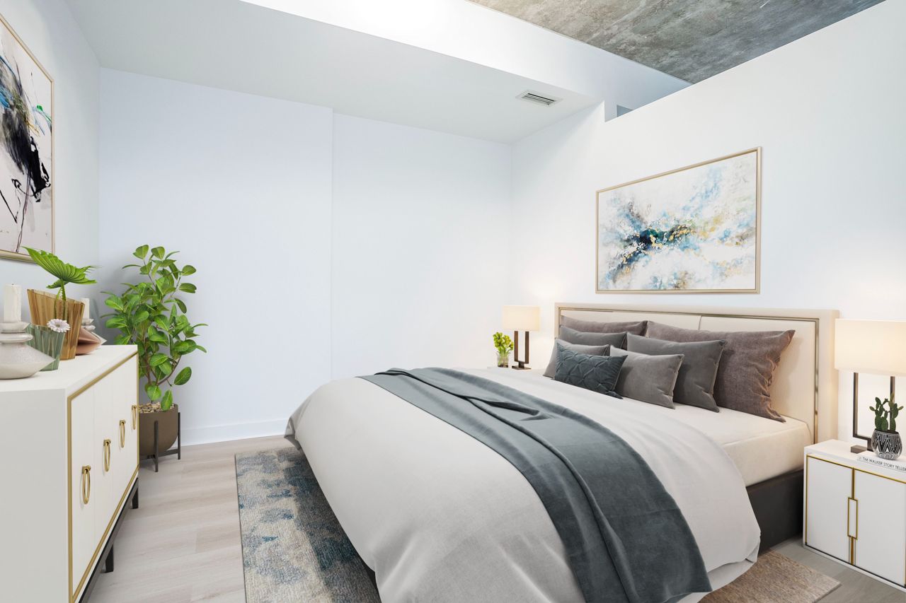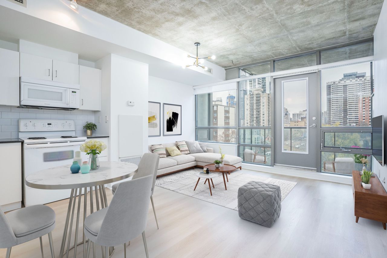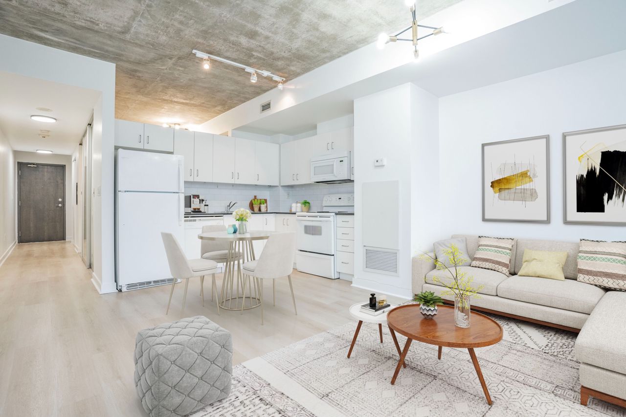 Experience the unique opportunity to reside in the seldom-available low rise tower of the Radio City complex. Comprising of only 8 floors in this tower, enjoy living in the sub penthouse suite. Industrial Charm: Revel in the allure of this exposed concrete loft, where rugged aesthetics meet modern living. Embrace this open concept unit with tones of natural light and unobstructive views. Tastefully renovated with new floors and fresh paint, yet prospective buyers have the opportunity to infuse their personal style and preferences into this space, adding a unique and personalized touch to make it truly their own. A must see. Photos are virtually staged. Offers anytime.Fridge, Stove, B/I Dishwasher, Microwave W/Hood Fan, Stacked Washer & Dryer, All Electrical Light Fixtures, All Window Coverings. Incredible Amenities Including Gym, Sauna, Party Room, Media Room, Games Room, Guest Suites, 24-Hr Concierge!