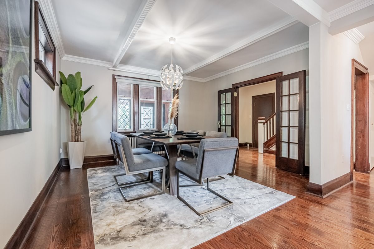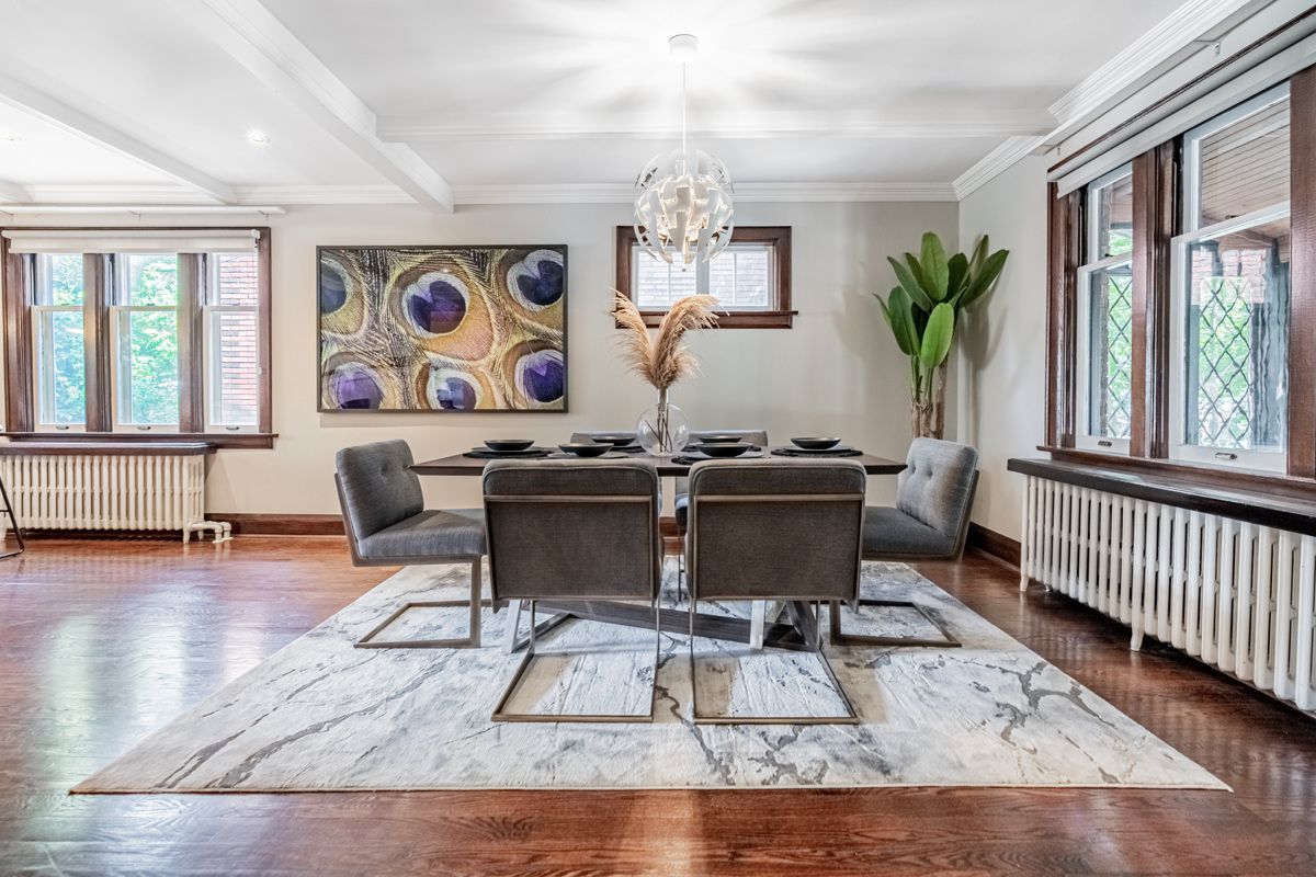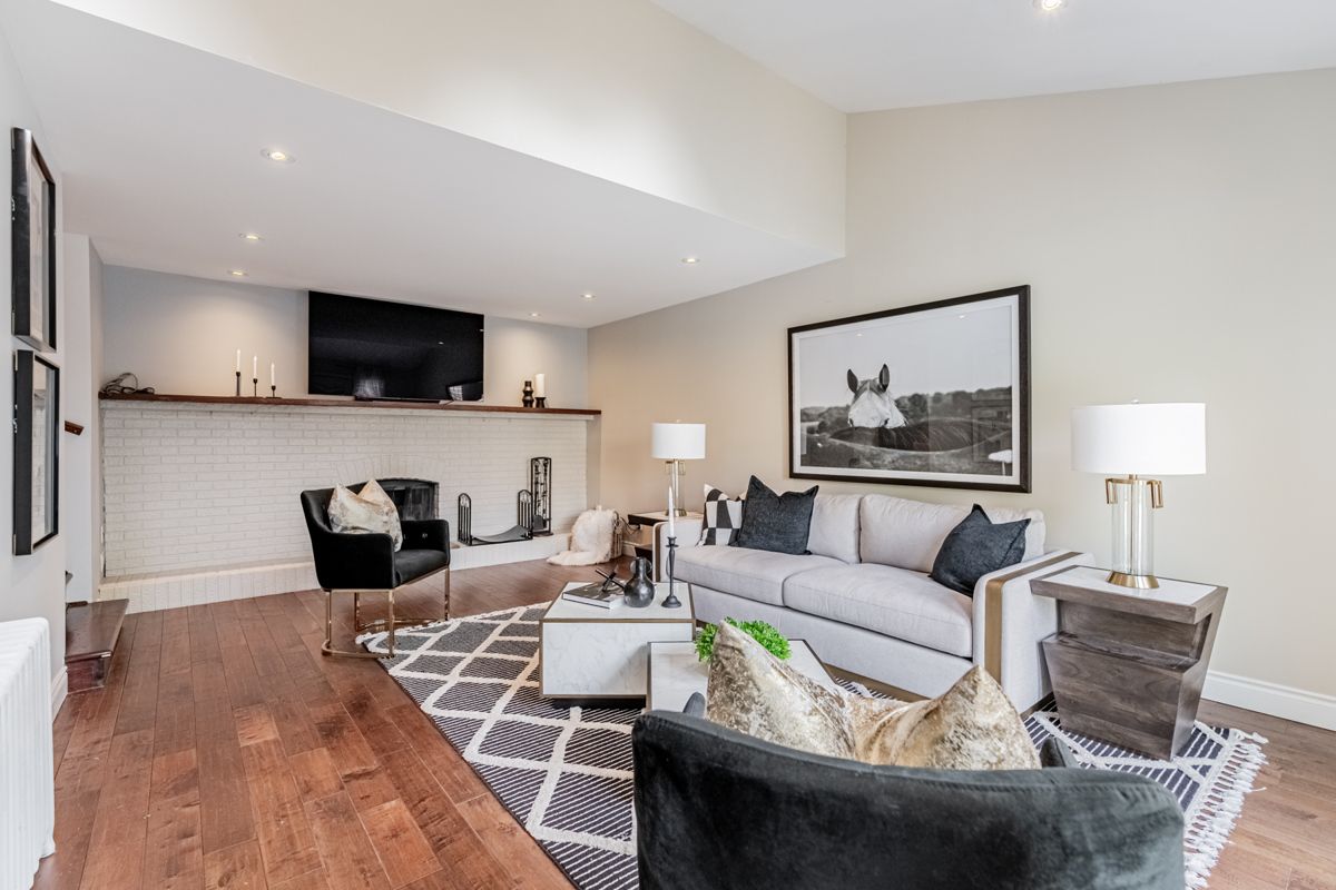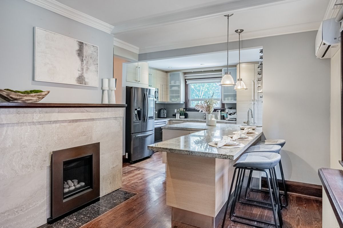 dining area, underlined by a modern freplace. Quality hardwood fooring brings timeless elegance to each space.. Still on the main level, a