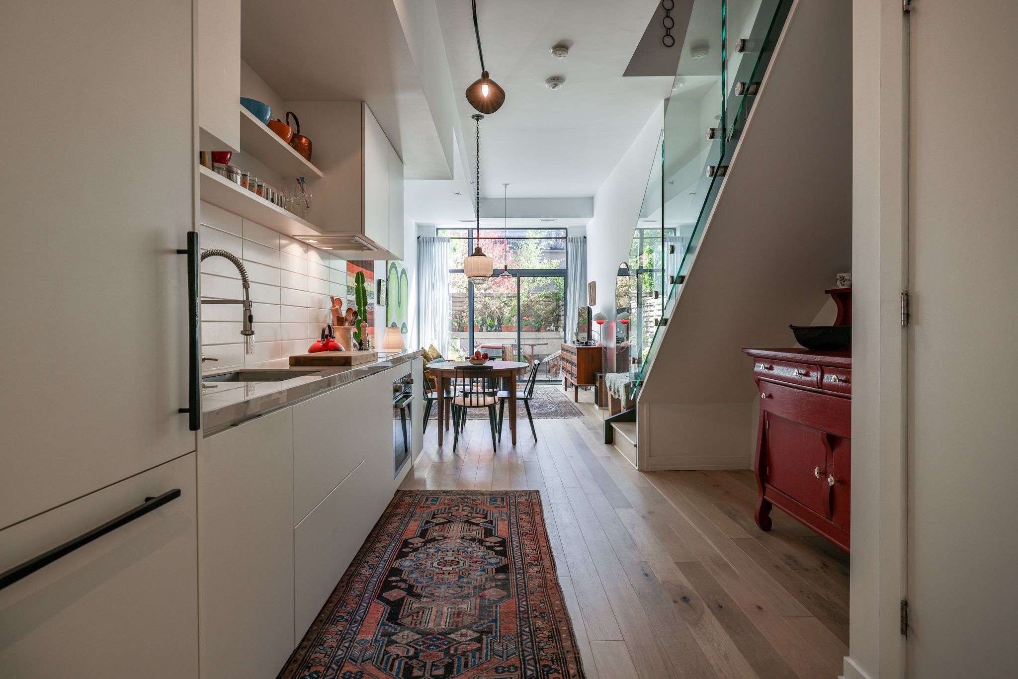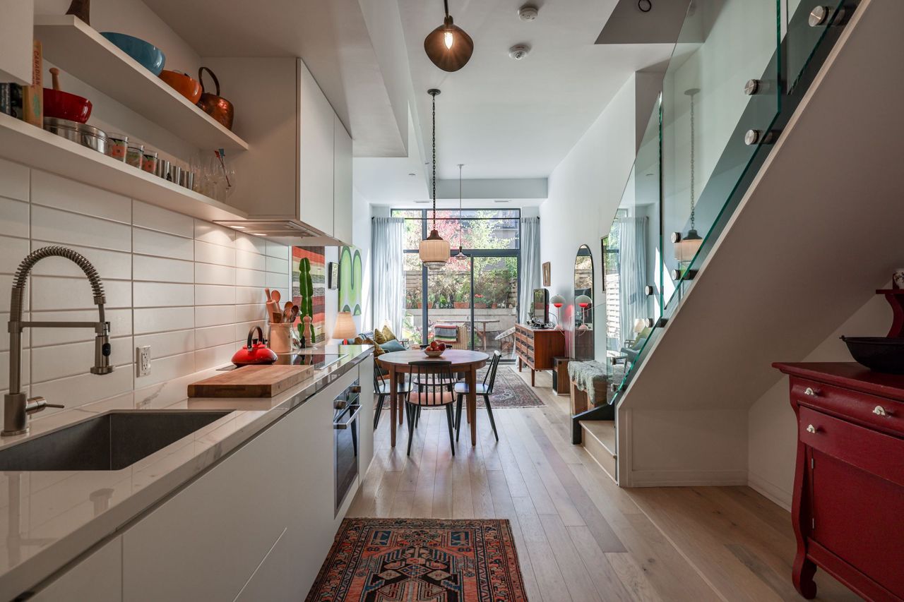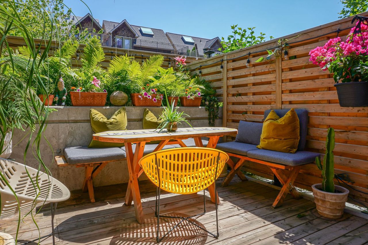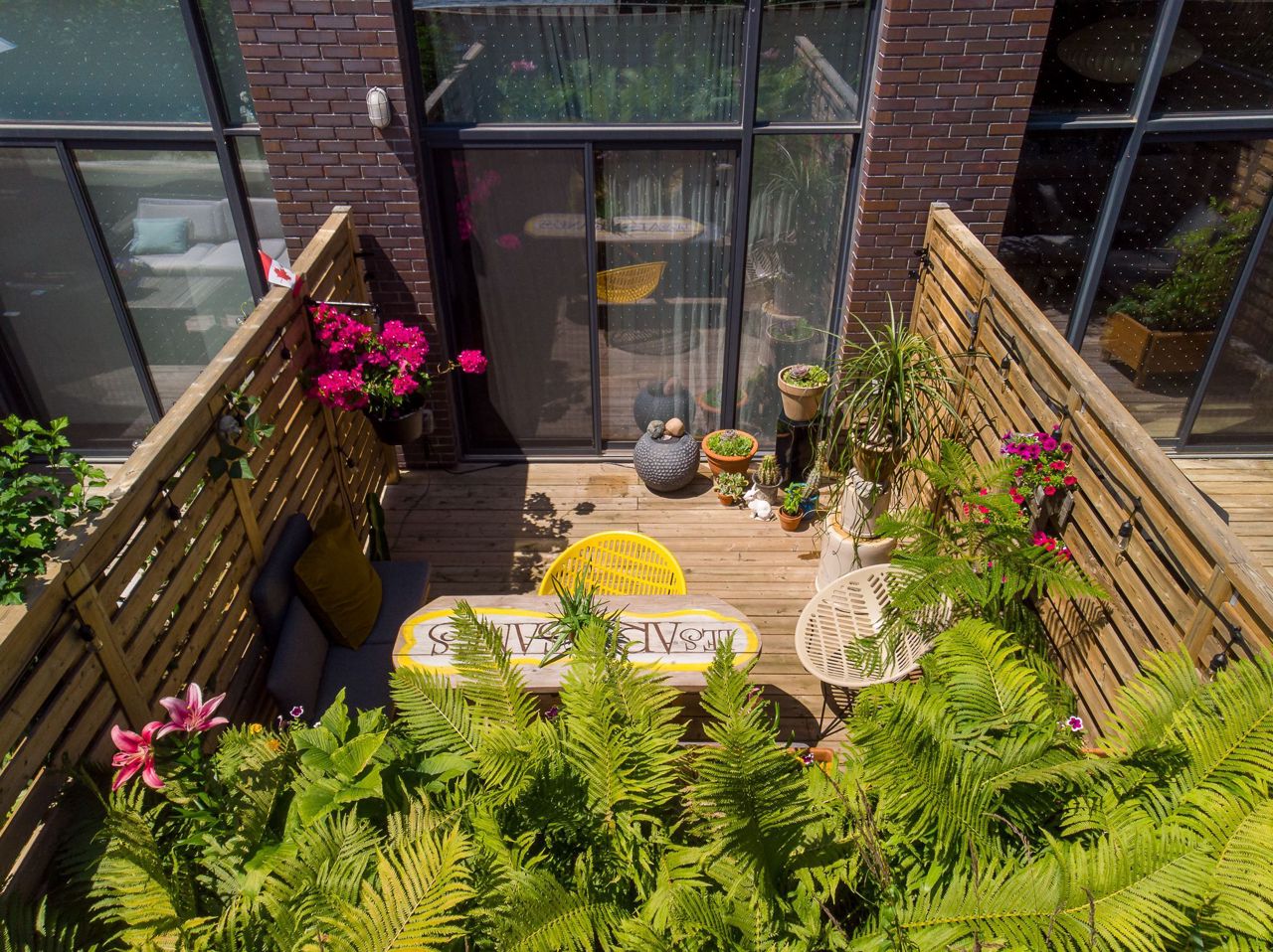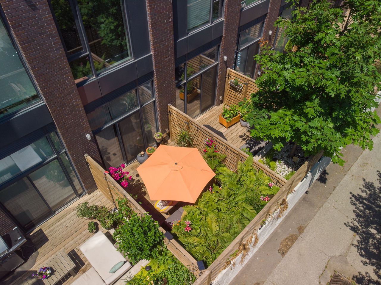 A modern, open concept, townhome style space with towering ceilings. Contemporary white oak & glass staircase. Main floor powder room. Gourmet inspired galley kitchen with classic white cabinetry, integrated appliances, quartz counters & stylish open shelves. Clever storage thru-out. Fabulous, 841 sqft + 172 sqft patio nestled within a tiered, lush garden. A secluded outdoor private oasis drenched in sunlight offers an urban retreat. East facing Principal bedroom overlooking the garden below is a restful retreat with white oak floors & two double closets. Spa inspired spacious 4pc washroom with soaker tub. Second floor den offers lots of versatility for home office, guest/second bedroom, or calm & quiet meditation space. Convenient second floor laundry. Garage parking included. This home has been meticulously maintained by the original owner & never used as a rental property.Steps to Sorauren Park & Fieldhouse, Farmers Market, Roncesvalles Restaurants & Local Shops. Quick Hwy Access. Easy TTC: 501, 504, 505, 506 Streetcars + Dundas W Subway (Line 2) & UP Express.