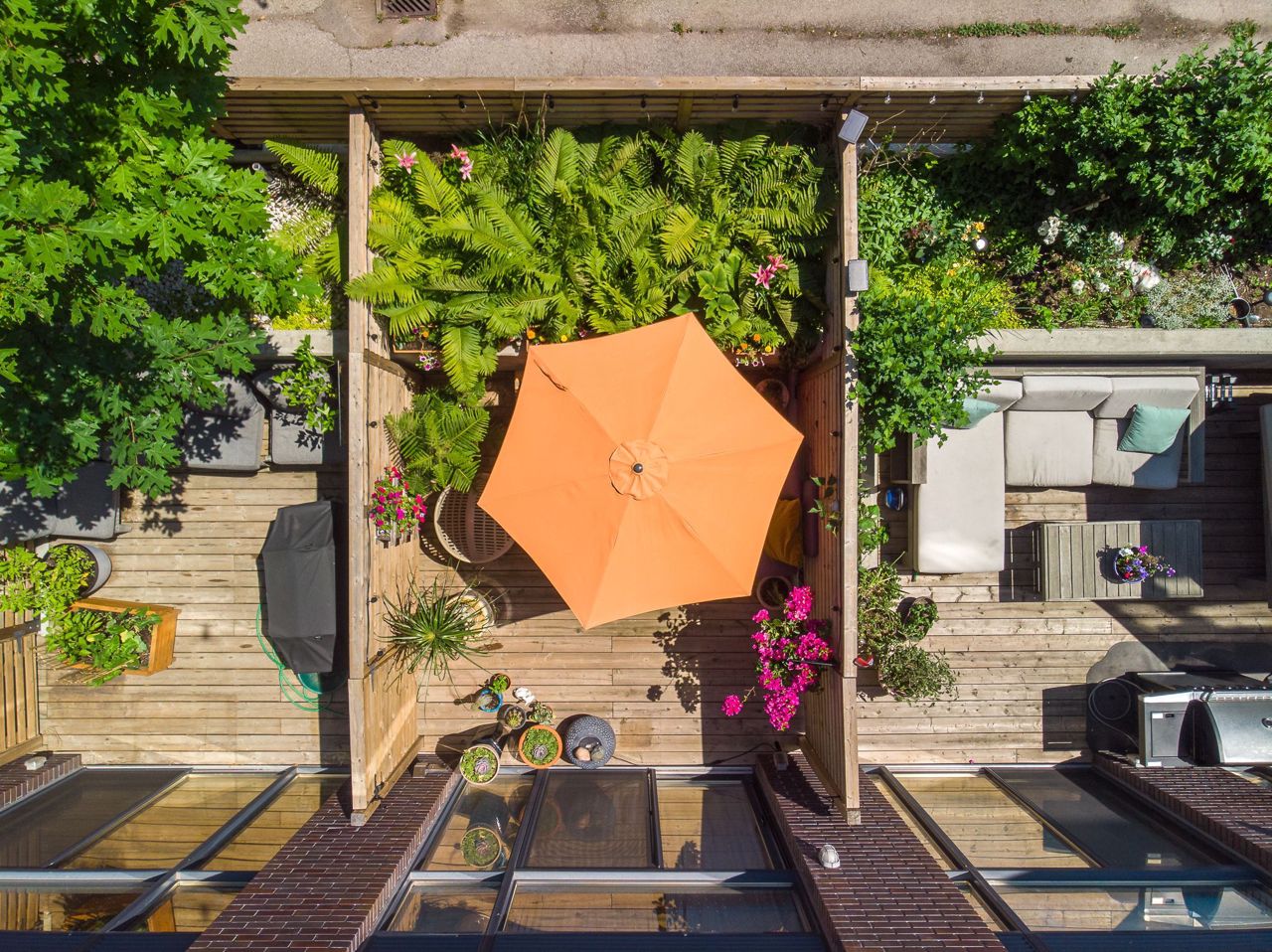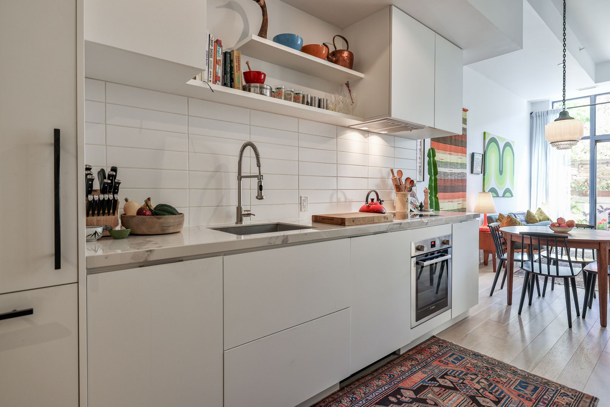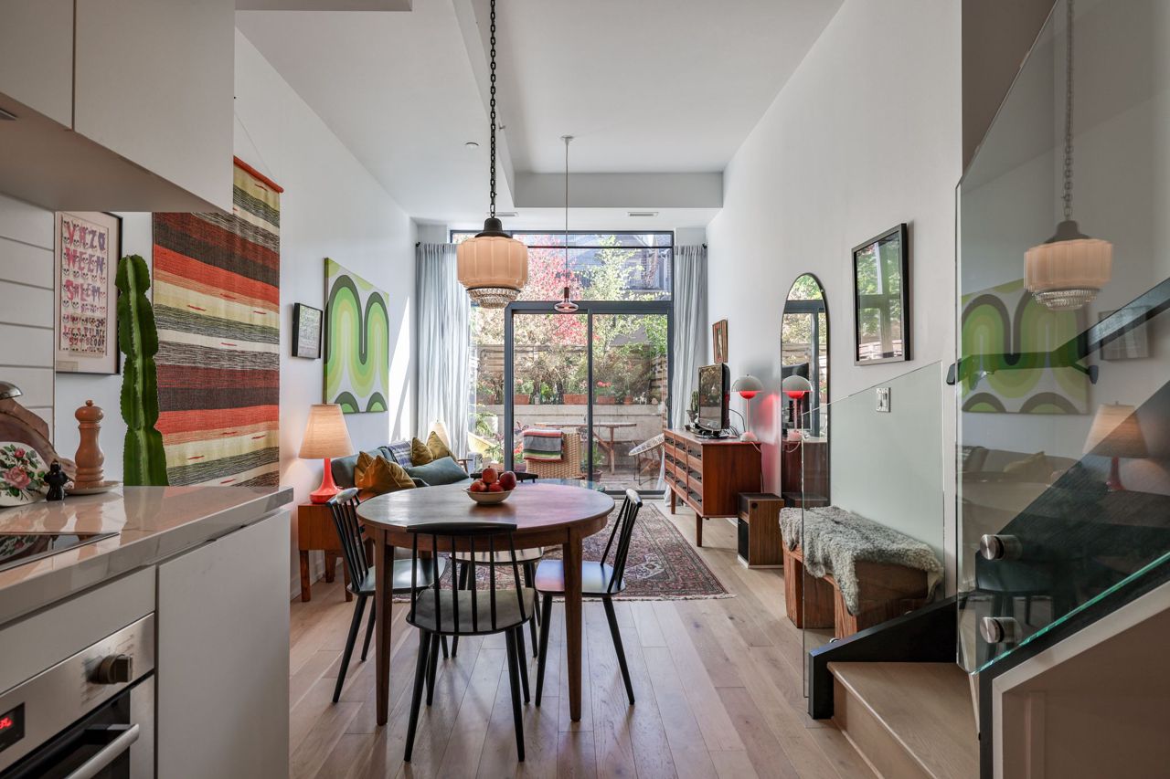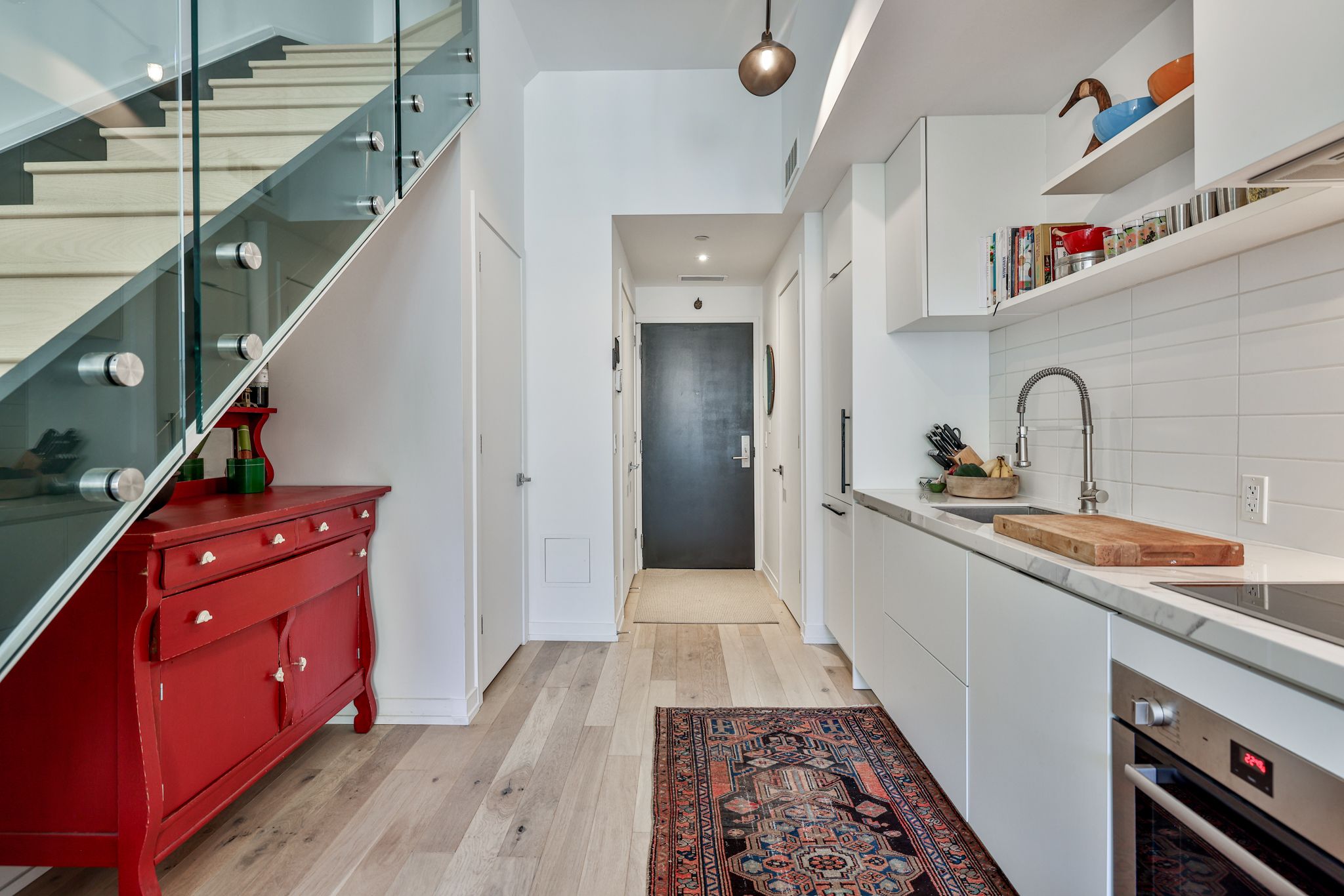 A modern, open concept, townhome style space with towering ceilings. Contemporary white oak & glass staircase. Main floor powder room. Gourmet inspired galley kitchen with classic white cabinetry, integrated appliances, quartz counters & stylish open shelves. Clever storage thru-out. Fabulous, 841 sqft + 172 sqft patio nestled within a tiered, lush garden. A secluded outdoor private oasis drenched in sunlight offers an urban retreat. East facing Principal bedroom overlooking the garden below is a restful retreat with white oak floors & two double closets. Spa inspired spacious 4pc washroom with soaker tub. Second floor den offers lots of versatility for home office, guest/second bedroom, or calm & quiet meditation space. Convenient second floor laundry. Garage parking included. This home has been meticulously maintained by the original owner & never used as a rental property.Steps to Sorauren Park & Fieldhouse, Farmers Market, Roncesvalles Restaurants & Local Shops. Quick Hwy Access. Easy TTC: 501, 504, 505, 506 Streetcars + Dundas W Subway (Line 2) & UP Express.