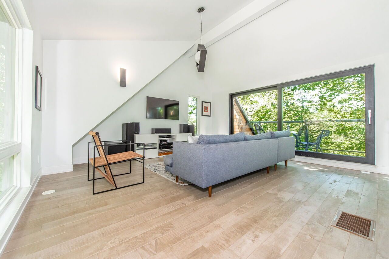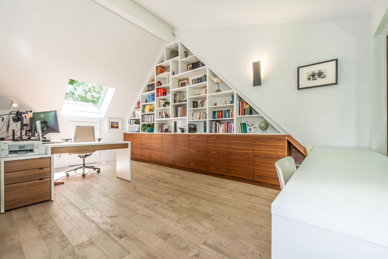 Hardwood Floor B/I Bookcase Vaulted Ceiling