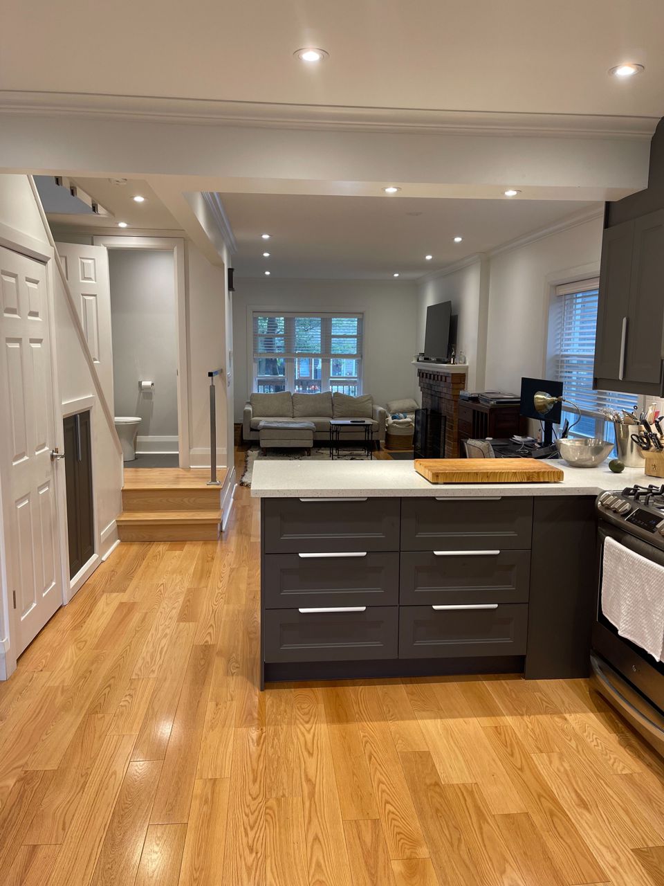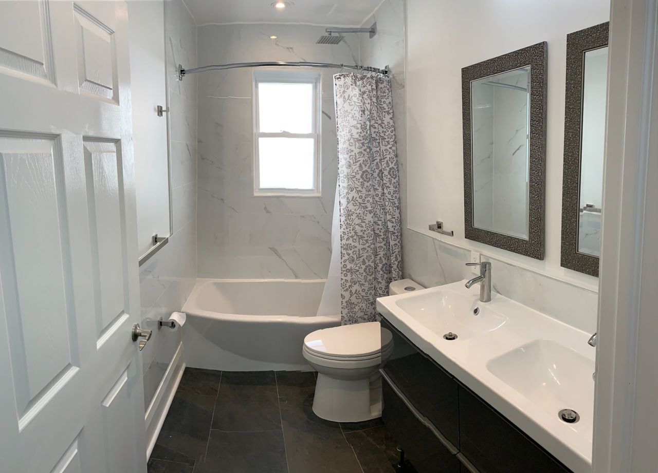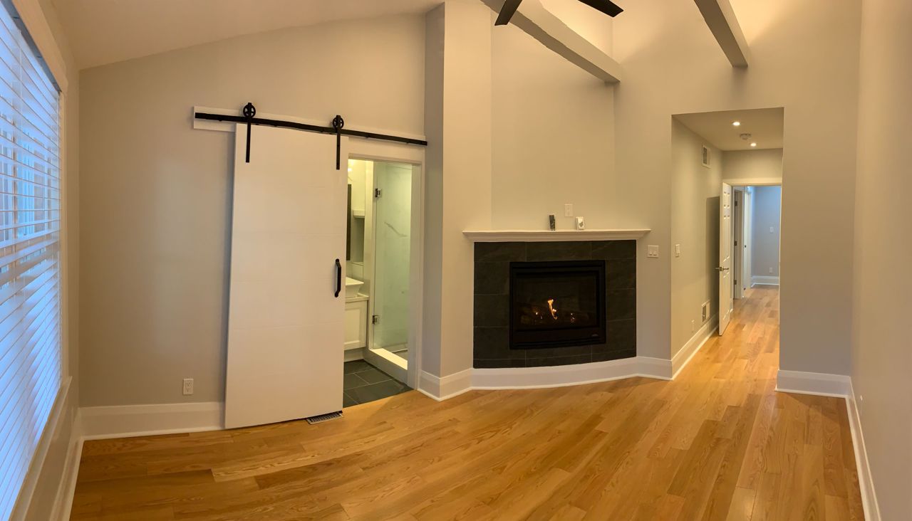 Renovations included all new oak hardwood floors, electrical, sound-proofing added along the common wall, between all rooms and floors, solid doors on all rooms, new roof, new windows, skylight in main hall, house fully spray foamed for high energy efficiency, new furnace and central air conditioning, large brand-new kitchen with high-end stainless-steel appliances, heated floors in bathrooms.