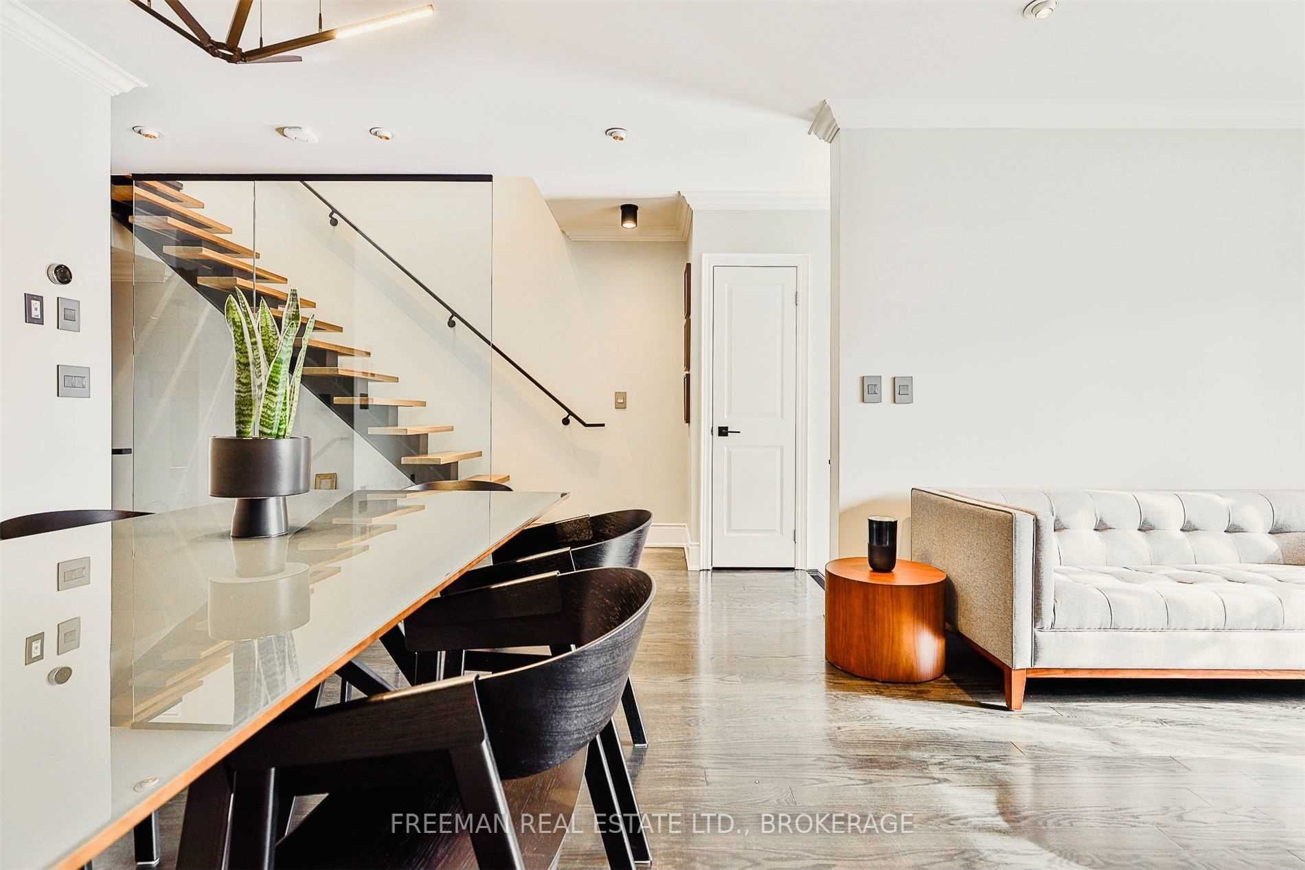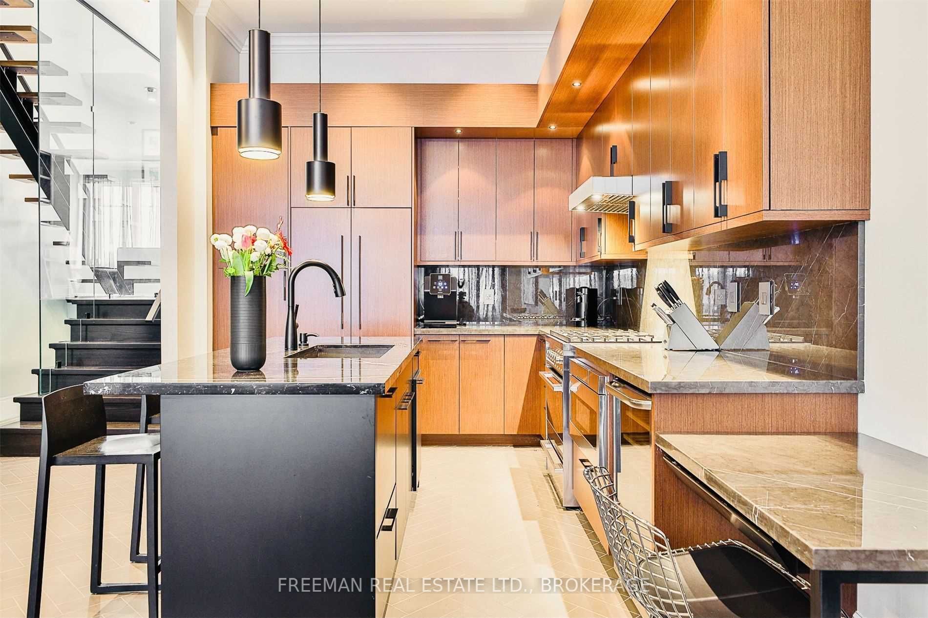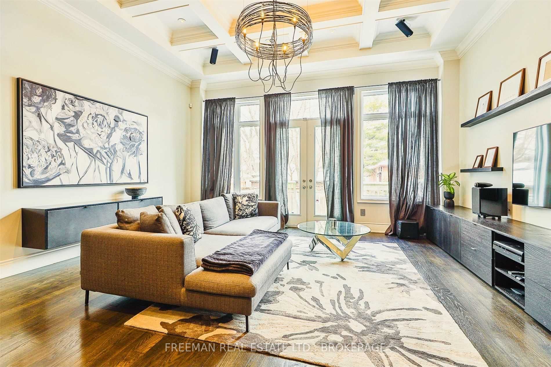 Price Reduced. An exceptional deal for Gorgeous modern masterpiece, includes furniture and art!! Dark oak hardwood floors and high-end marble surfaces throughout. Modern styling features coffered soaring ceilings, stunning architectural floating solid walnut staircase with glass surround, epicurean built-in kitchen appliances & wine fridge, two walkouts to backyard, gas fireplace, audiophile stereo system, heated bathroom floor in spa-like ensuite bathroom.