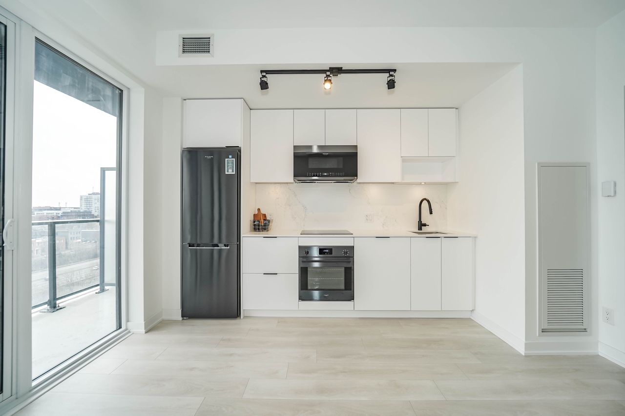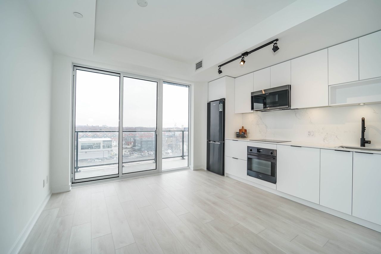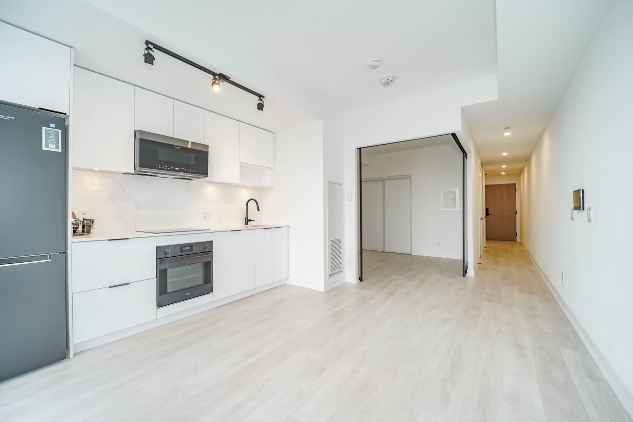 Brand New, Never Lived in Luxury Condo Downtown. Unobstructed North View of the City. Modern 1 Bed + Den, (Perfect for Office Space) 9F Ceilings, Open Concept Kitchen W/ Stainless Steel Appliances, Floor-To-Ceiling Windows Filled Tons Of Natural Light In Living/Dining/Kitchen & the Bedroom. High-tech Home Controls. Luxury Amenities: Elegant Lobby, 24H Concierge, Exercise + Yoga Rooms, Outdoor "Spa" Pool + Large Rooftop Oasis With Bbq Area, Dog Spa, Media/Meeting Lounge. Convenient Commuting To Shopping, Cafes, Restaurants, Entertainment, Right next to the TTC and DVP, Minutes Away from Toronto's historic Distillery District and the Downtown core.Built-In, Stainless Steel appliances: Fridge, Oven, Cooktop, Microwave hood fan, Dishwasher. Washer, Dryer, All Existing Light Fixtures.