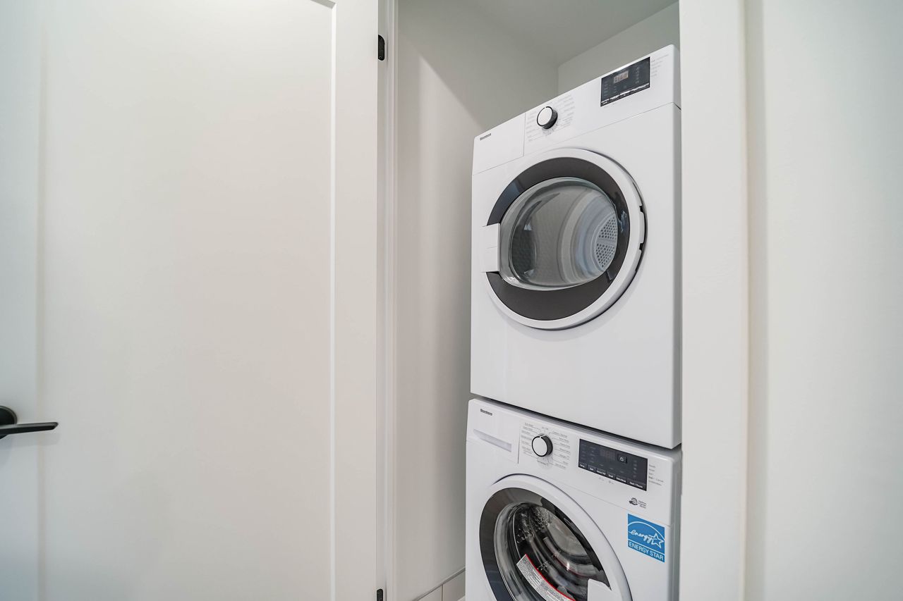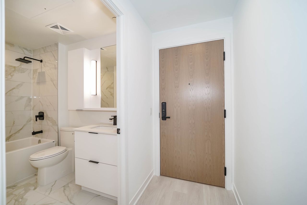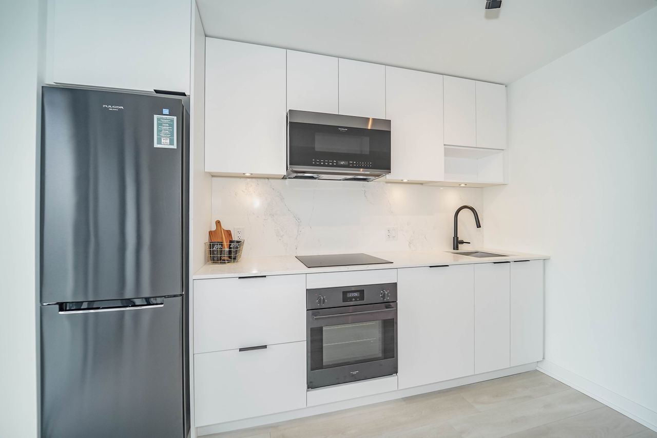Brand New, Never Lived in Luxury Condo Downtown. Unobstructed North View of the City. Modern 1 Bed + Den, (Perfect for Office Space) 9F Ceilings, Open Concept Kitchen W/ Stainless Steel Appliances, Floor-To-Ceiling Windows Filled Tons Of Natural Light In Living/Dining/Kitchen & the Bedroom. High-tech Home Controls. Luxury Amenities: Elegant Lobby, 24H Concierge, Exercise + Yoga Rooms, Outdoor "Spa" Pool + Large Rooftop Oasis With Bbq Area, Dog Spa, Media/Meeting Lounge. Convenient Commuting To Shopping, Cafes, Restaurants, Entertainment, Right next to the TTC and DVP, Minutes Away from Toronto's historic Distillery District and the Downtown core.Built-In, Stainless Steel appliances: Fridge, Oven, Cooktop, Microwave hood fan, Dishwasher. Washer, Dryer, All Existing Light Fixtures.