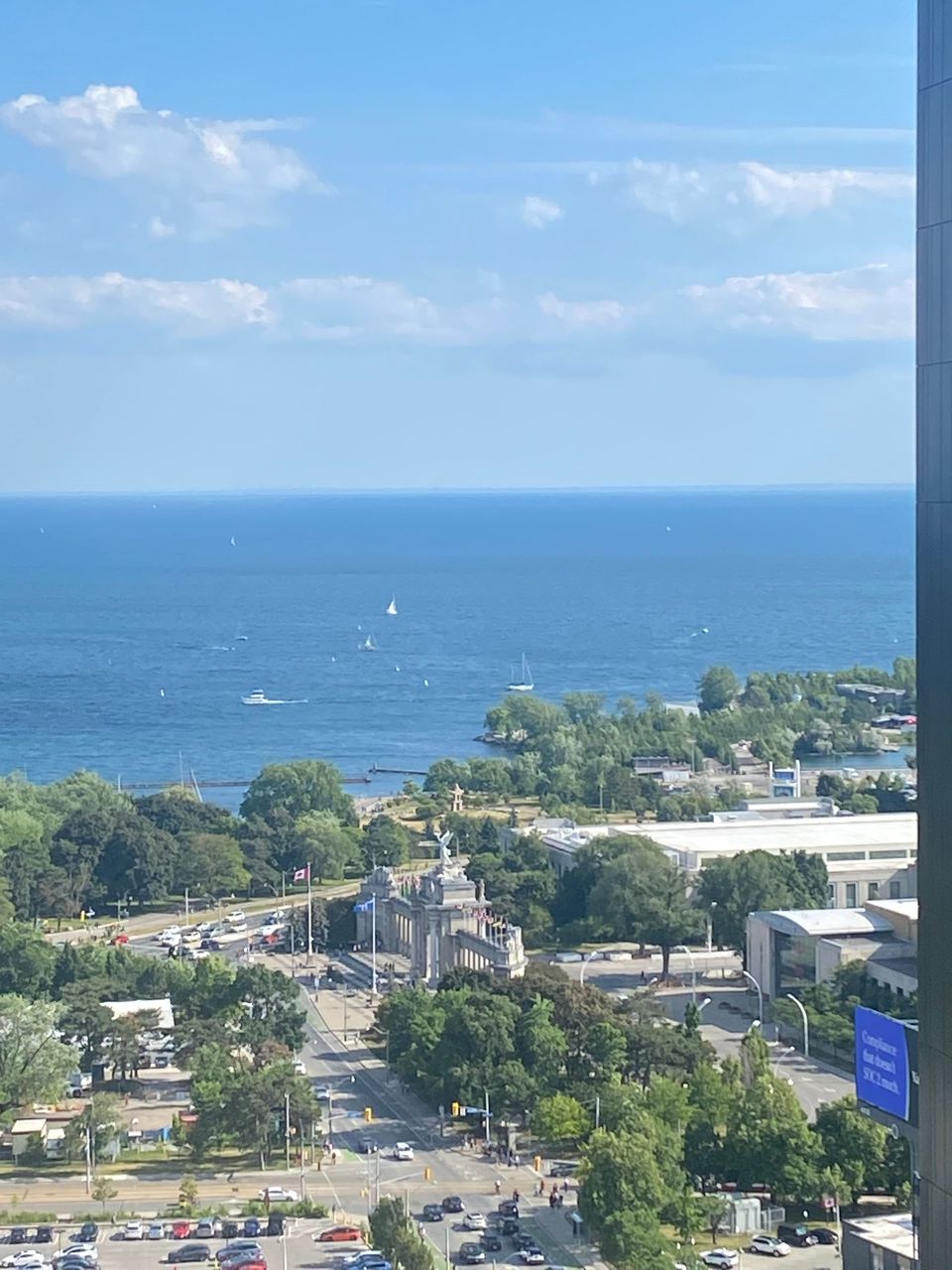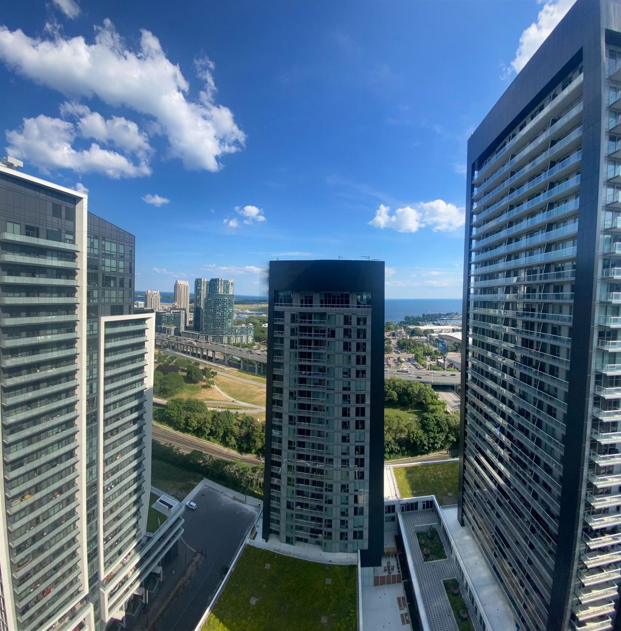 WATER AND CITY VIEWS, This beautiful liberty village Corner unit with South West exposure boasts One Bdrm+Den and 1 Full Bath with 2 Large Balconies and have a beautiful Water and City Views. Spacious Layout with lots of upgrades, Nine foot ceilings, Laminate Floors through out , Upgraded Quartz Countertops in Bathroom and In the Modern Kitchen with Built In Stainless Steel Appliances, 24/7 Conceirge, Outdoor pool, Gym, party and Games Room, Theatre Room