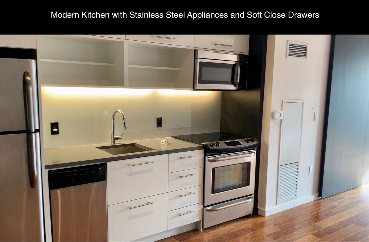 现代当代Loft风格公寓!获奖建筑!River City公寓!9英尺裸露混凝土天花板!约800平方英尺宽敞的1卧室+大储藏间!包含停车位、储物柜和自行车架!全区域木地板!靠近King路有轨电车,靠近Leslieville,Cabbagetown,酿酒区, Corktown Commons Park(18英亩)和市中心!