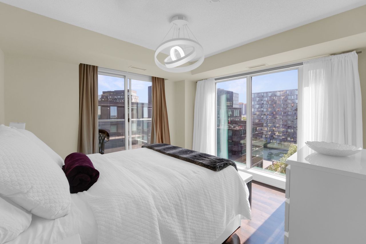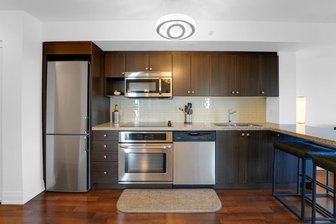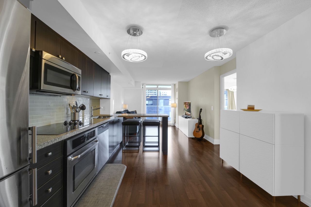 Experience the allure of Station Condos with this exquisite 2-bed, 2-bath corner unit flooded with natural light and boasting sought-after south-west exposure. This sun-filled residence features a spacious layout with floor-to-ceiling windows on two sides, complemented by a large balcony offering expansive views.The kitchen is equipped with quartz countertops, a breakfast bar, and stainless steel appliances, seamlessly blending into the dining and living areas for both comfort and practicality. The primary bedroom is generously sized, accommodating furniture or work-from-home needs, and includes a sizable closet, balcony access, and a private ensuite with a large shower and rare floor-to-ceiling window.The second bedroom offers ample closet space and bright windows, while a spacious foyer provides additional storage and includes in-unit laundry facilities within a large double closet. Premium laminate flooring spans throughout the unit, enhancing its contemporary appeal.Residents of Station Condos enjoy peace of mind with a 24-hour concierge and access to resort-style amenities, including an indoor pool, sauna, gym, meeting room, party room, and a rooftop deck with BBQs - an ideal environment for relaxation and entertaining.Perfectly situated just steps from Wilson subway station, "The Station Condos" provide exceptional urban accessibility. Commuters will appreciate the convenience of nearby Hwy 401 & Allen Rd. Plus, enjoy proximity to Yorkdale Mall, Costco, Home Depot, Best Buy, and a variety of dining options, ensuring a lifestyle of convenience and luxury.