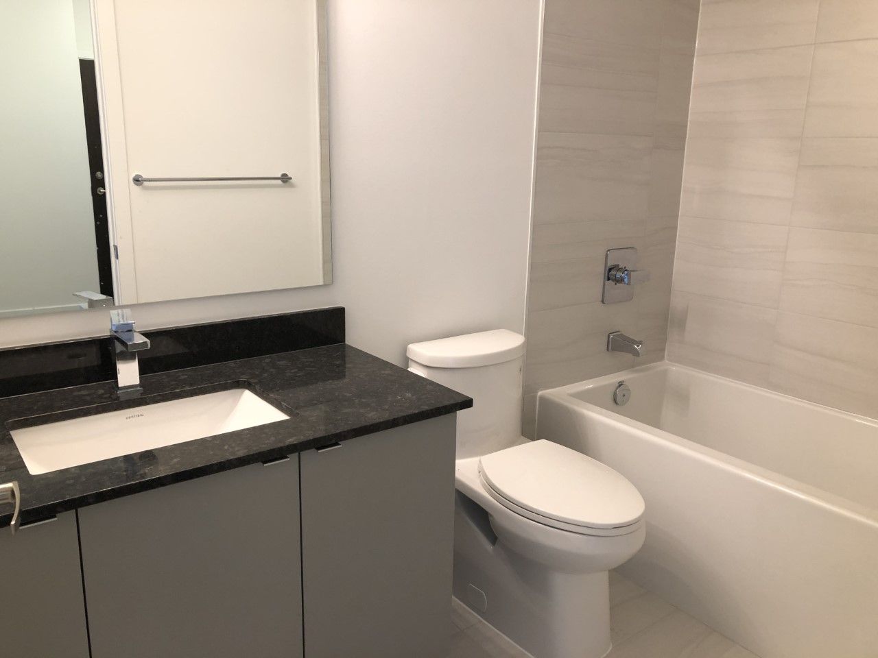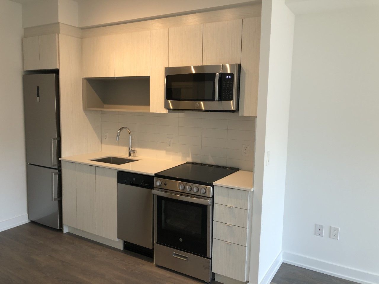 Almost 2 years new building - Platform Condos * 9Ft Ceilings, Laminate Flooring Thru-Out, Quartz Countertop, Modern Kitchen With Stainless Steel Appliances. Great Building Amenities Such As Games Room, Gym, Party/Meeting Room, Rooftop Deck/Garden; Steps To The Ttc(Greenwood Station), National Grocers, Banks & Abundance Of Restaurants.Stainless Steel Appliance: Dishwasher, Fridge, Microwave And Stove Top Oven. Washer & Dryer, All Elfs Included, Window Covers.