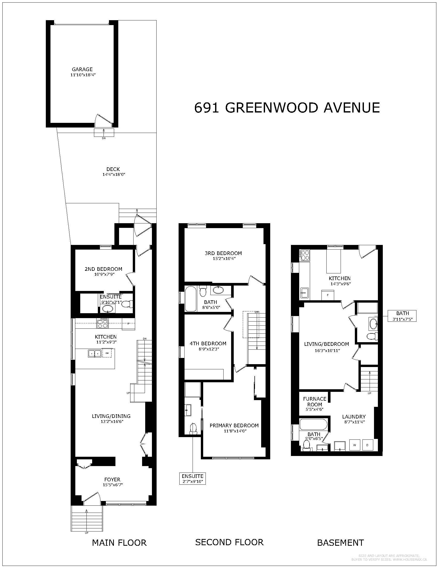 This one ticks all the boxes. Large solid brick semi (see floorplans attached). Extensively renovated to create light-filled flexible contemporary living spaces. Generous modern kitchen with double-size island granite counter breakfast bar. 4 large bedrooms (one on main floor that could be used as a home office). 5 washrooms. Mudroom connects to a private fully enclosed deck. 1 Bed basement apartment, high ceilings, sep entrance, 2 door exit. Oversized detached garage off laneway, mutual shared driveway parking at the front with the friendly neighbour. Located on a quiet treed section of Greenwood Ave, within a 30kmph speed limit. Just a few steps north of the vibrant Danforth and a 3 minute walk to Greenwood station. Excellent Schools, Daycare, French immersion, and Parks make for an unbeatable neighbourhood. A home big enough for an expending family or an easy rental with an estimated gross income of $6000 monthly or rent basement separately. A great turnkey hassle-free investment.Extensively renovated both mechanically and cosmetically with high quality workmanship between 2012-2014. Potential for future laneway house/garden suite/office/studio.