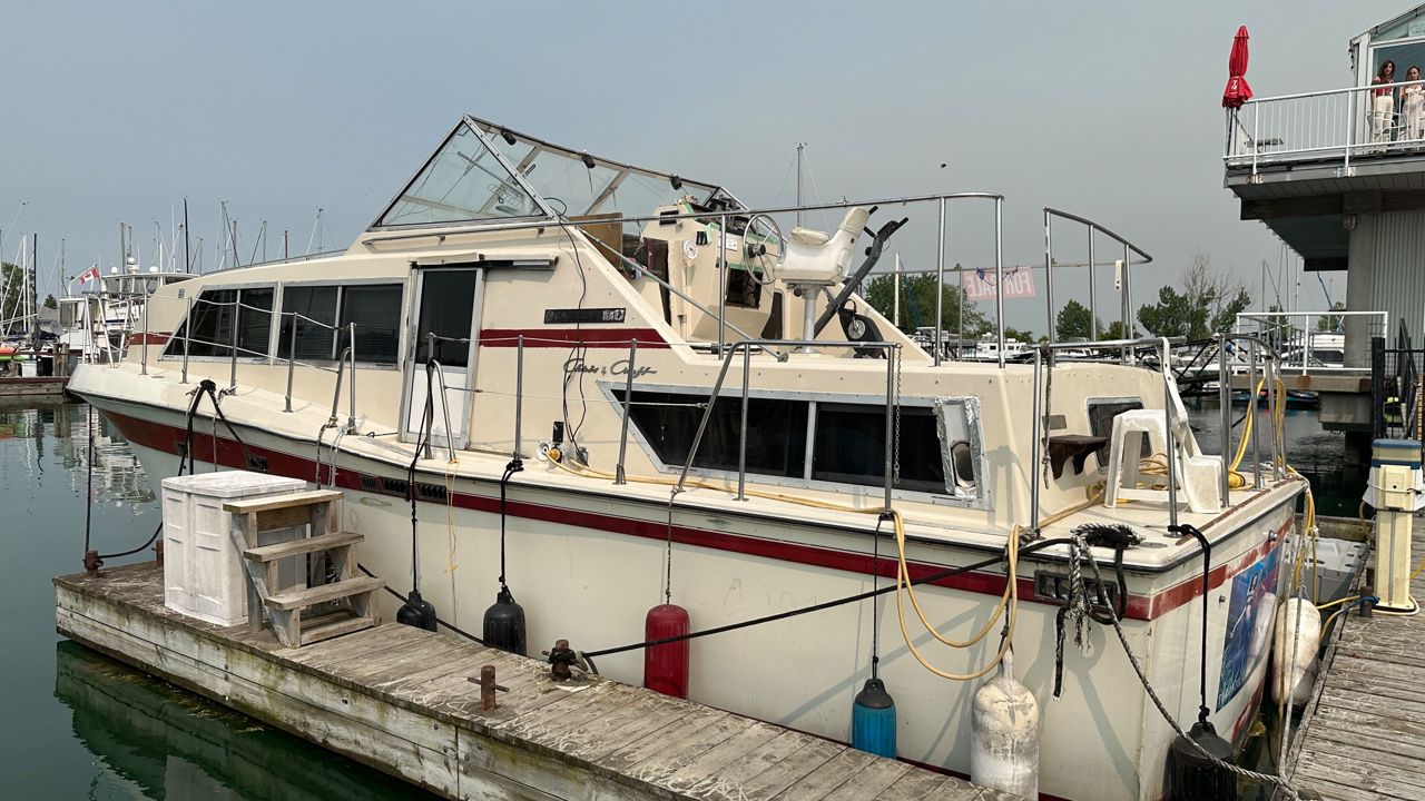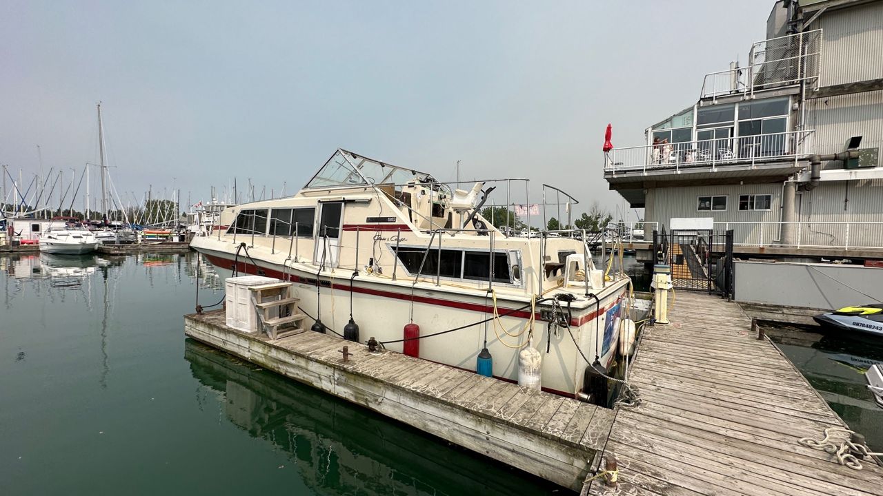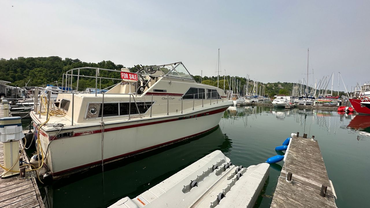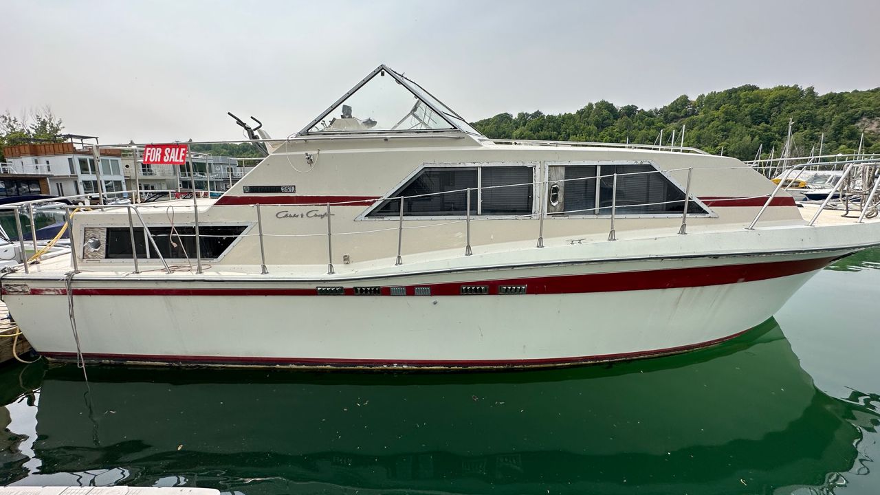 38 Foot, 1983 Chris-Craft 381 Catalina, Enjoy year round living, with views of the water and the bluffs, spacious bedroom with bathroom in front,mid deck has your living, dining and kitchen area, and the back offers another space that can be converted into another bedroom. Approximately 532 square feet of living space