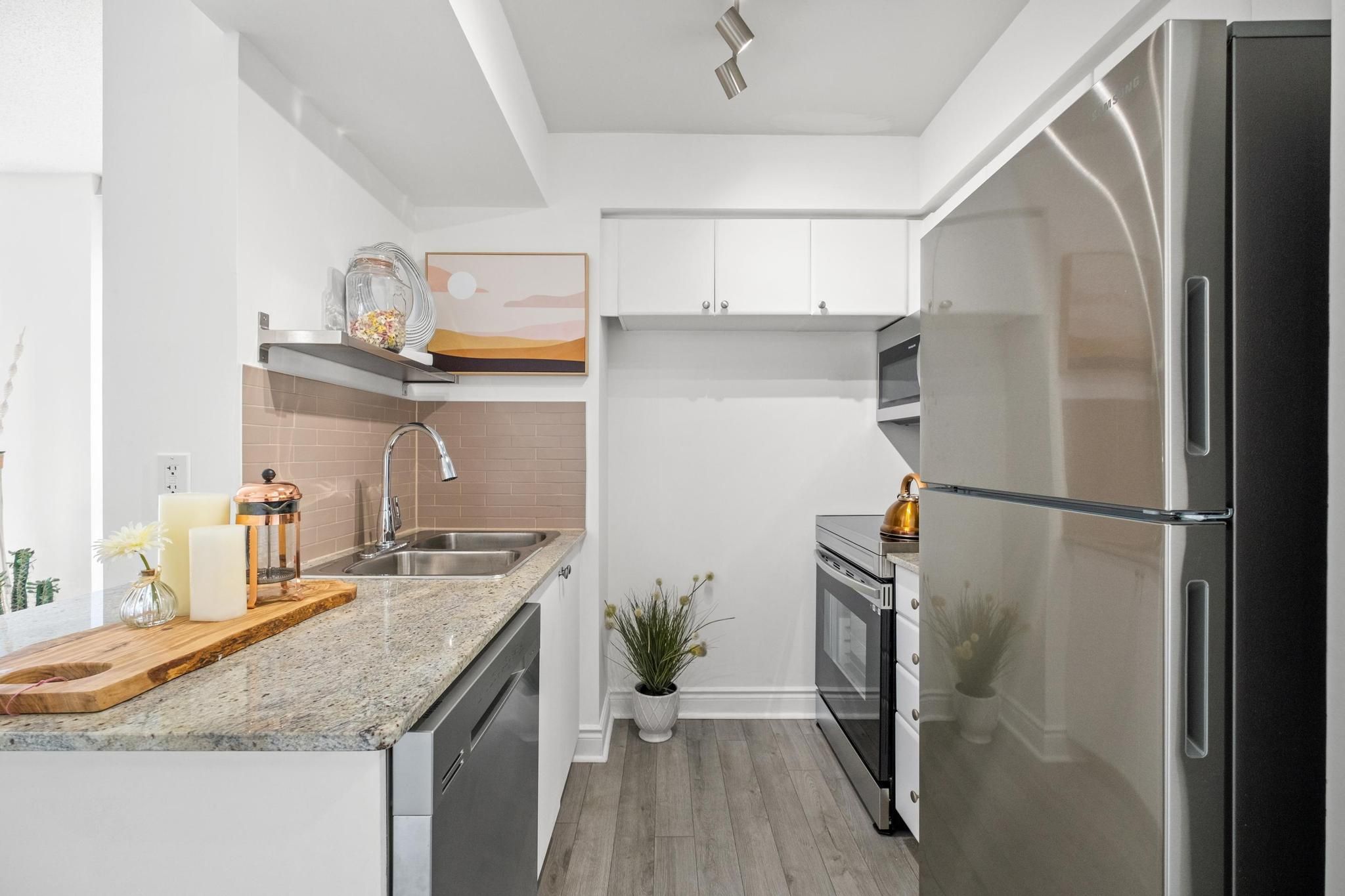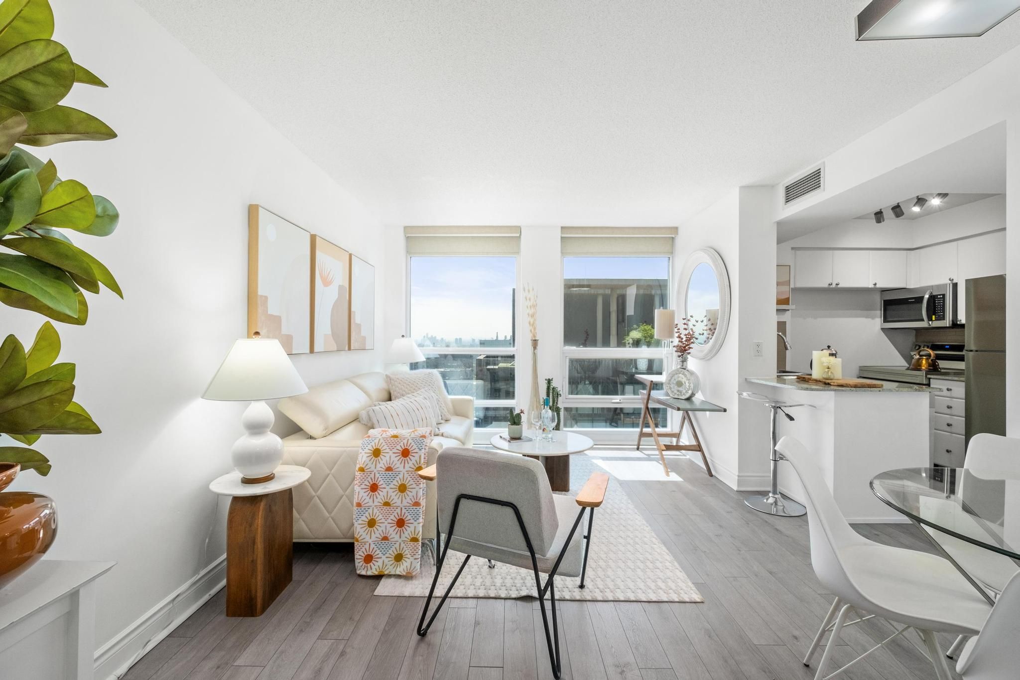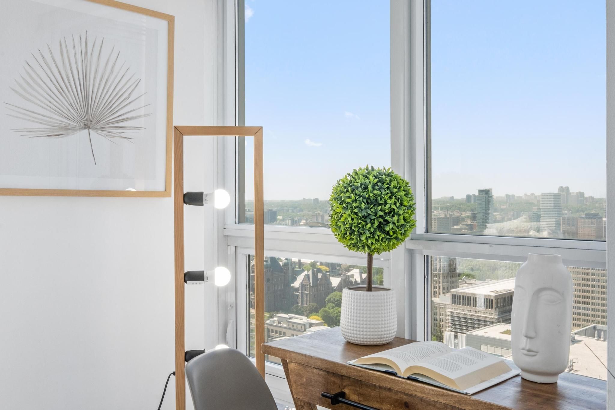 Experience the epitome of luxurious city living in this stunning northwest corner unit, located at the prestigious address of 763 Bay, in the heart of Toronto. Boasting breathtaking views of the iconic CN Tower and Lake Ontario, this meticulously designed 1+1 offers a perfect blend of elegance, comfort, and convenience. Upon entering you'll be captivated by the natural light throughout the unit. The well-appointed 1+1 layout is complemented by a separate den featuring its own set of windows, creating a versatile space & semi-suite bathroom offers functionality, All Utilities Included. Luxurious Amenities: Pool, Gym, Theater Room, Yoga Studio, Golf Simulator, PartyRoom, Concierge, Guest Suites, Table Tennis, Sauna, Business Center, Meeting Room, Media Room, Terrace. Direct Underground Access To College Subway Station. Service Ontario, Farm Boy, Metro, Starbucks, Winners, Ikea, Foodcourt, Lcbo, Steps To Uoft, Ryerson, Yorkville, Eaton Center, Financial District, Hospitals!Brand-new Stainless Steel Stove, Over-The-Range Microwave, Dishwasher And Fridge. Also include White Stacking Washer And Dryer And All Window Coverings.