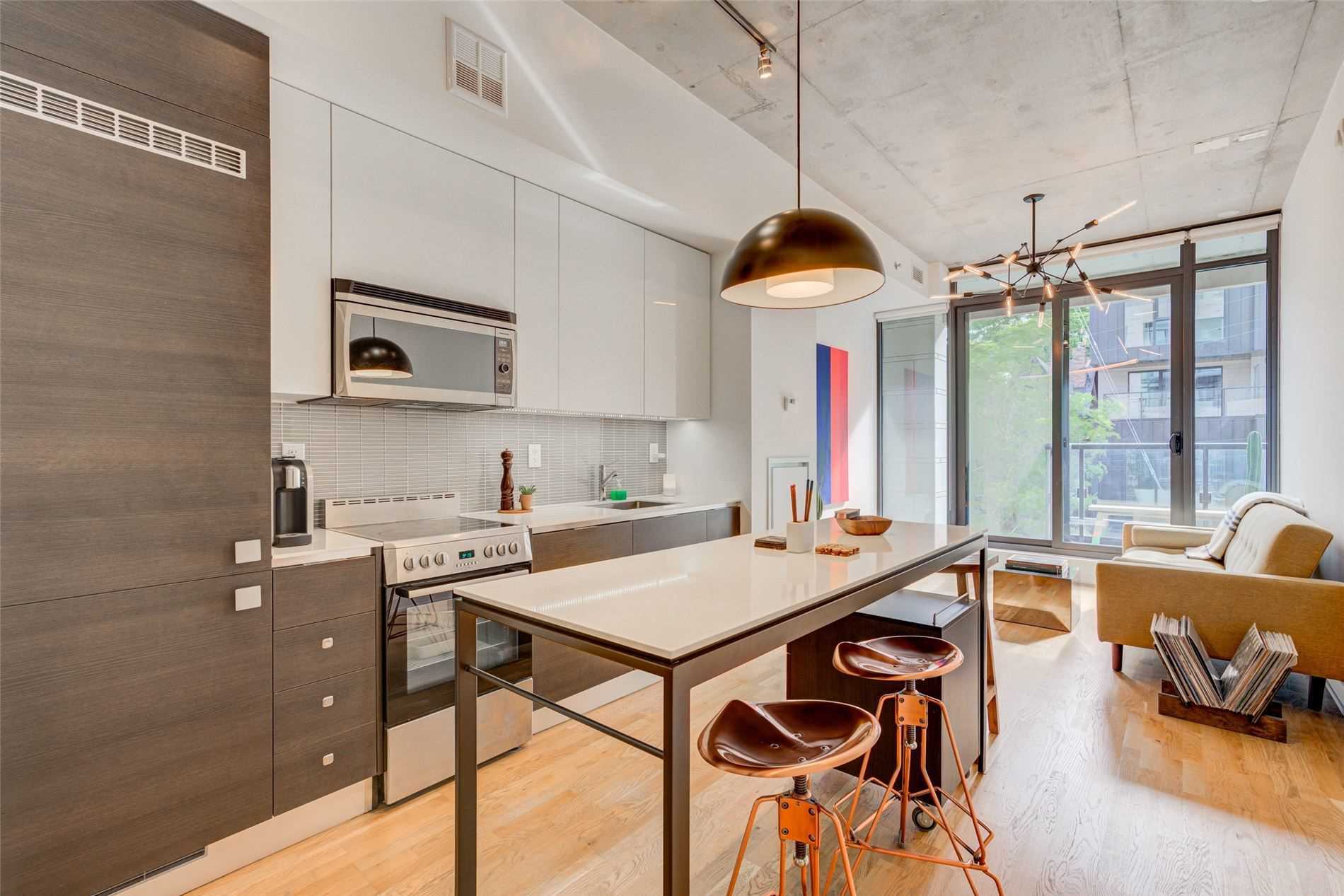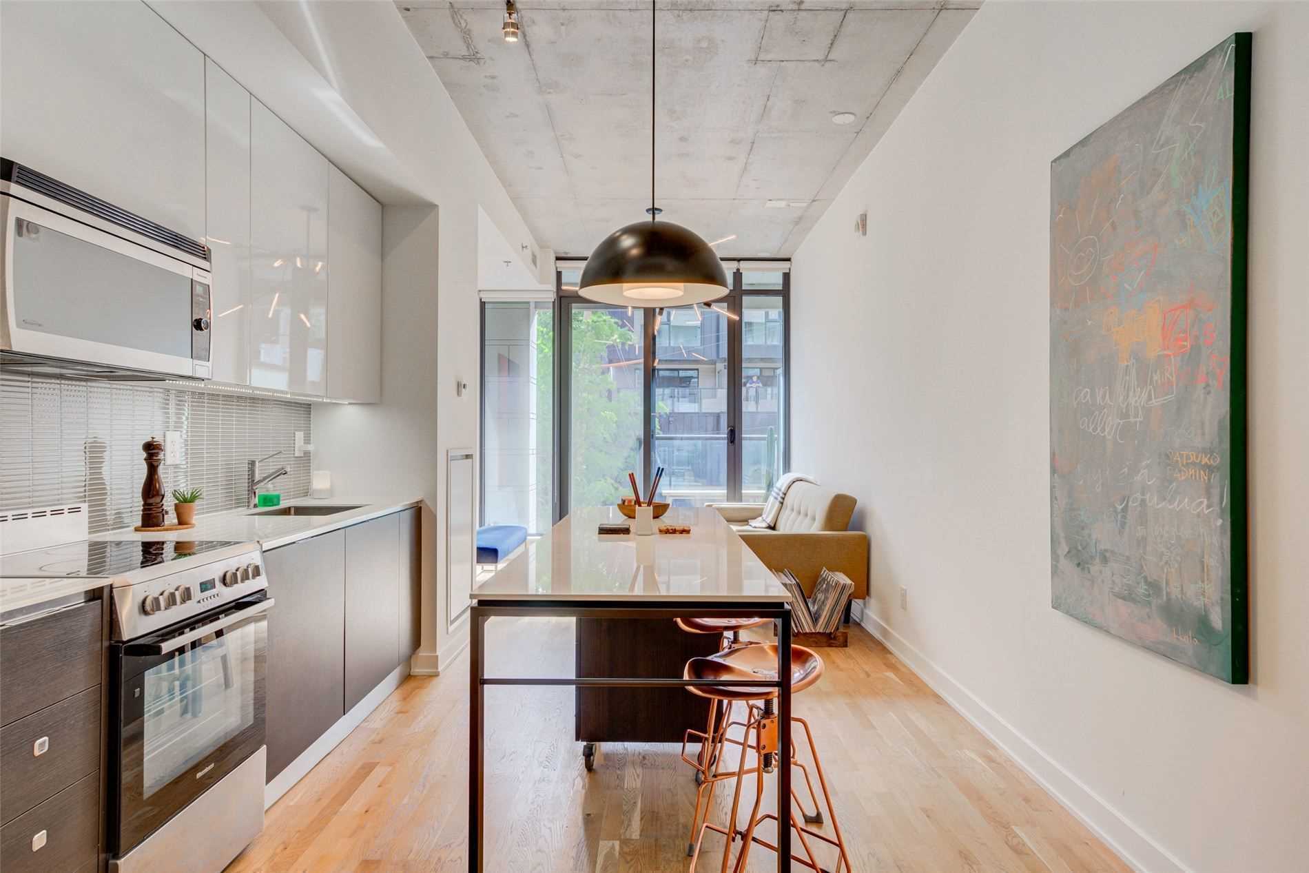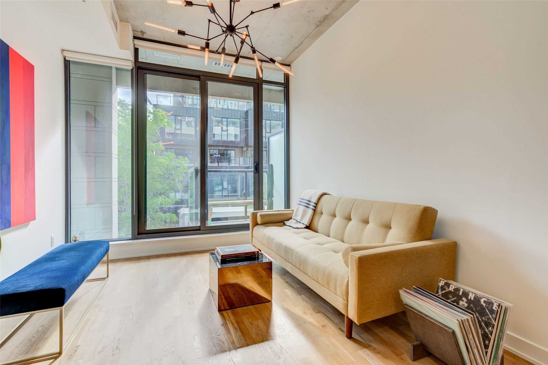 Stunning East Facing Design Forward Large 1-Bedroom In The Award-Winning Boutique Art Condo. Tons Of Sunlight W/ Flr To Ceiling Windows. Loft-Style Features Include 10Ft High Exposed Concrete Ceilings & Designer Custom Finishes. Boasting A Scavolini Kitchen W/ Built-In Appl, Quartz Counters, Under Cabinet Lighting & Large Island. Extra Wide Bedroom W/ Double Closet & Room For An Office Plus Outdoor Balcony. Spa-Like Bathroom W/Rain Shower. Steps To All That Queenw & Kingw Have To Offer. A Must See! Amenities Incl. Party Room/Outdoor Deck W/Bbq Access, Fire Pit & More! Near Trinity Bellwoods Park, Direct Public Transit Routes & Surrounded By Trendy Bars, Cafes & Restaurants.