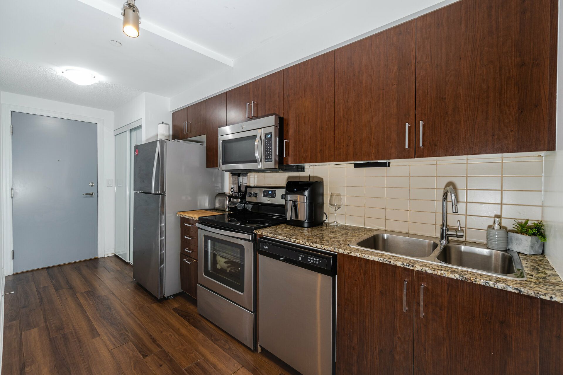 Spacious Boutique One Bedroom Suite. Great Layout Galley Style Kitchen Upgraded With Granite Counters, Subway Tile Backsplash & Stainless Steel Appliances. Floor To Ceiling Windows In The Living Room & Bedroom Perfect For Letting In That Beautiful Sunlight! Minutes To Pearson Airport, Etobicoke General Hospital, And Highway 401. Abundant Shopping, Excellent Schools, And Humber College Nearby. Humber River Ravine Trails Right In Your Backyard. The Perfect StarterAmenities: Rooftop Bbq Patio, Indoor Rooftop Heated Swimming Pool, Gym& 24 Hr Security With Concierge, Panoramic View Of Gta. Ttc At Doorsteps And Much More!
