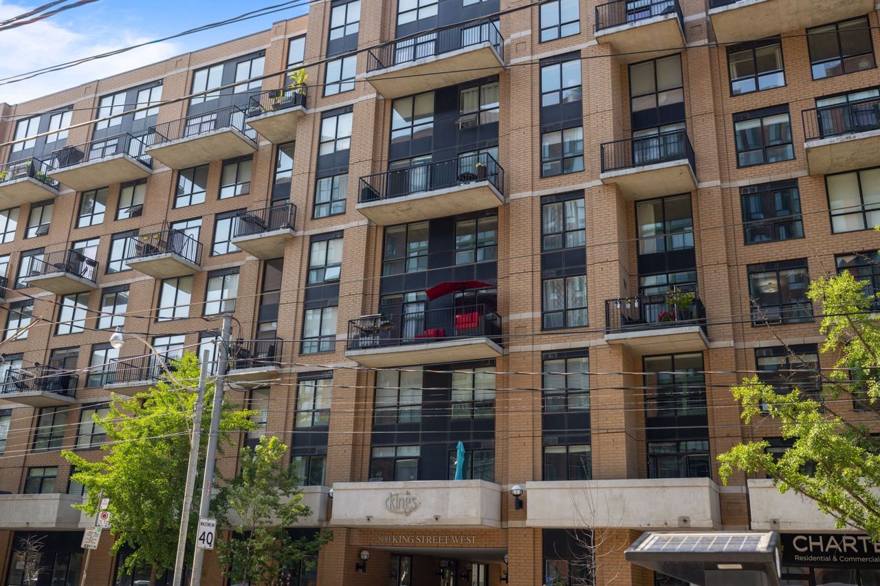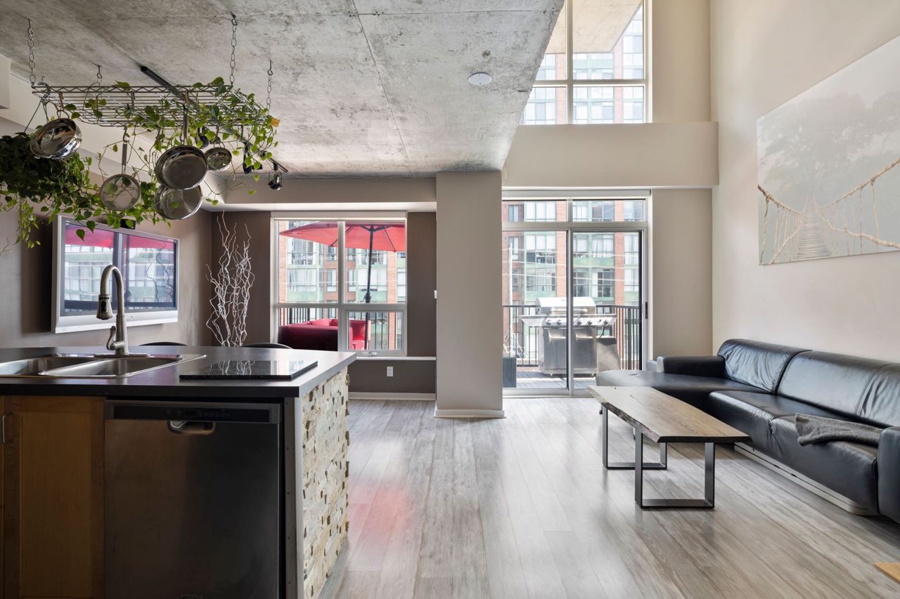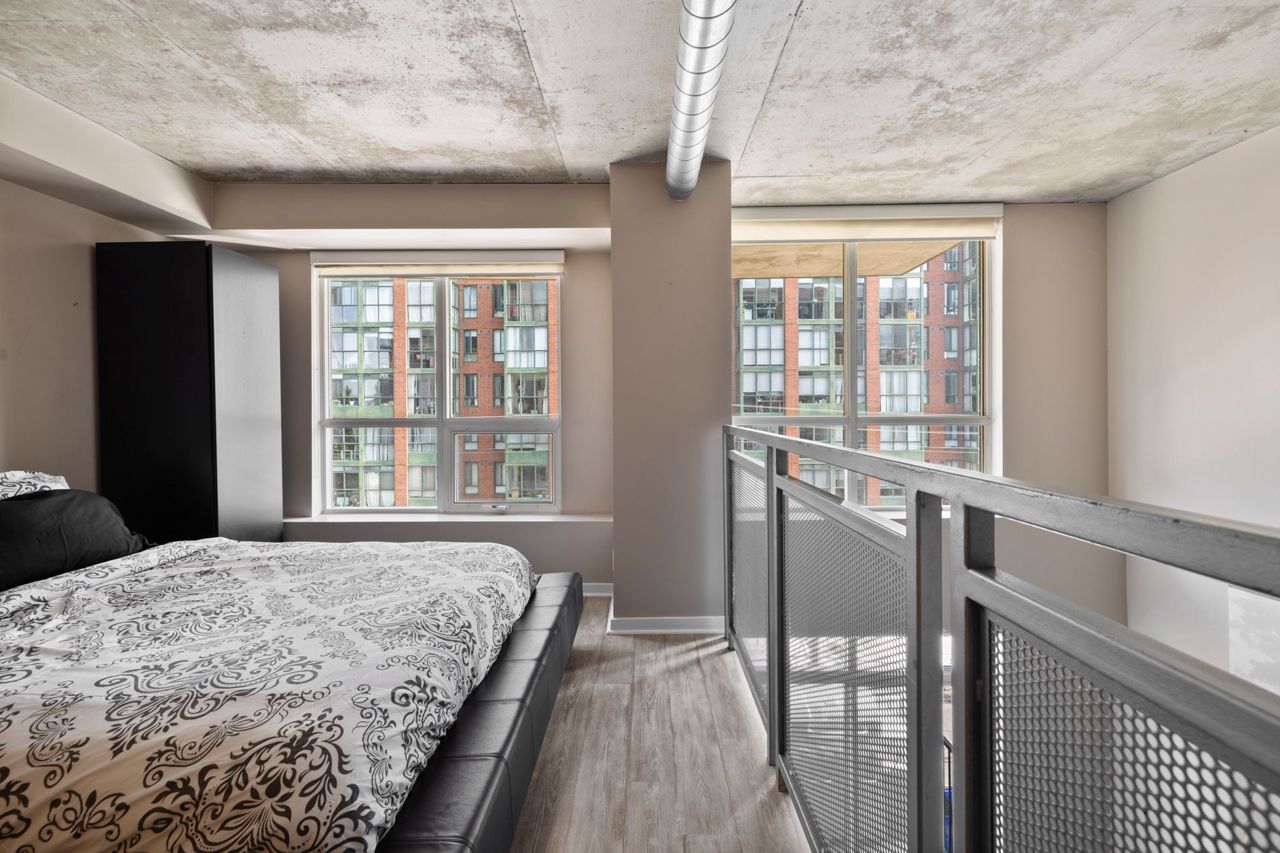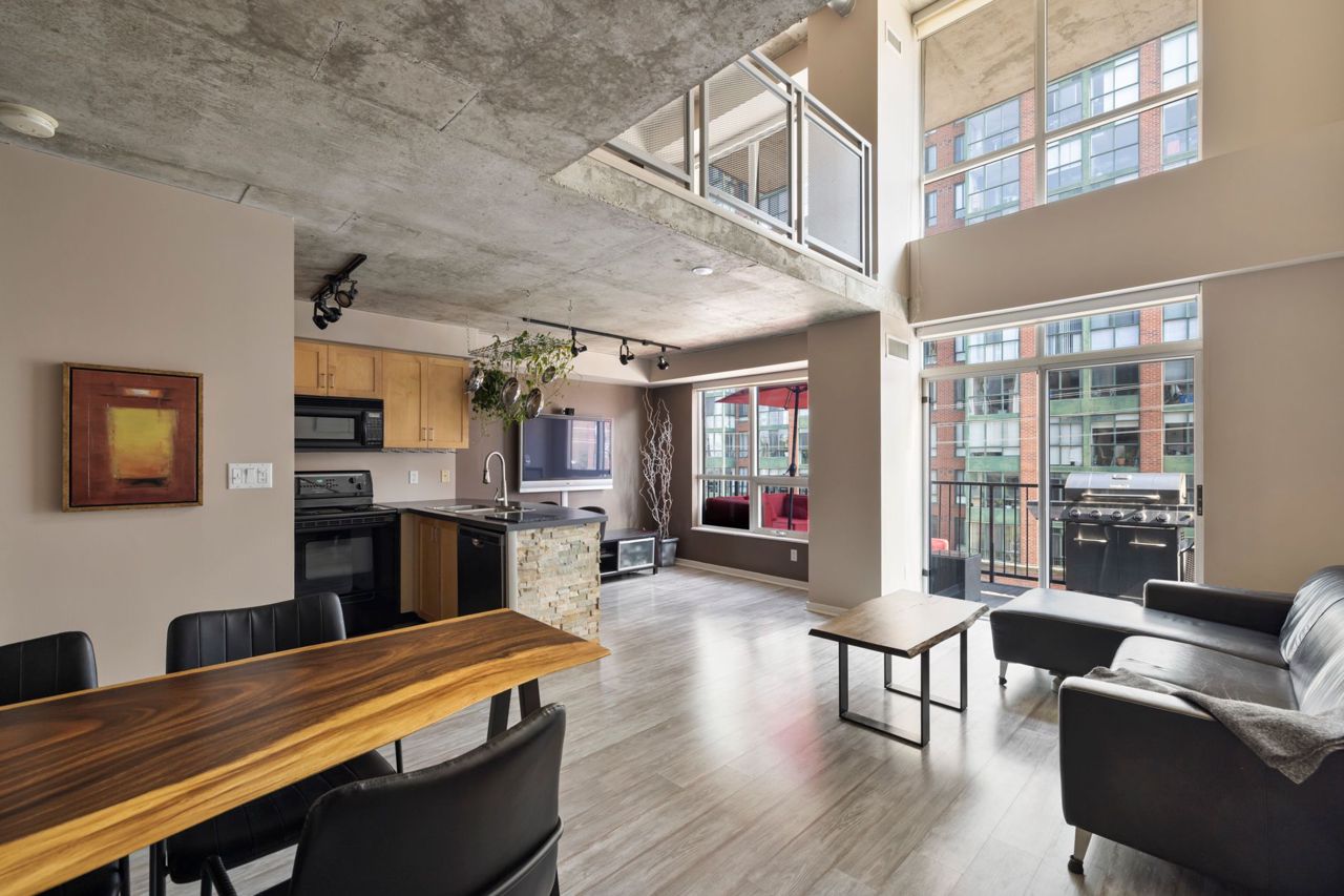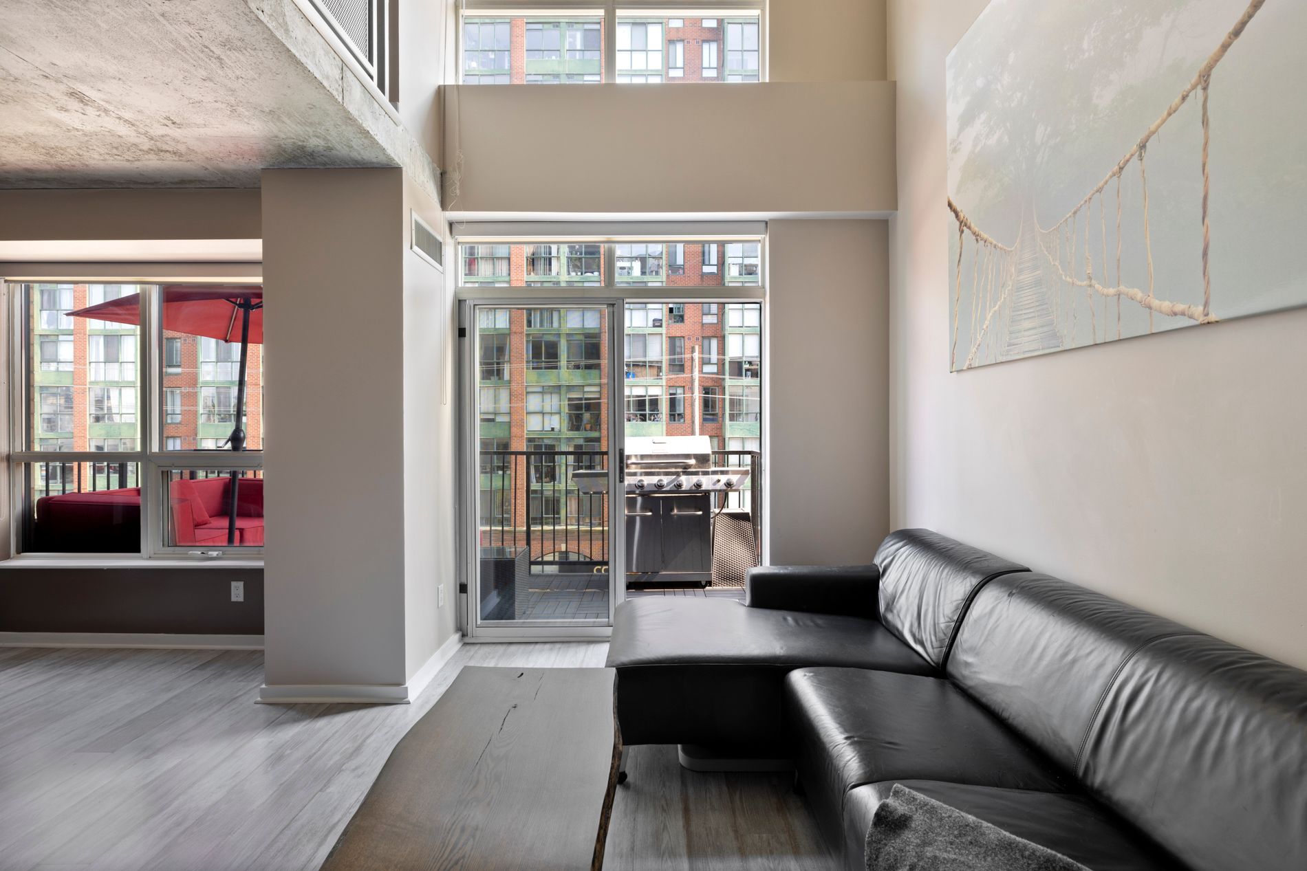 Unique & Rarely Offered Loft Hovering Over King St W, Welcome To The Kings Lofts, 2 Storey Loft In The Heart Of King West Village, 815Sqft 1 Bedroom + Den, Rare "08" Model With Deepest Layout From Door To Window Thanks To Architectural Design, Soaring 17FtCeilings, South Facing, Open Concept, Custom Designed Stone Wall, Wall Of Windows, Exposed Concrete Ceilings, Stainless Steel Hanging Chef Pot Rack, Lofty Steel Ducts & Red Fire Bell, Largest Balcony In Building, Custom Stained Oak Stairs, Custom Steel Trims, 4th Floor High Demand Unit, Pet and Rare Barbecue-Friendly Building With Maintenance Fees That Include All Utilities. Overnight Security Guard, Modern Gym, Explore A Lively Neighborhood With Restaurants, Bars, Shops, Cafes, Parks, Fitness Studios and Easy Access To Public Transportation. BBQ On Your Private Balcony With Friends, Surrounded by Trees. Guest Visitor Parking Available. Extra Storage / Pet Room Built Under Stairs Through Closet. Nest Smart Thermostat. Tiled Balcony!Includes 1 Parking, 1 Very Large Locker, 3 Bike Racks!!! Custom B/I Storage Under Stairs, Fridge, Stove, B/I Dishwasher, Washer, Dryer, B/I Microwave With Hood Fan, All Existing Light Fixtures, All Window Coverings, Hanging Chef's Pot Rack.