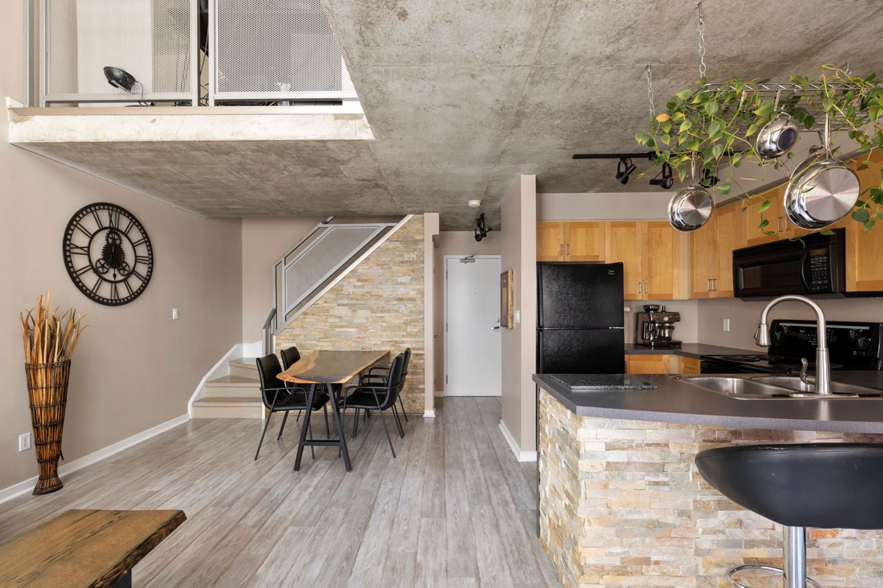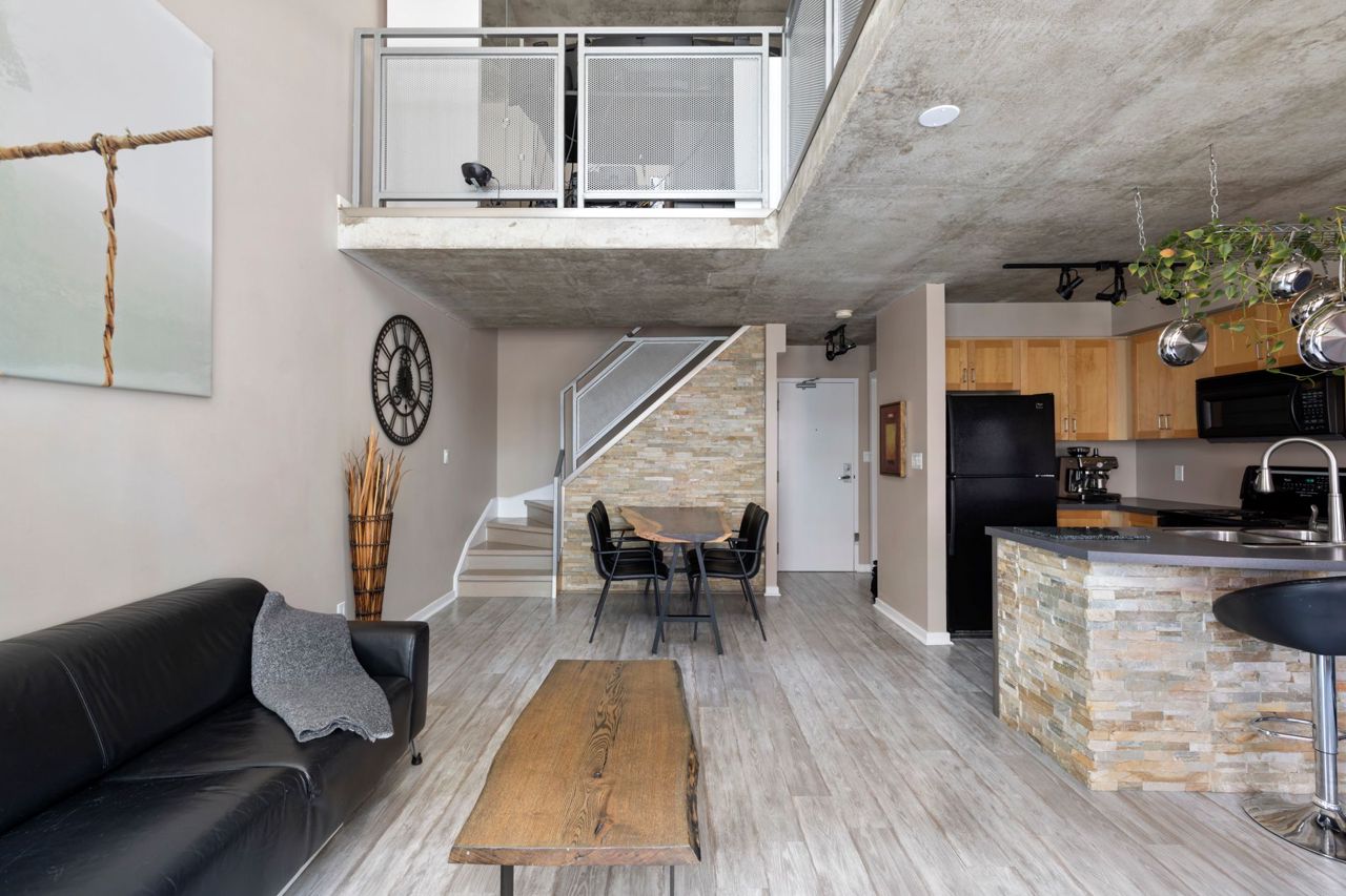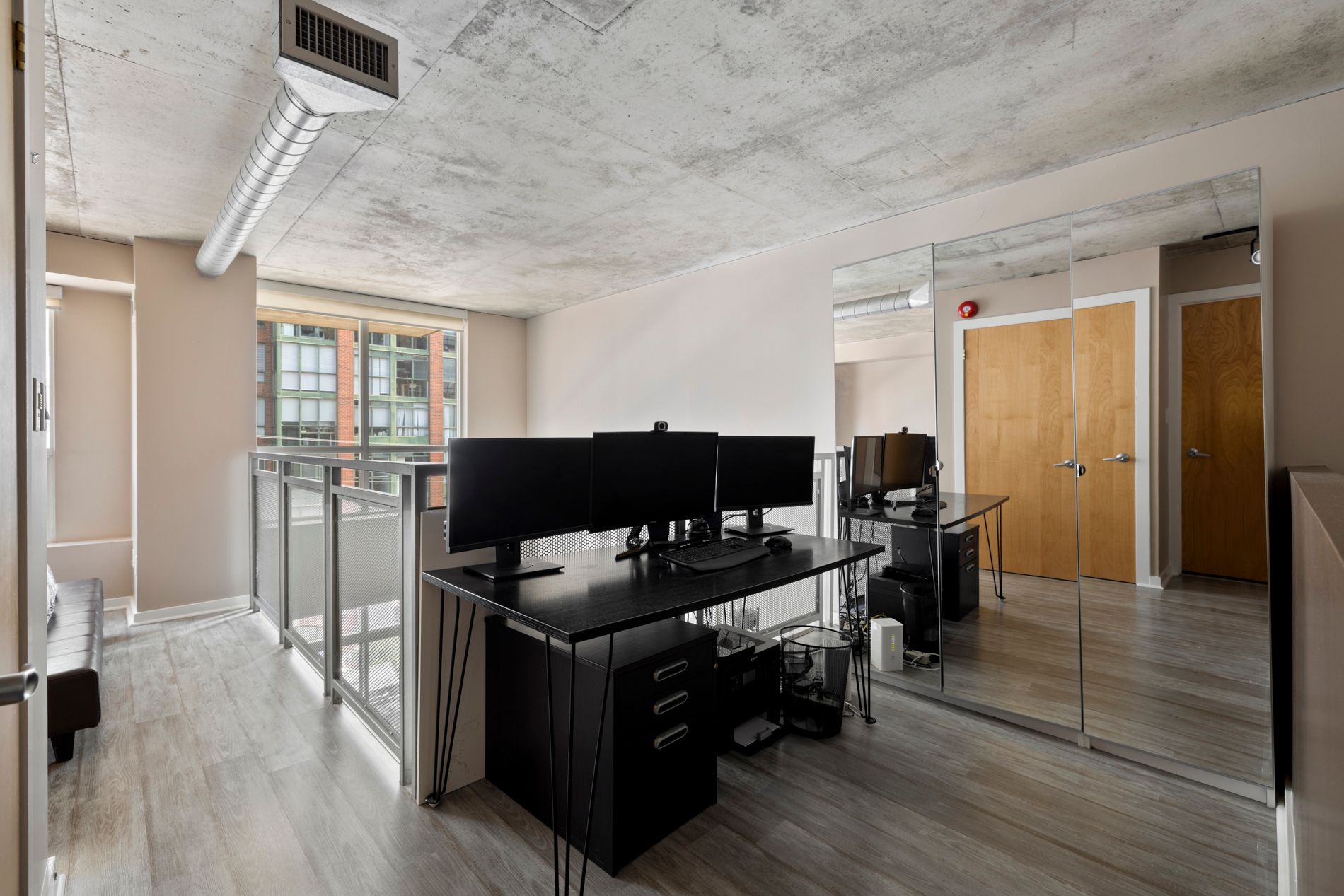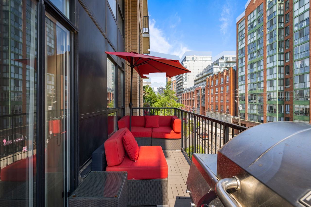 Unique & Rarely Offered Loft Hovering Over King St W, Welcome To The Kings Lofts, 2 Storey Loft In The Heart Of King West Village, 815Sqft 1 Bedroom + Den, Rare "08" Model With Deepest Layout From Door To Window Thanks To Architectural Design, Soaring 17FtCeilings, South Facing, Open Concept, Custom Designed Stone Wall, Wall Of Windows, Exposed Concrete Ceilings, Stainless Steel Hanging Chef Pot Rack, Lofty Steel Ducts & Red Fire Bell, Largest Balcony In Building, Custom Stained Oak Stairs, Custom Steel Trims, 4th Floor High Demand Unit, Pet and Rare Barbecue-Friendly Building With Maintenance Fees That Include All Utilities. Overnight Security Guard, Modern Gym, Explore A Lively Neighborhood With Restaurants, Bars, Shops, Cafes, Parks, Fitness Studios and Easy Access To Public Transportation. BBQ On Your Private Balcony With Friends, Surrounded by Trees. Guest Visitor Parking Available. Extra Storage / Pet Room Built Under Stairs Through Closet. Nest Smart Thermostat. Tiled Balcony!Includes 1 Parking, 1 Very Large Locker, 3 Bike Racks!!! Custom B/I Storage Under Stairs, Fridge, Stove, B/I Dishwasher, Washer, Dryer, B/I Microwave With Hood Fan, All Existing Light Fixtures, All Window Coverings, Hanging Chef's Pot Rack.