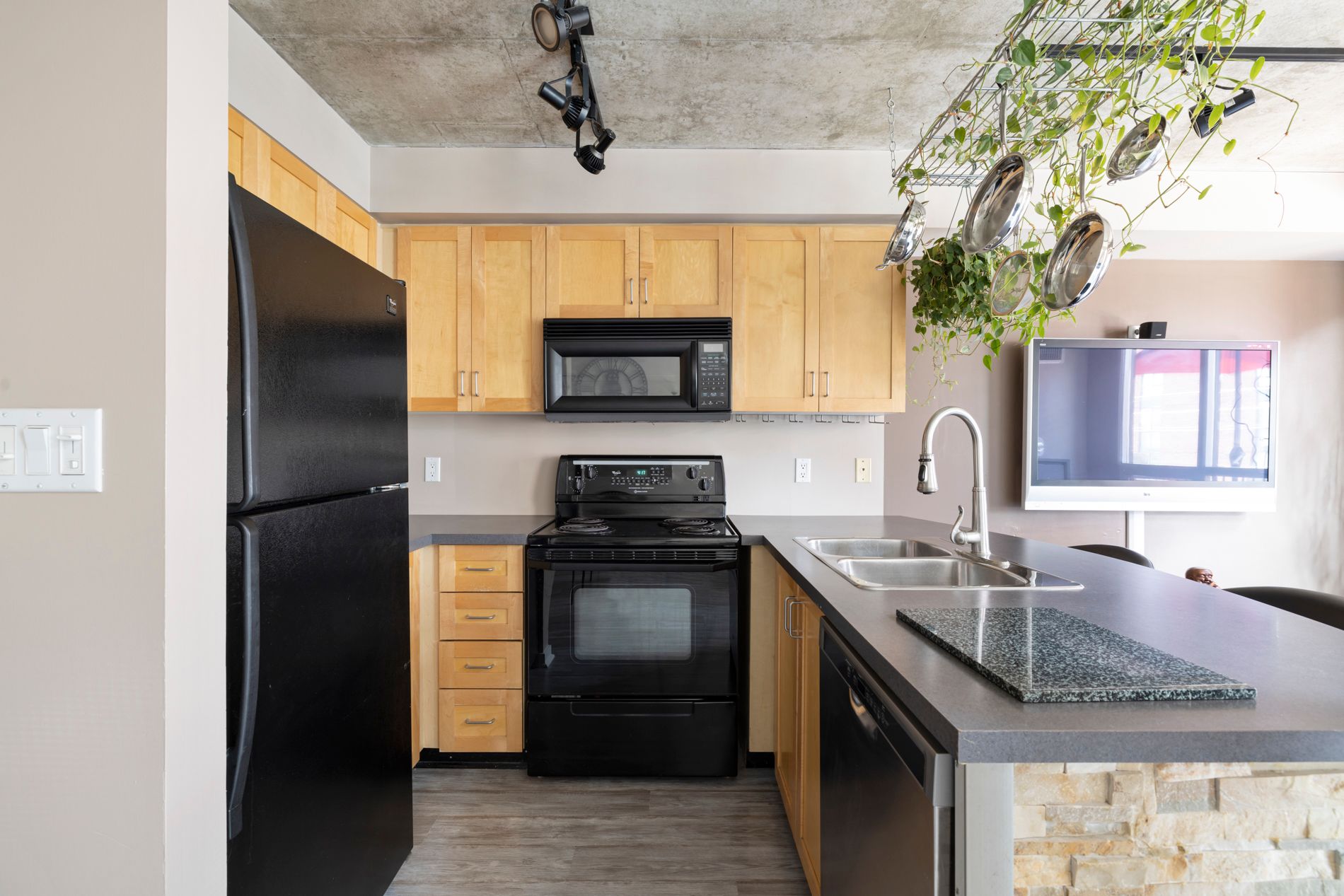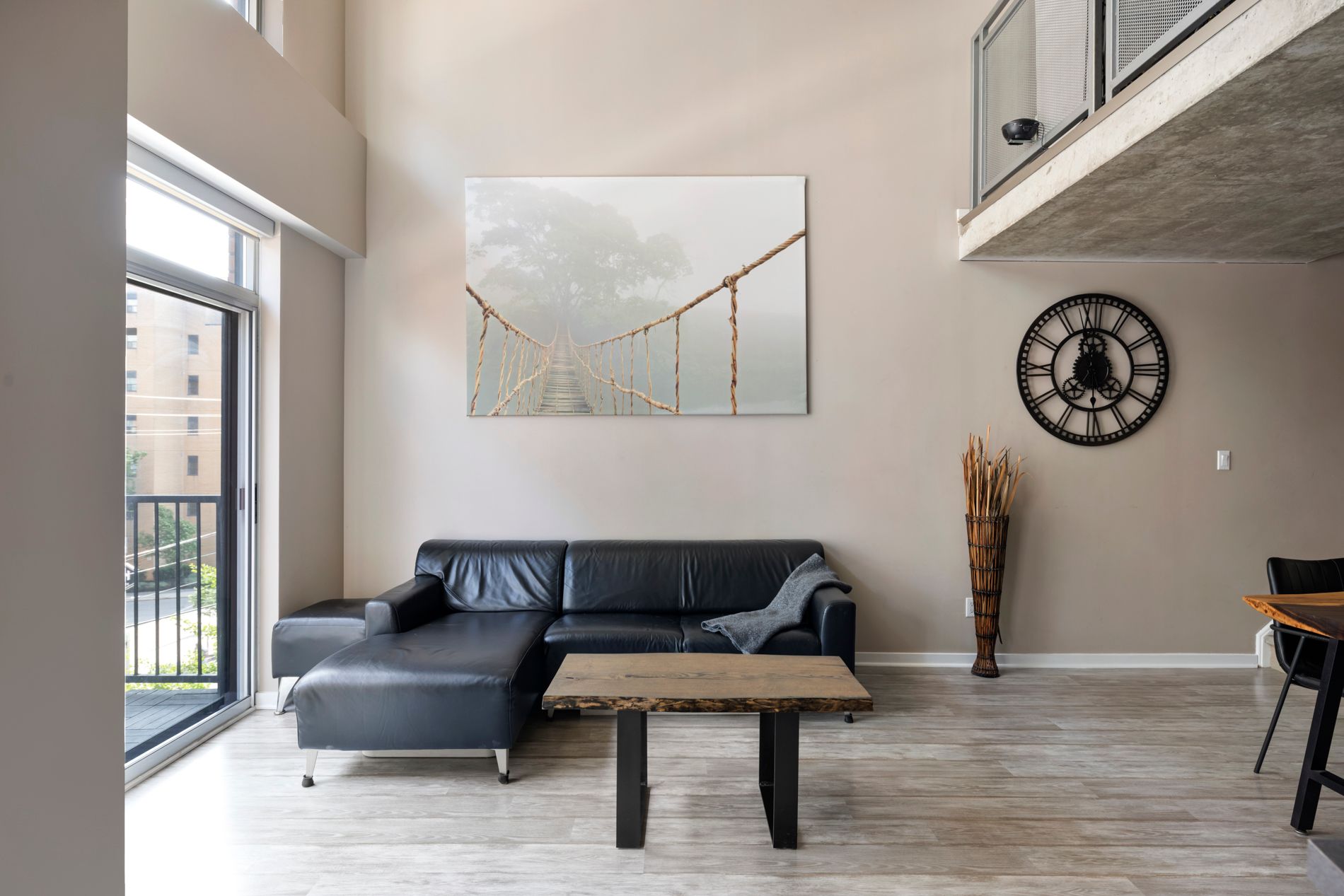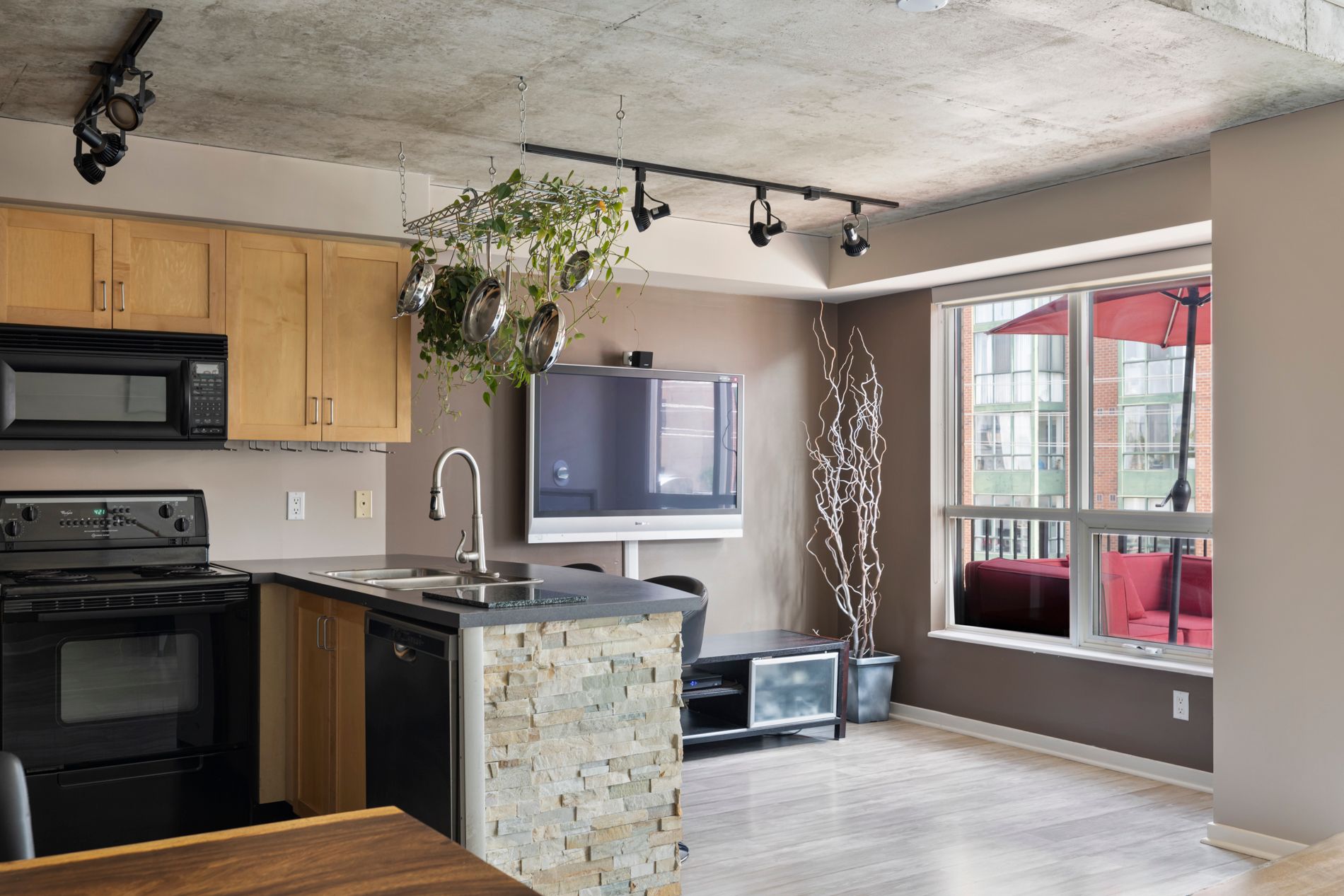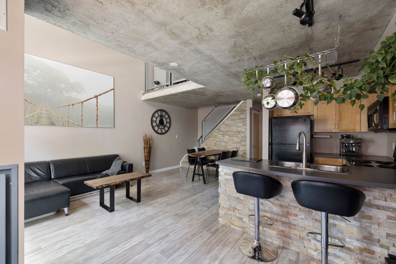 Unique & Rarely Offered Loft Hovering Over King St W, Welcome To The Kings Lofts, 2 Storey Loft In The Heart Of King West Village, 815Sqft 1 Bedroom + Den, Rare "08" Model With Deepest Layout From Door To Window Thanks To Architectural Design, Soaring 17FtCeilings, South Facing, Open Concept, Custom Designed Stone Wall, Wall Of Windows, Exposed Concrete Ceilings, Stainless Steel Hanging Chef Pot Rack, Lofty Steel Ducts & Red Fire Bell, Largest Balcony In Building, Custom Stained Oak Stairs, Custom Steel Trims, 4th Floor High Demand Unit, Pet and Rare Barbecue-Friendly Building With Maintenance Fees That Include All Utilities. Overnight Security Guard, Modern Gym, Explore A Lively Neighborhood With Restaurants, Bars, Shops, Cafes, Parks, Fitness Studios and Easy Access To Public Transportation. BBQ On Your Private Balcony With Friends, Surrounded by Trees. Guest Visitor Parking Available. Extra Storage / Pet Room Built Under Stairs Through Closet. Nest Smart Thermostat. Tiled Balcony!Includes 1 Parking, 1 Very Large Locker, 3 Bike Racks!!! Custom B/I Storage Under Stairs, Fridge, Stove, B/I Dishwasher, Washer, Dryer, B/I Microwave With Hood Fan, All Existing Light Fixtures, All Window Coverings, Hanging Chef's Pot Rack.