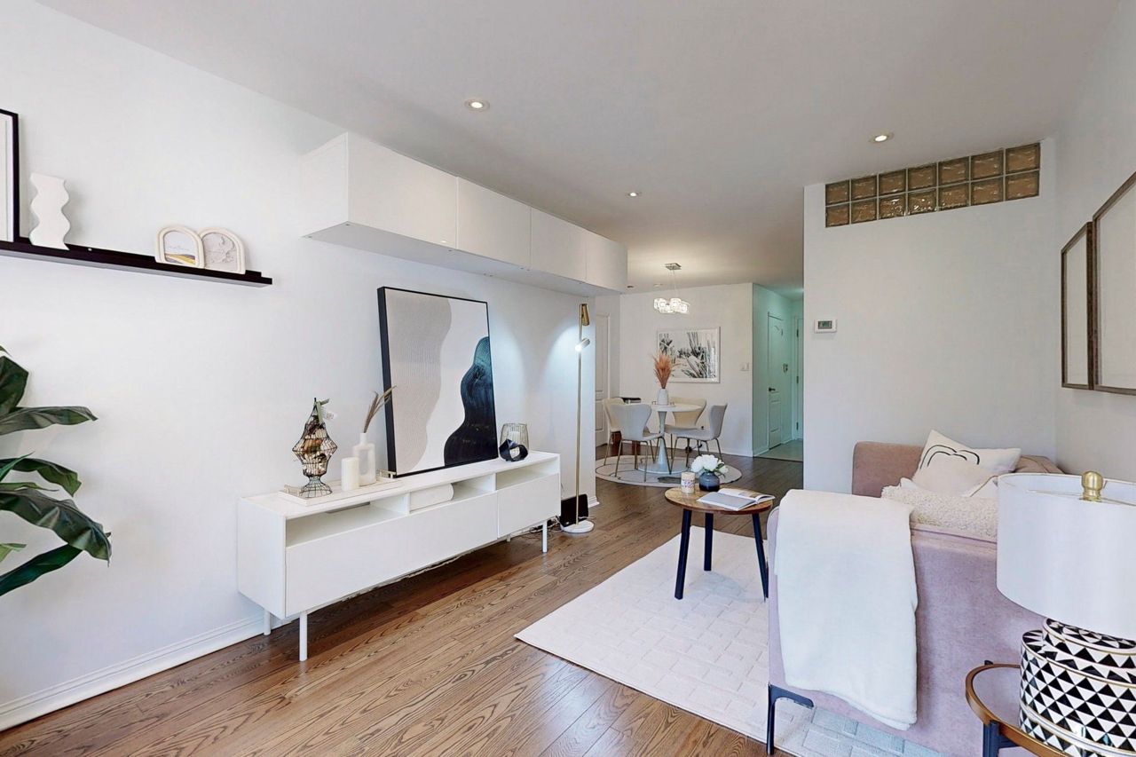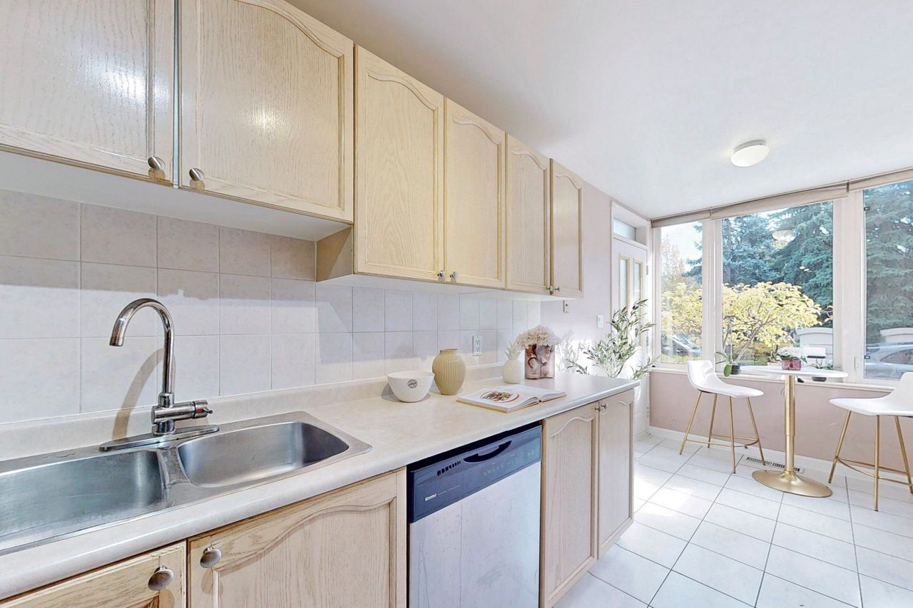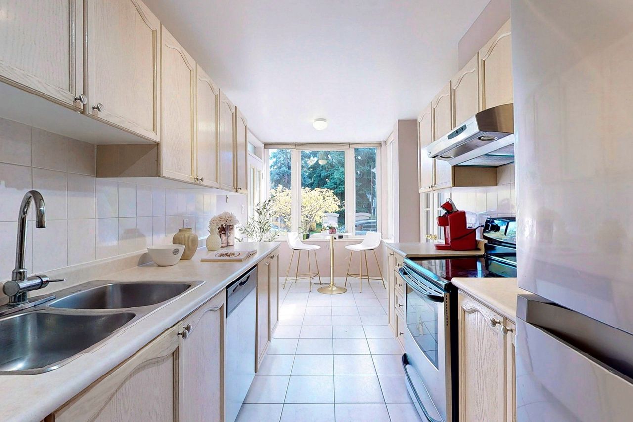 Rarely offered, large (1,221 Sqft) main level Tridel built stacked condo townhouse. Located in desirable Willowdale east, minutes walk to the highly sought after Mckee Public School. A family friendly and calm enclave ideally situated minutes away from all the amenities located at the Yonge and Finch corridor. The North York Centre and Finch subway station are a short 10 minute walk away. Open concept unit, freshly painted throughout with a garden view. One large primary bedroom with full ensuite bathroom and office area. Large den that can easily be used as a second bedroom. Spacious kitchen with direct W/O to the front terrace. Guest bathroom, and washer and dryer area updated (2017). Potlights throughout the home and main reno completed in 2015. A/C unit upgraded (2016). Engineered Hardwood installed (2017). New fridge in (2018). Closet doors upgraded at front entrance (2021). One underground parking space and ensuite locker included. 24 Hour security onsite.Fridge, Stove dish washer, Washer and Dryer, light fixtures