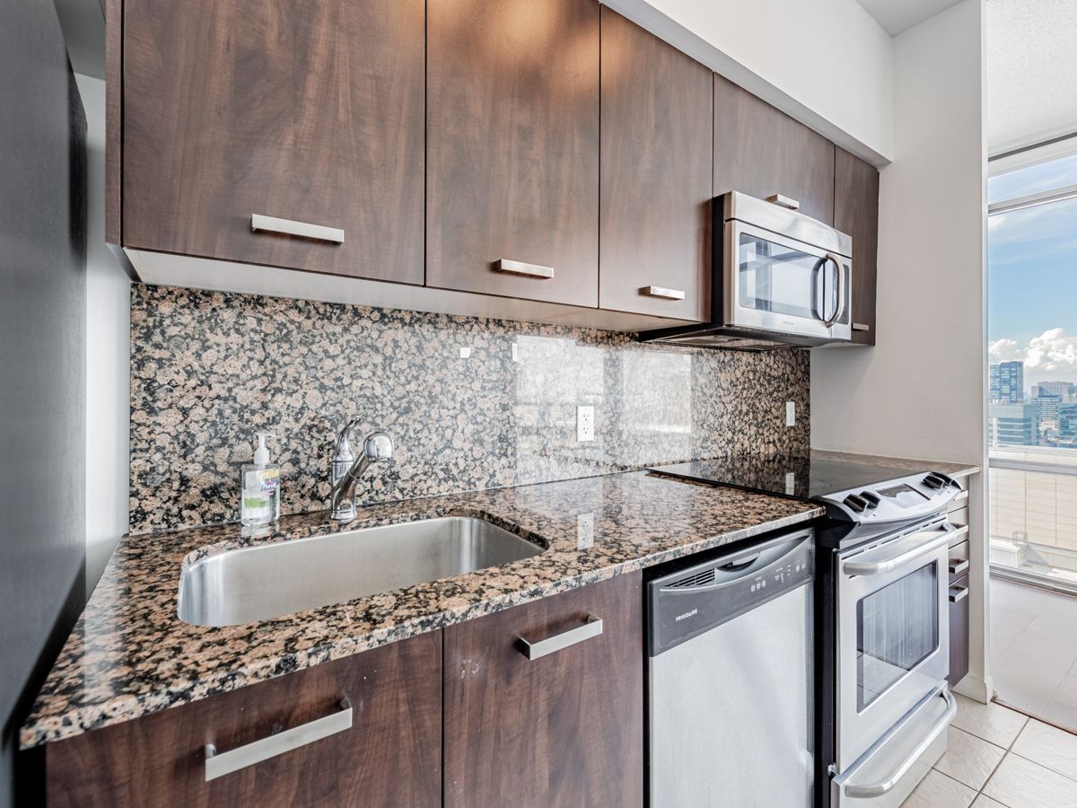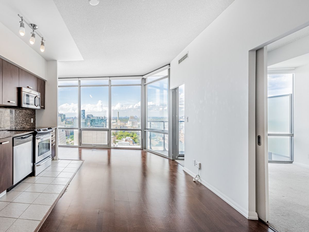 In the Heart of Downtown Toronto Financial & Entertainment District! Simply Gorgeous, Bright, Unobstructed View & Spacious 2 Bedroom, 2 Washrooms, 9Ft Ceiling Open Concept Living/Dining/Kitchen, Floor to Ceiling Windows & Open Balcony. Close to the College Park mall, Loblaw's, Sobeys, Restaurants, TTC, Subways U of T, Ryerson Universities, Hospital, 24 Hours Concierge, Outdoor Swimming Pool, Guest Suites, Gym, Party Room, Lounge Board Room, Theatre Room, Visitors Parking and Many More amenities.Stainless Steel Appliances includes: Fridge, B/I Dishwasher & Microwave, Cook Top Stove, Stacked Washer & Dryer. Light Fixtures, Blinds and one Underground Parking.