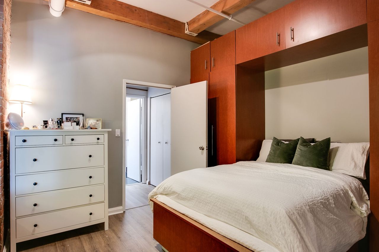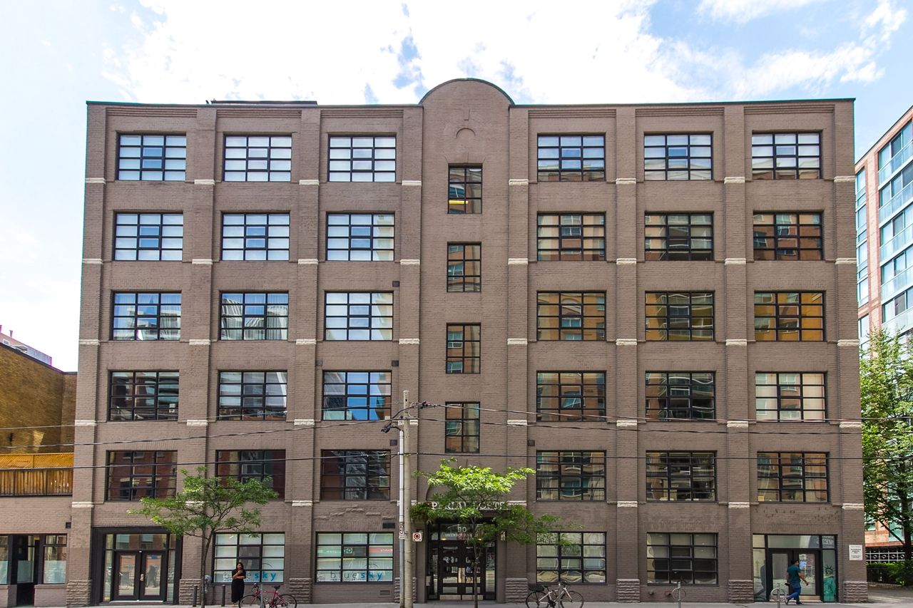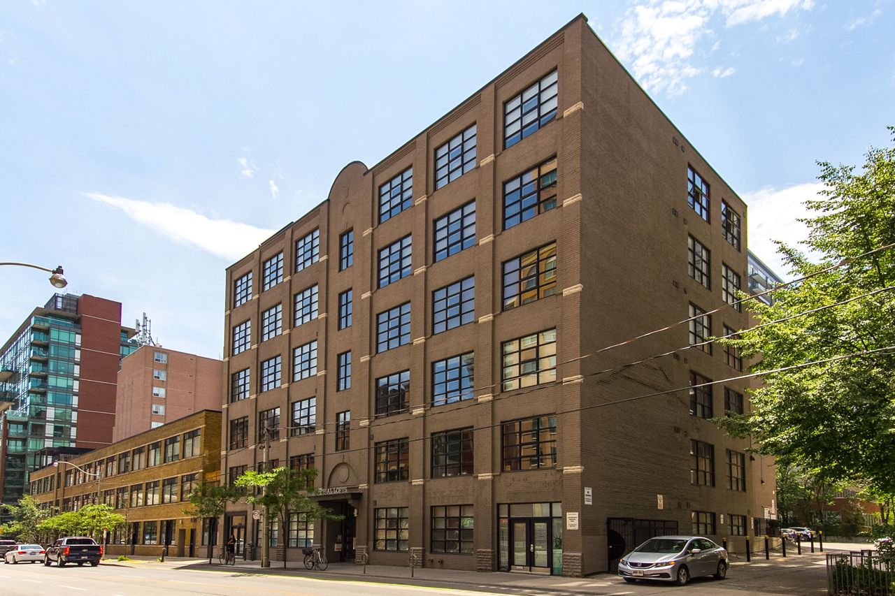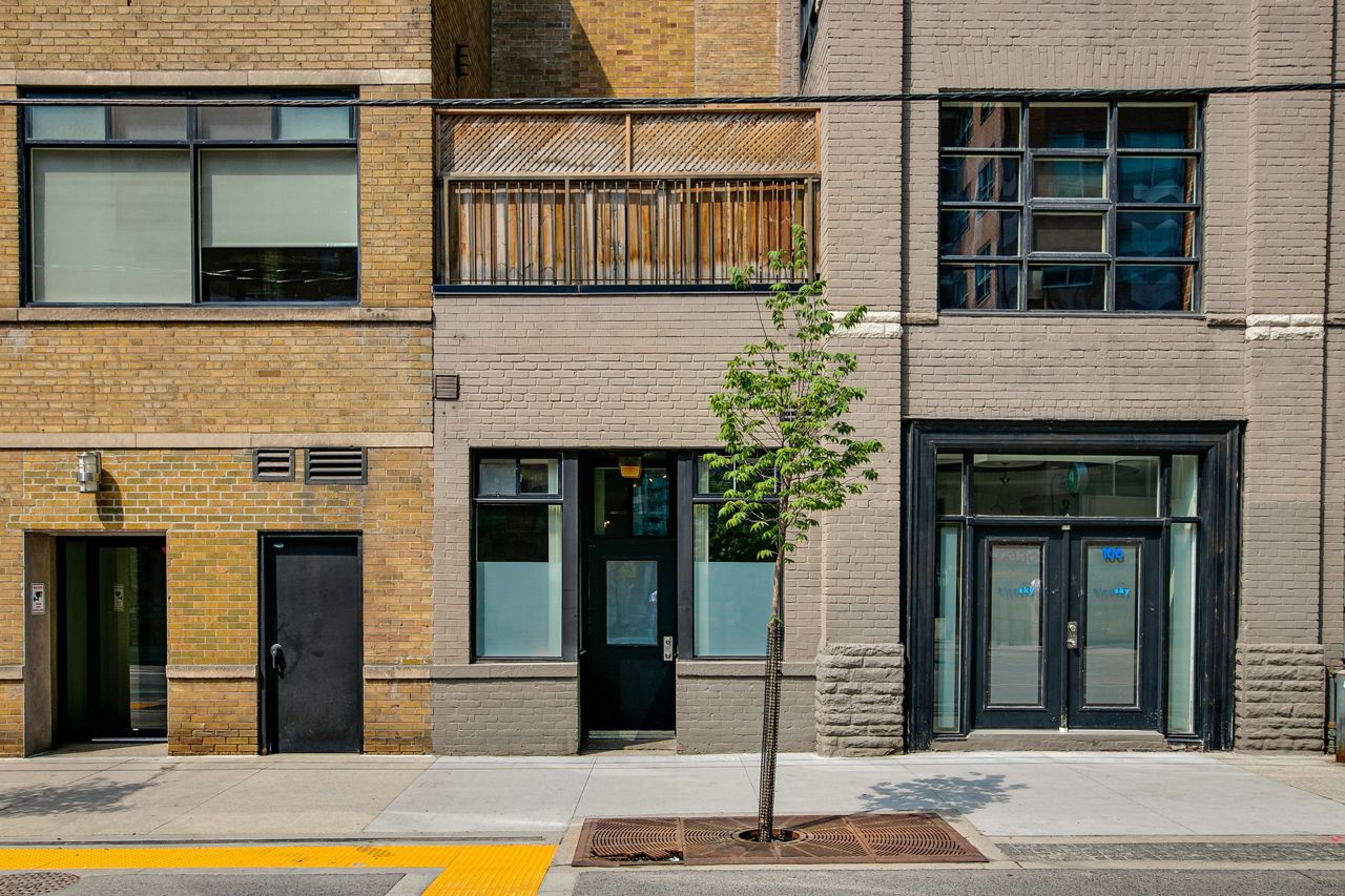 Rarely available ground floor residential / commercial hard loft in Victorian Period building. Spaciously sized at 1,070 sq ft & lots of character, with exposed brick walls & authentic wood beams, soaring 11' ceilings & kitchen skylight. Open concept or closed off bedroom w/ roll down privacy wall & stone ledge overlooking living area. Open concept kitchen w/ stainless steel appliances & breakfast bar. Direct street access at front & unit door into bldg at rear. Beautiful rooftop terrace w/ bbq & CN tower views. Steps to George Brown College, St Lawrence Market, Distillery District, trendy King St E shops, restaurants and transit.Stainless steel fridge, oven + stove range, dishwasher,microwave + hood unit,washer, dryer, custom bed w/full wall of built-in storage,all existing electrical light fixtures + window coverings.Large ensuite storage closet, locker & parking.