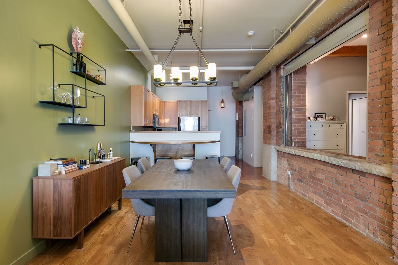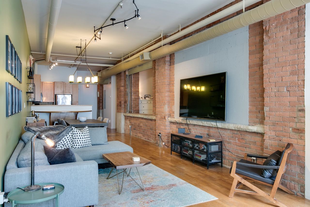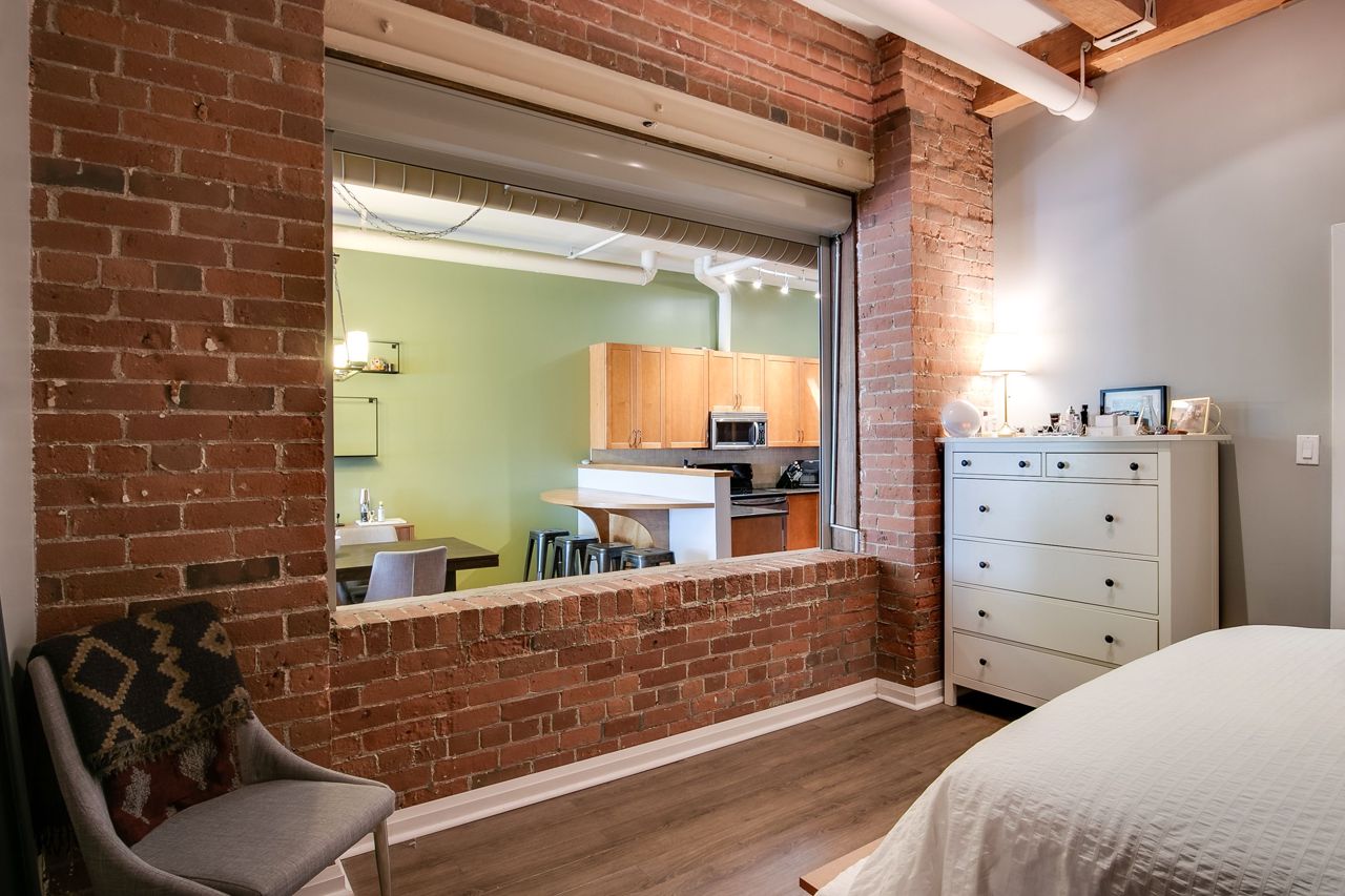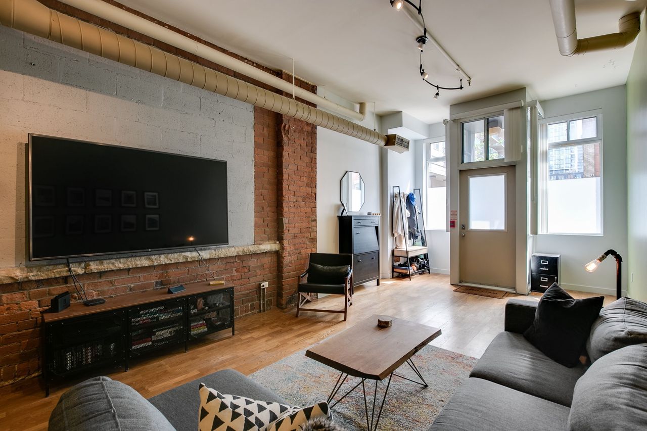 Rarely available ground floor residential / commercial hard loft in Victorian Period building. Spaciously sized at 1,070 sq ft & lots of character, with exposed brick walls & authentic wood beams, soaring 11' ceilings & kitchen skylight. Open concept or closed off bedroom w/ roll down privacy wall & stone ledge overlooking living area. Open concept kitchen w/ stainless steel appliances & breakfast bar. Direct street access at front & unit door into bldg at rear. Beautiful rooftop terrace w/ bbq & CN tower views. Steps to George Brown College, St Lawrence Market, Distillery District, trendy King St E shops, restaurants and transit.Stainless steel fridge, oven + stove range, dishwasher,microwave + hood unit,washer, dryer, custom bed w/full wall of built-in storage,all existing electrical light fixtures + window coverings.Large ensuite storage closet, locker & parking.