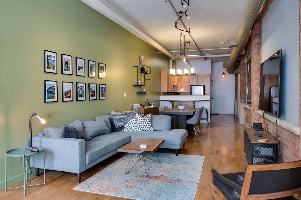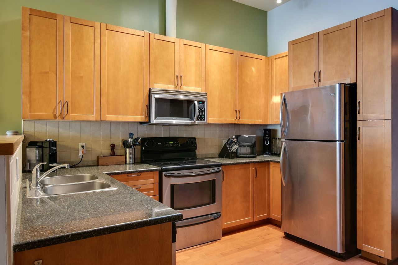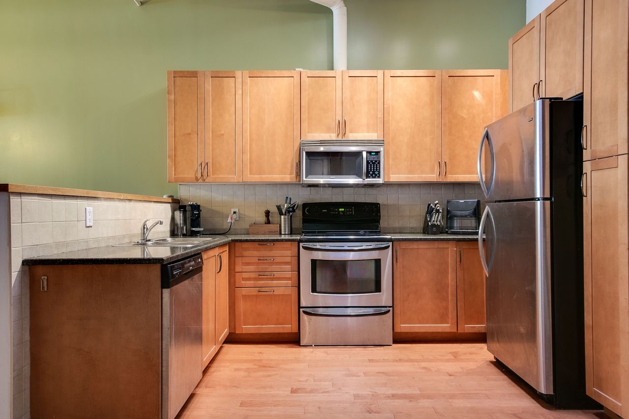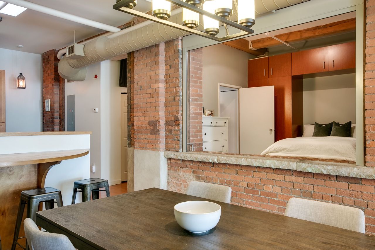 Rarely available ground floor residential / commercial hard loft in Victorian Period building. Spaciously sized at 1,070 sq ft & lots of character, with exposed brick walls & authentic wood beams, soaring 11' ceilings & kitchen skylight. Open concept or closed off bedroom w/ roll down privacy wall & stone ledge overlooking living area. Open concept kitchen w/ stainless steel appliances & breakfast bar. Direct street access at front & unit door into bldg at rear. Beautiful rooftop terrace w/ bbq & CN tower views. Steps to George Brown College, St Lawrence Market, Distillery District, trendy King St E shops, restaurants and transit.Stainless steel fridge, oven + stove range, dishwasher,microwave + hood unit,washer, dryer, custom bed w/full wall of built-in storage,all existing electrical light fixtures + window coverings.Large ensuite storage closet, locker & parking.