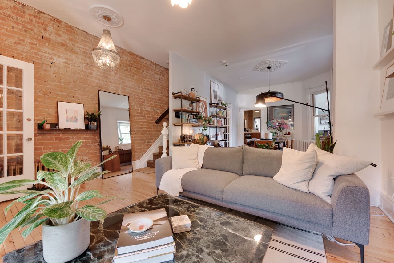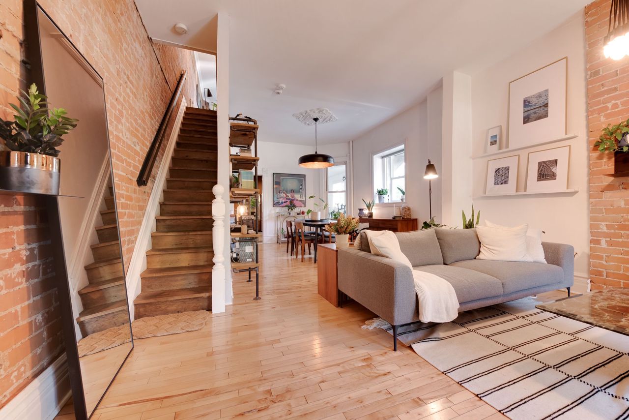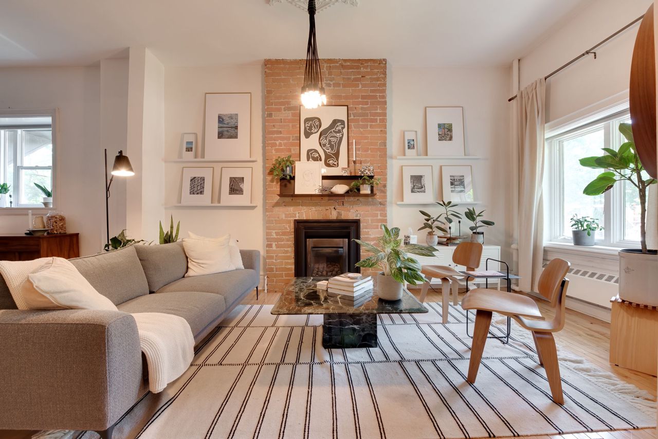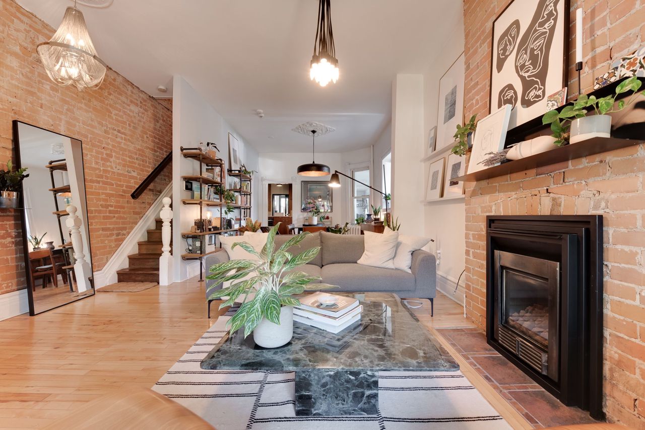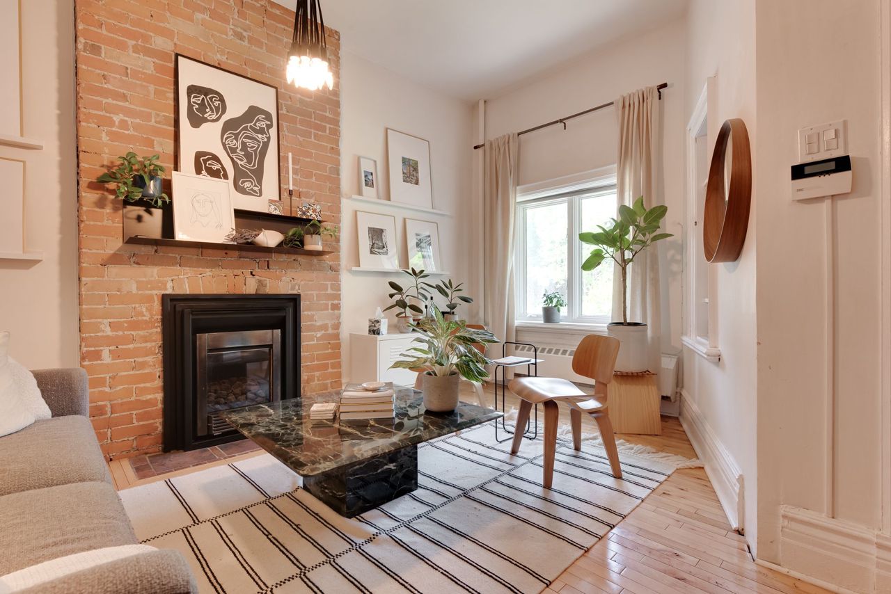 Hardwood Floor Large Window Brick Fireplace
