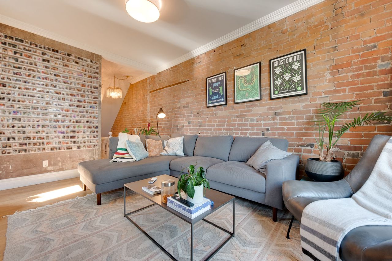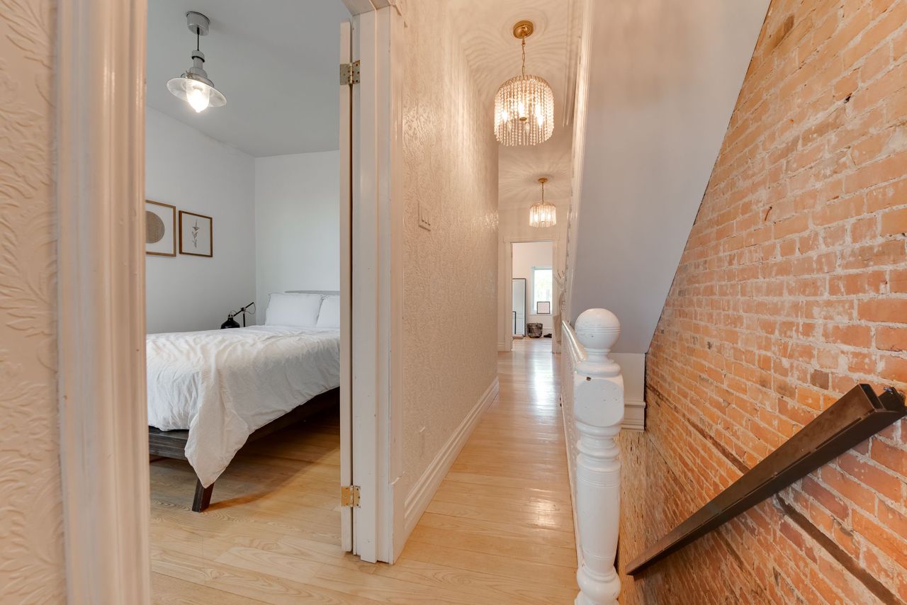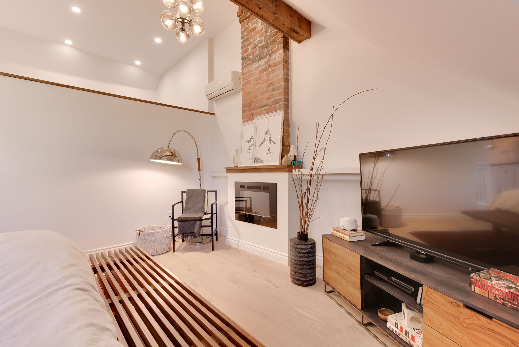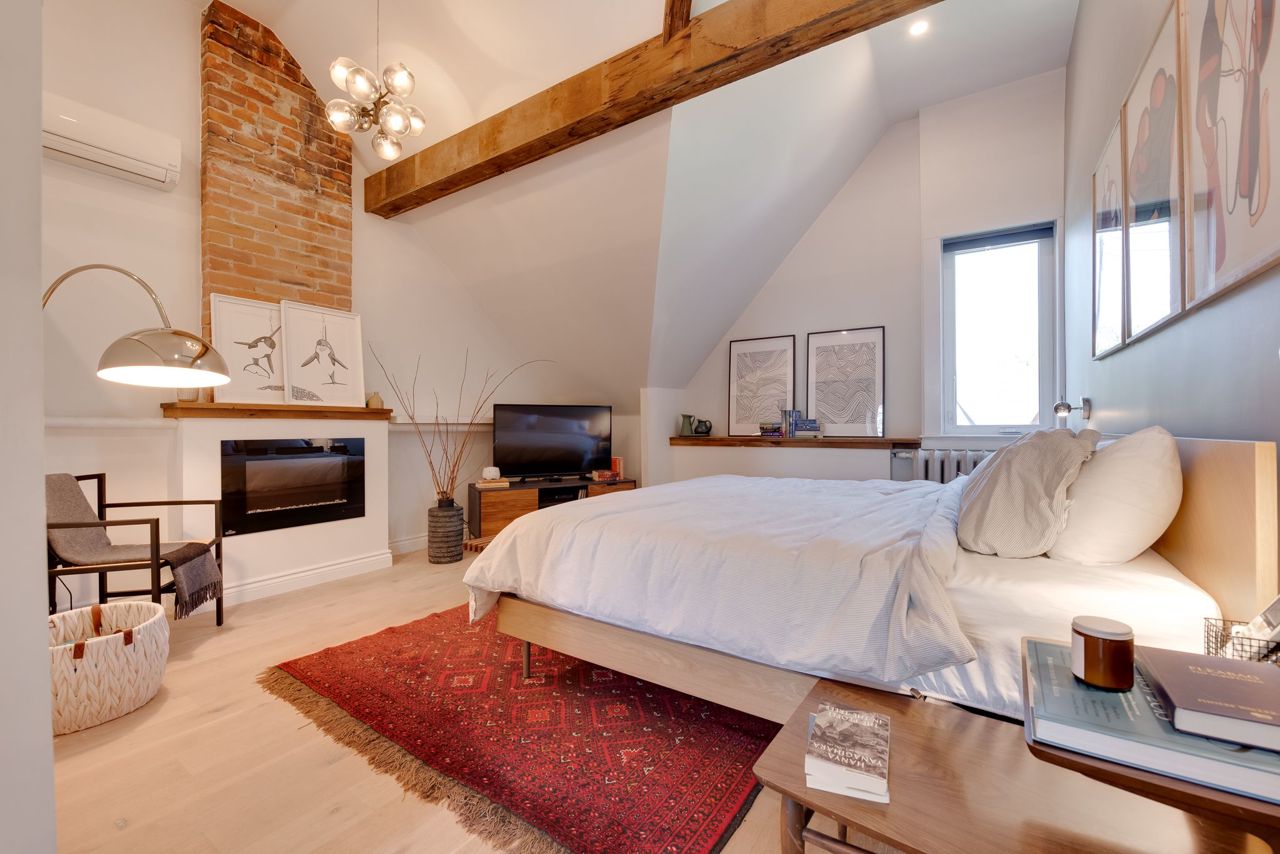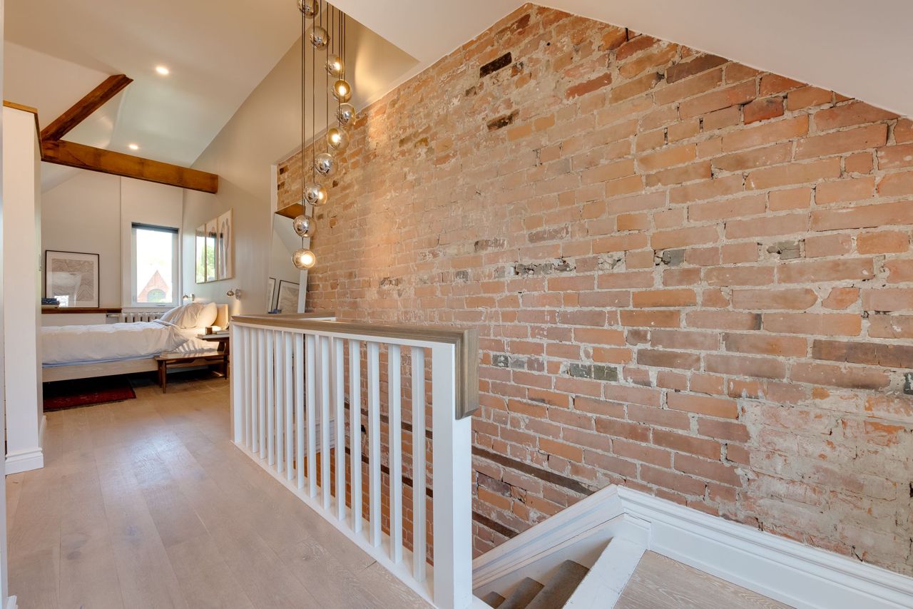 Hardwood Floor Large Window Brick Fireplace