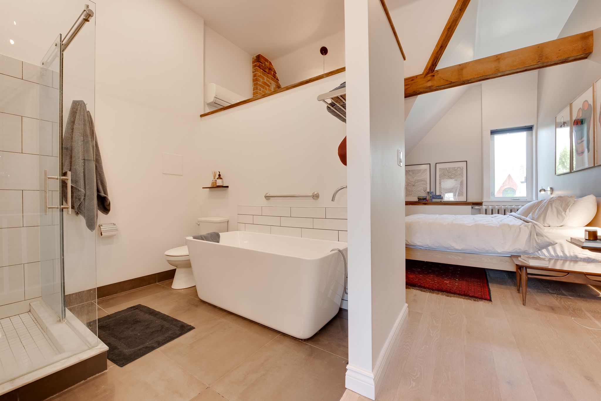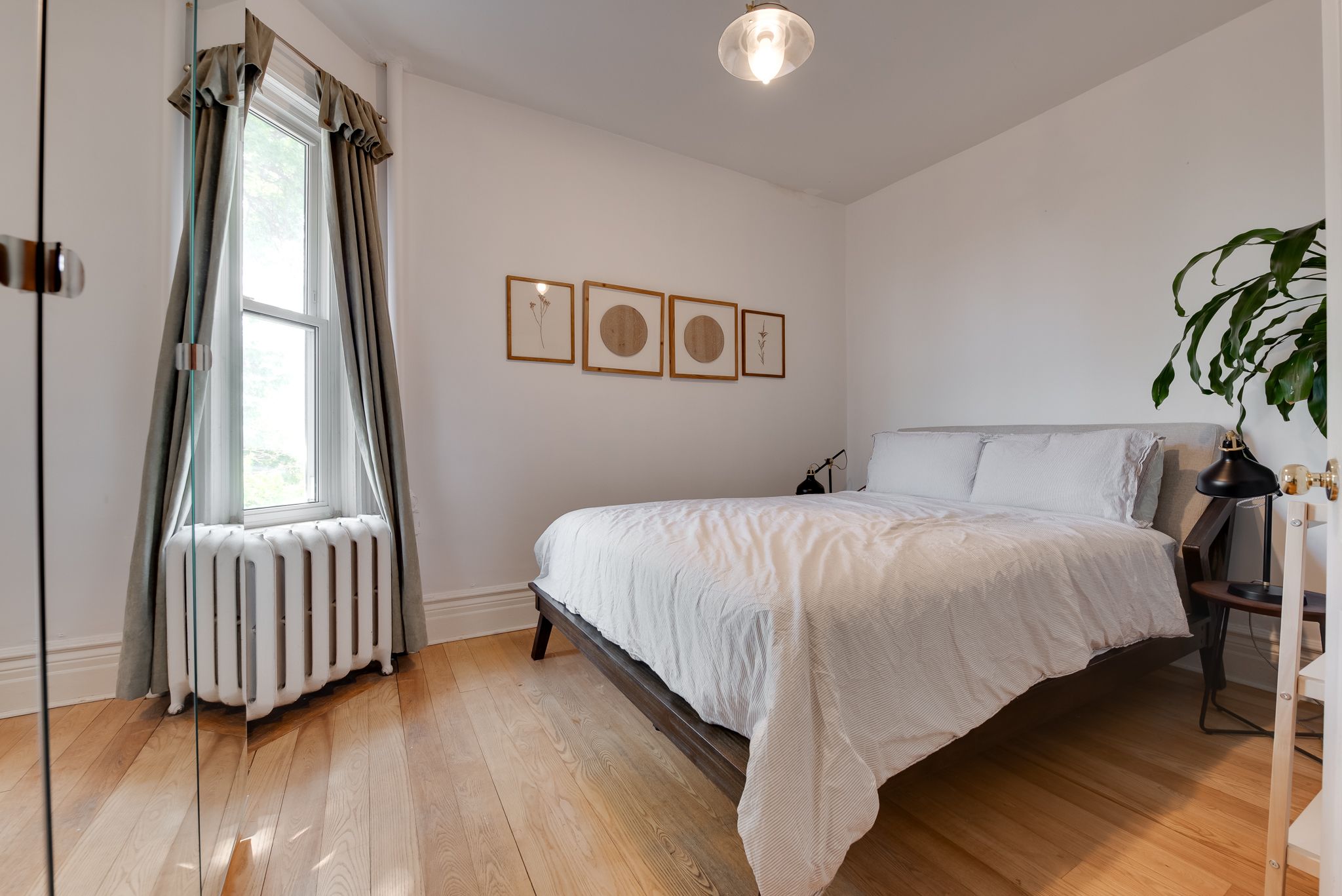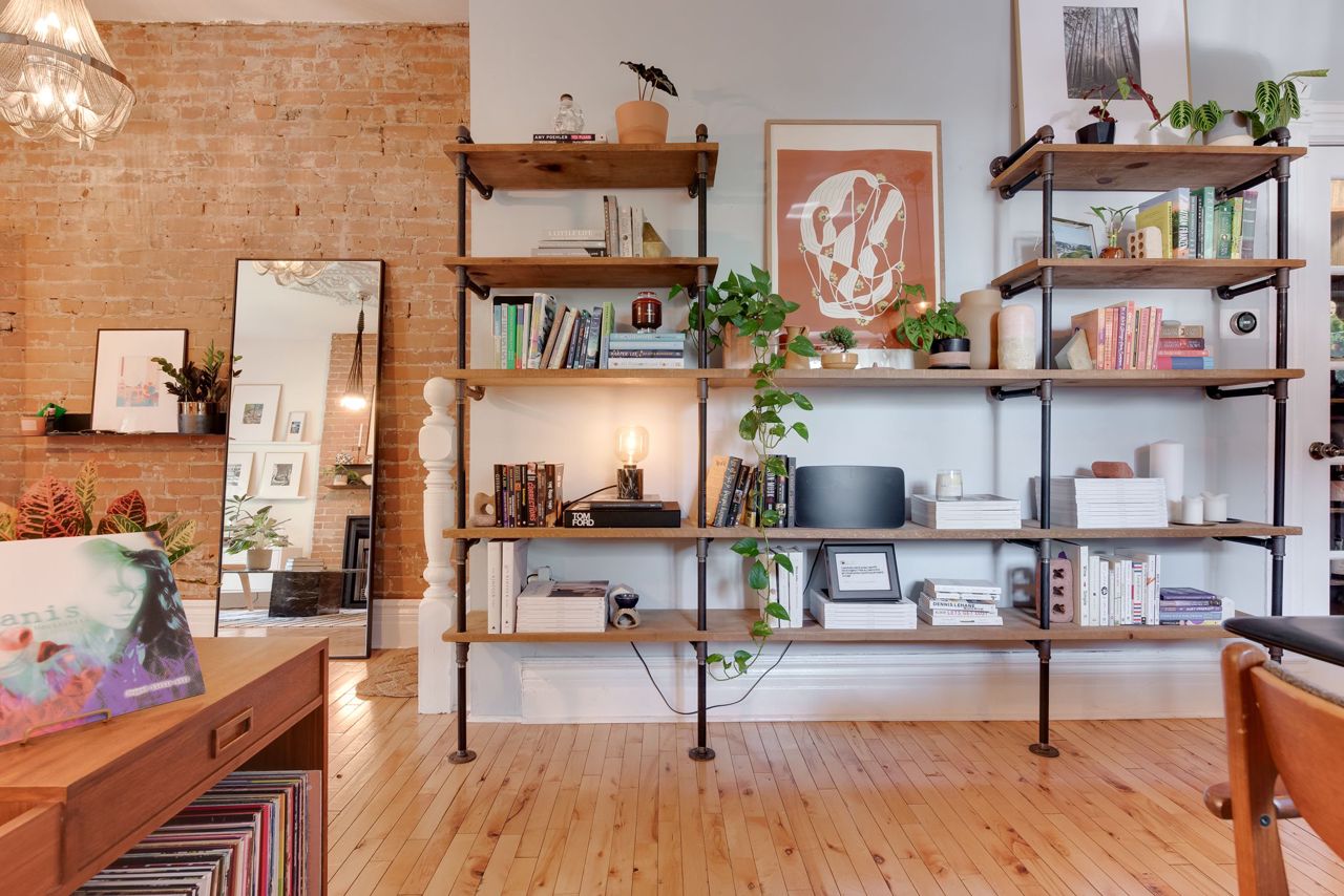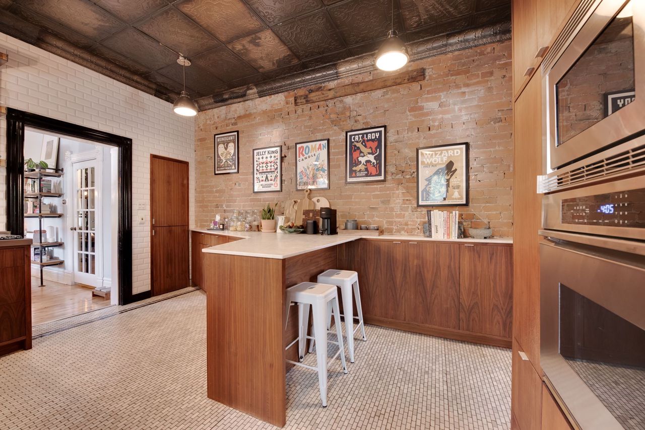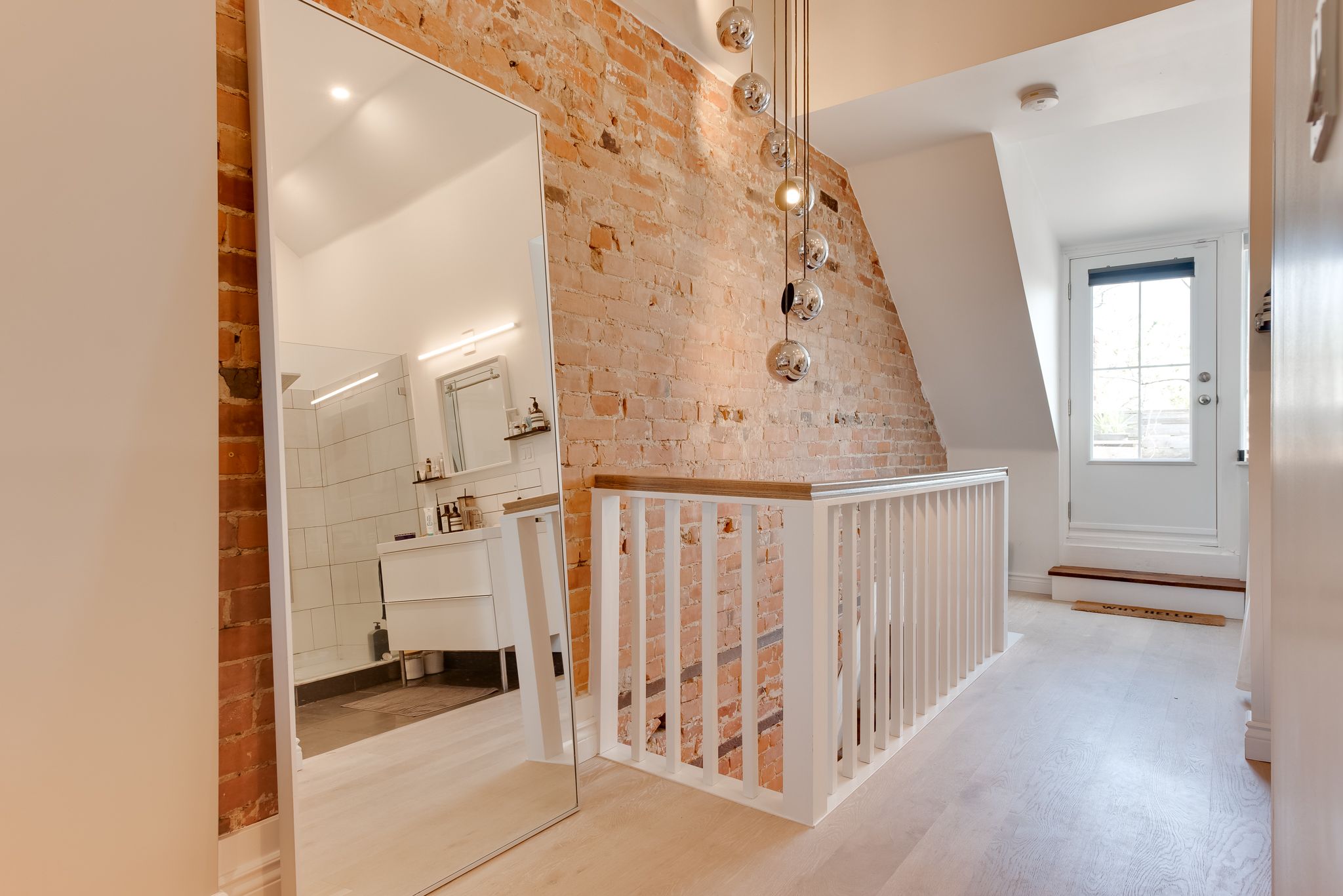 Hardwood Floor Large Window Brick Fireplace
