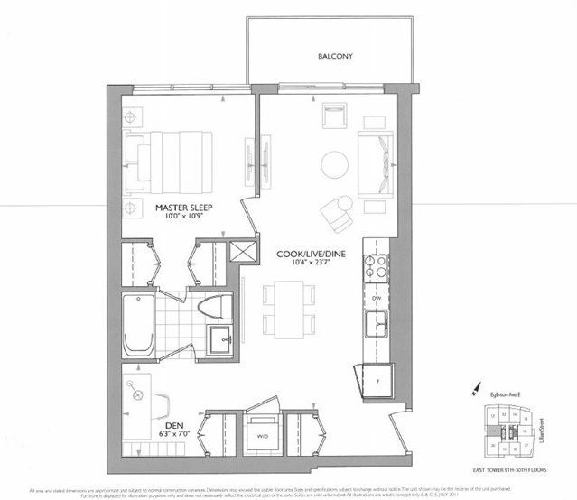 "Welcome To Elegant Madison Condo" 1Bed+Den(598 Sqft)+Balcony(60Sqft) ,.Open Concept Floor Plan And Ceiling To Bottom Large Window, Laminate Floor Throughout The Unit. Functional Layout, His/Her Closets In Master, Walk-Thru Bathroom To Den. Den Has Closet And Can Use As A Office, Building Has Already Opened LCBO And Loblaws m Steps To TTC , Subway, LRT(Coming soon), Restaurants, Movies, Schools, And Parks.Stainless Steels Appliances (Dishwasher,Microwave,Oven,Fridge) ,Washer/Dryer, All Window Blinds, All Light Fixtures and Parking (P5-140 )