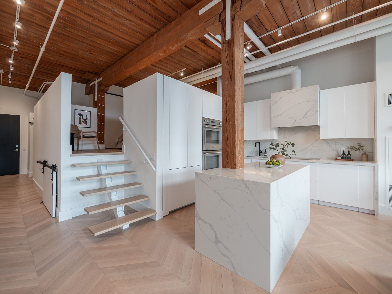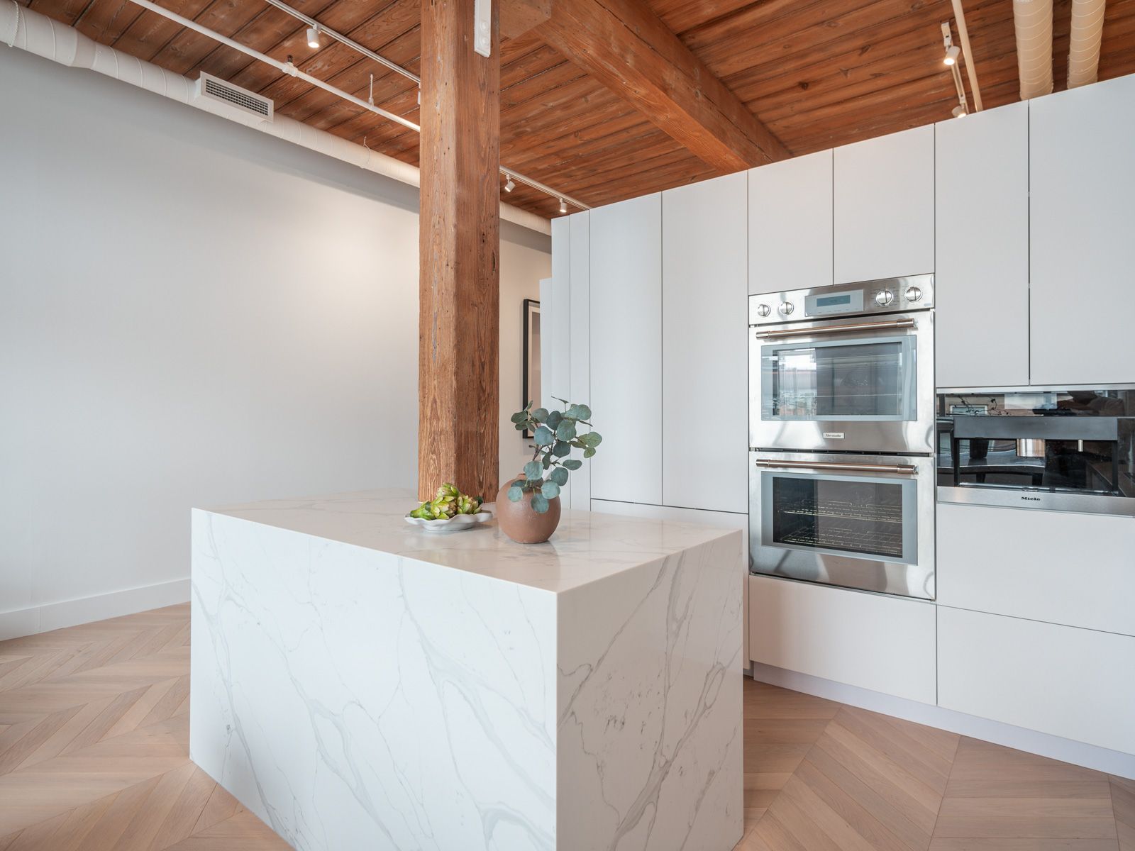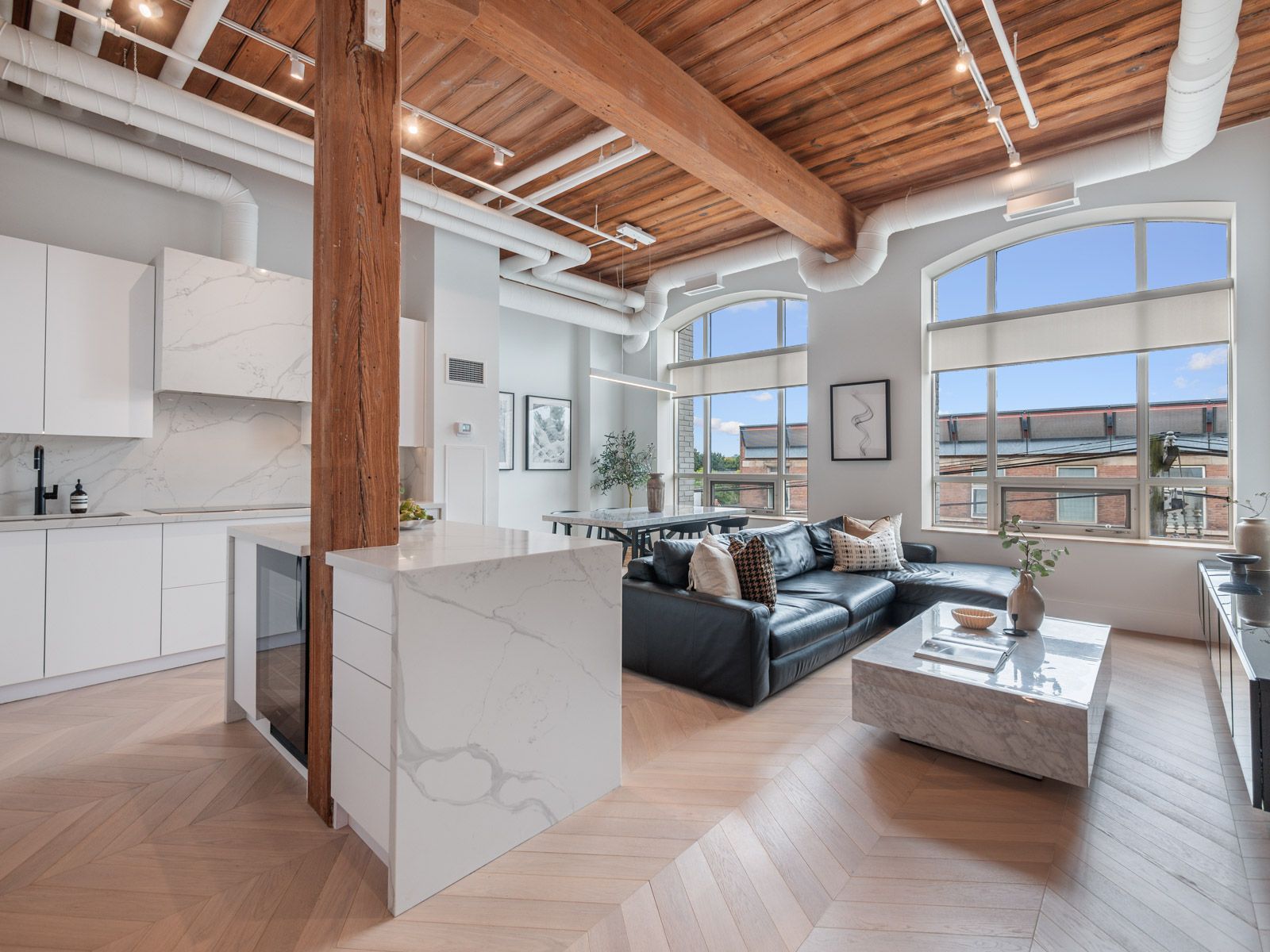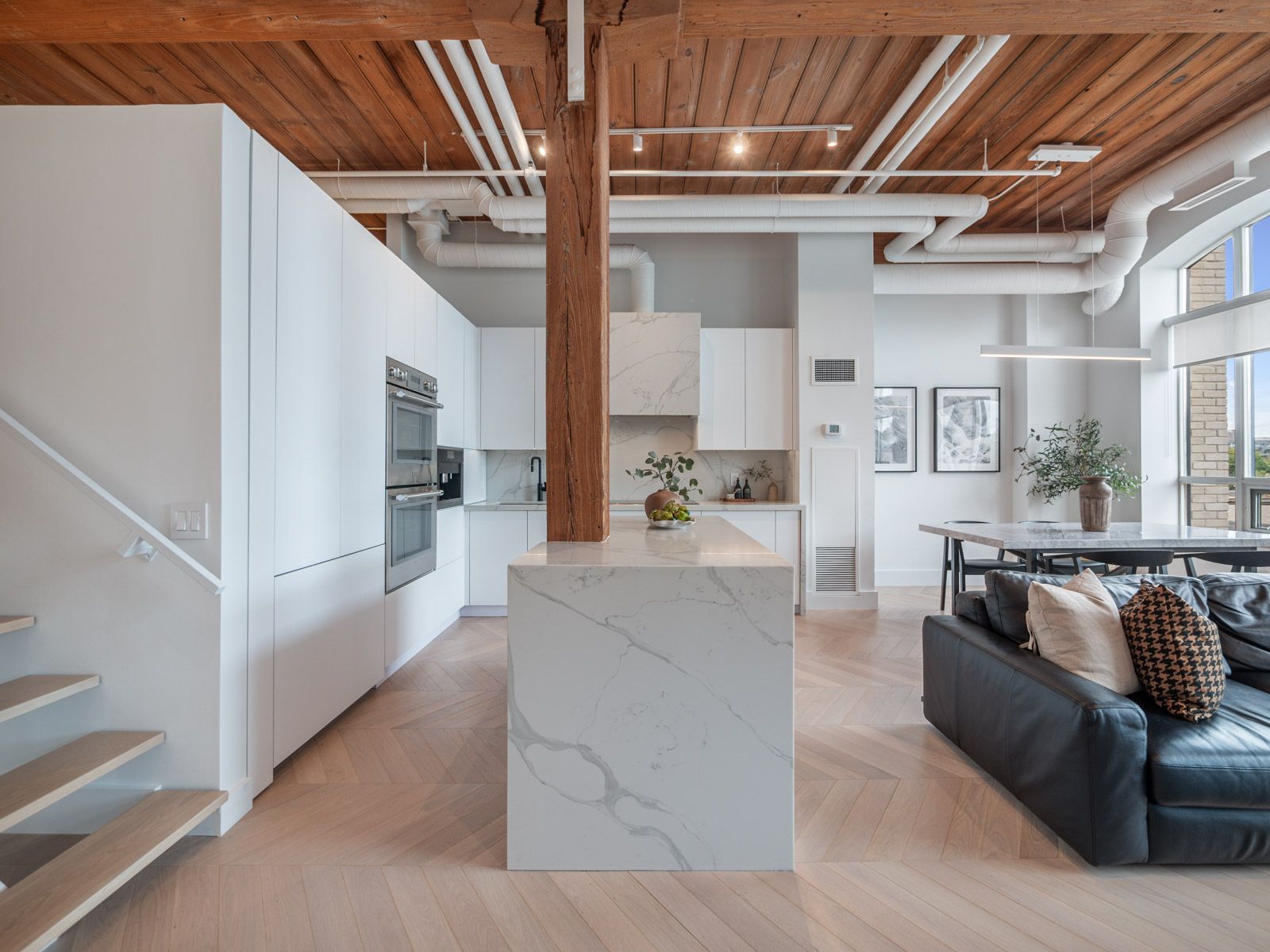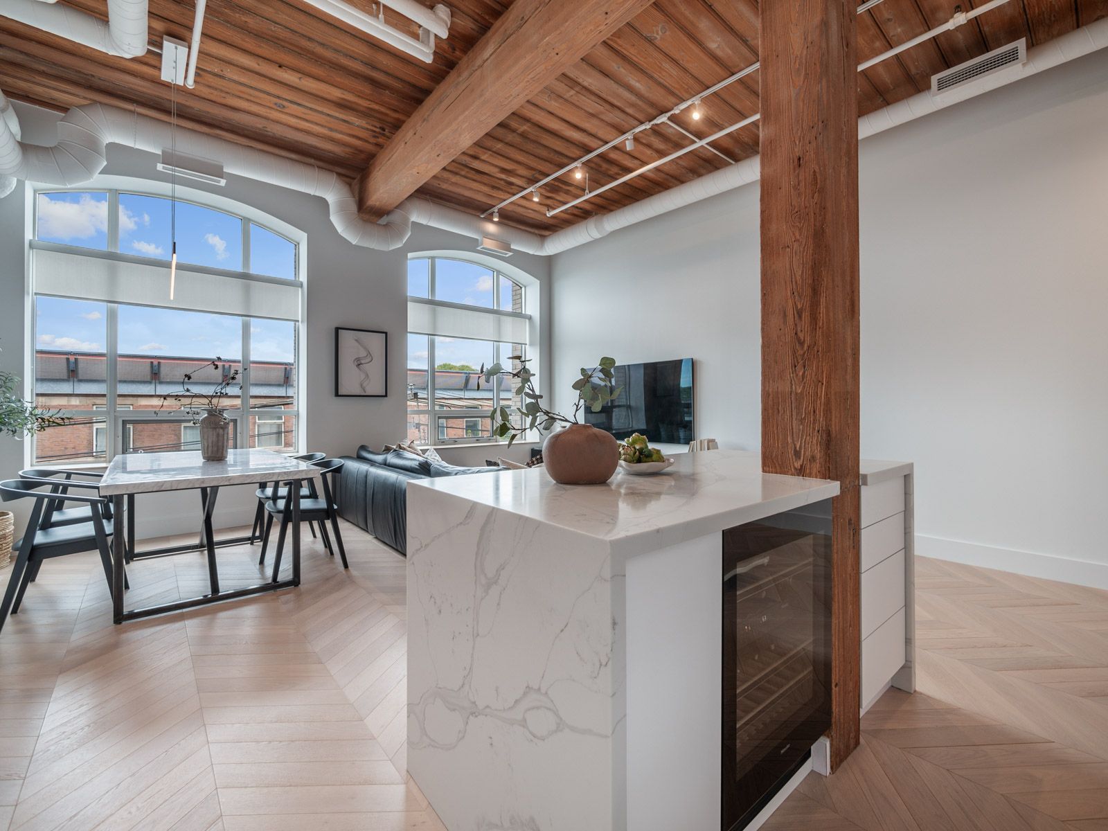 Calling all modern minimalists with a “sweet spot” for character and charm... Unwrap this rarely available opportunity at the Candy Factory Lofts! The building was converted in the early 2000s, and since then, many of the units have remained untouched. Suite 317 will set you apart from the rest, in this newly reimaged space. Expansive gallery walls welcome you in the space, perfect for hanging a collection of curated art. Chevron flooring will guide you down the corridor and into the open-concept living/entertaining room. The kitchen was remodeled to allow for extra storage while concealing the built-in fridge, Miele espresso machine, and wine bar. Caesarstone slabs flow from island to countertops and even wrap the rangehood. Entertain with friends in the dedicated dining space, or unwind in the TV area. In both spaces, ample natural light flows in from its arched windows. The lofted bedroom was redesigned to offer more space, and closets were customized to maximize storage!The one-of-a-kind bathroom is sweeter than any candy ever made in the building! From its marble-inspired slabs to its spacious shower – no expense was spared when it came to including its rainfall fixtures and illuminated mirror.