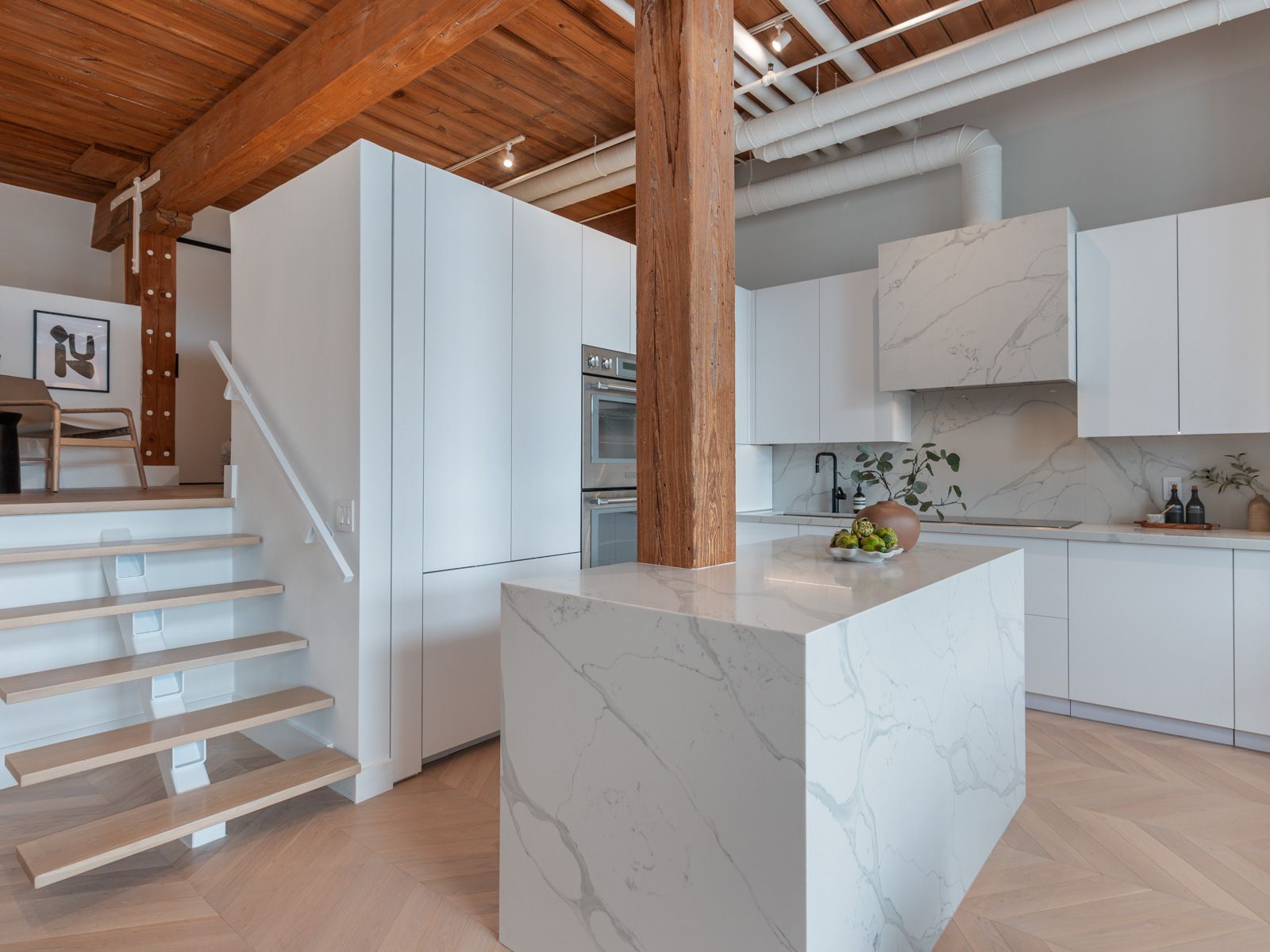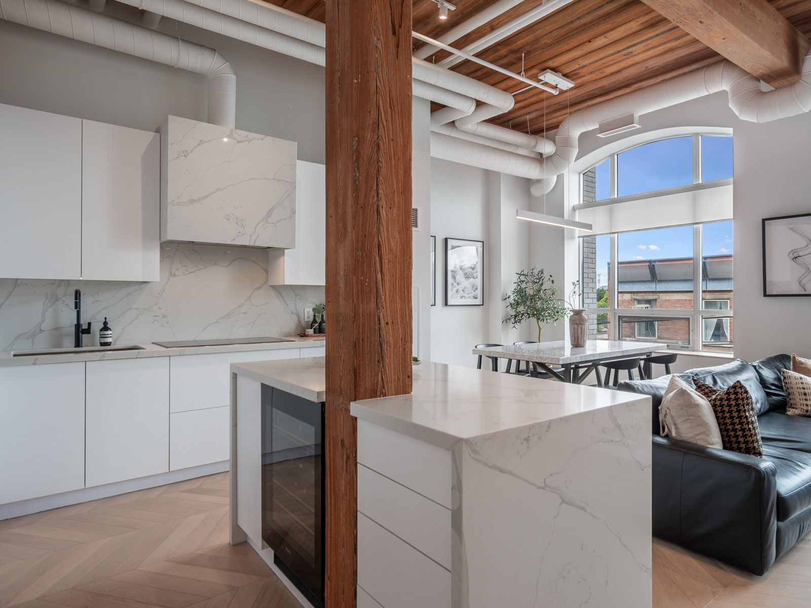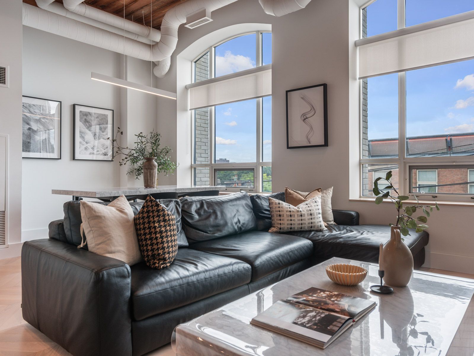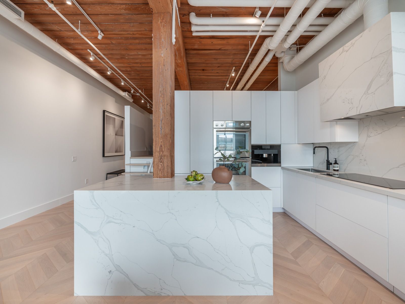 Calling all modern minimalists with a “sweet spot” for character and charm... Unwrap this rarely available opportunity at the Candy Factory Lofts! The building was converted in the early 2000s, and since then, many of the units have remained untouched. Suite 317 will set you apart from the rest, in this newly reimaged space. Expansive gallery walls welcome you in the space, perfect for hanging a collection of curated art. Chevron flooring will guide you down the corridor and into the open-concept living/entertaining room. The kitchen was remodeled to allow for extra storage while concealing the built-in fridge, Miele espresso machine, and wine bar. Caesarstone slabs flow from island to countertops and even wrap the rangehood. Entertain with friends in the dedicated dining space, or unwind in the TV area. In both spaces, ample natural light flows in from its arched windows. The lofted bedroom was redesigned to offer more space, and closets were customized to maximize storage!The one-of-a-kind bathroom is sweeter than any candy ever made in the building! From its marble-inspired slabs to its spacious shower – no expense was spared when it came to including its rainfall fixtures and illuminated mirror.