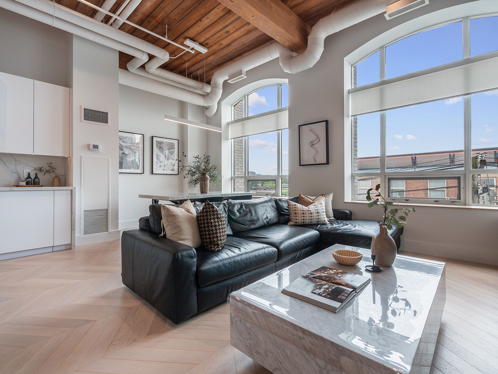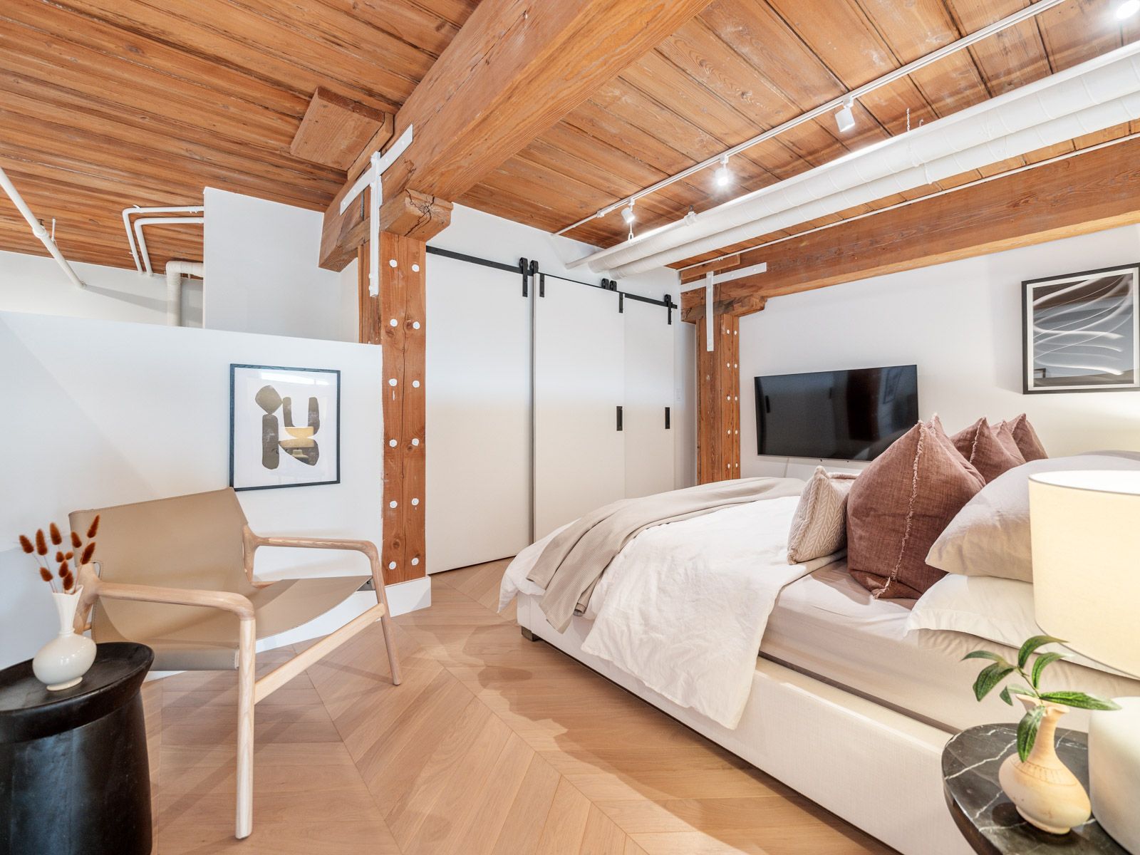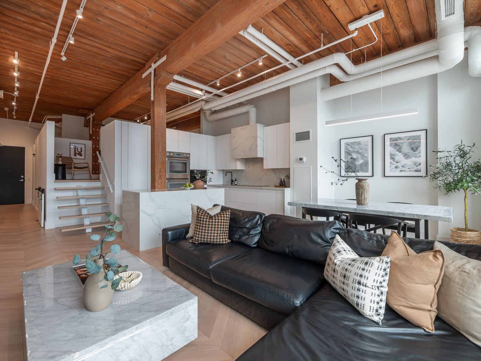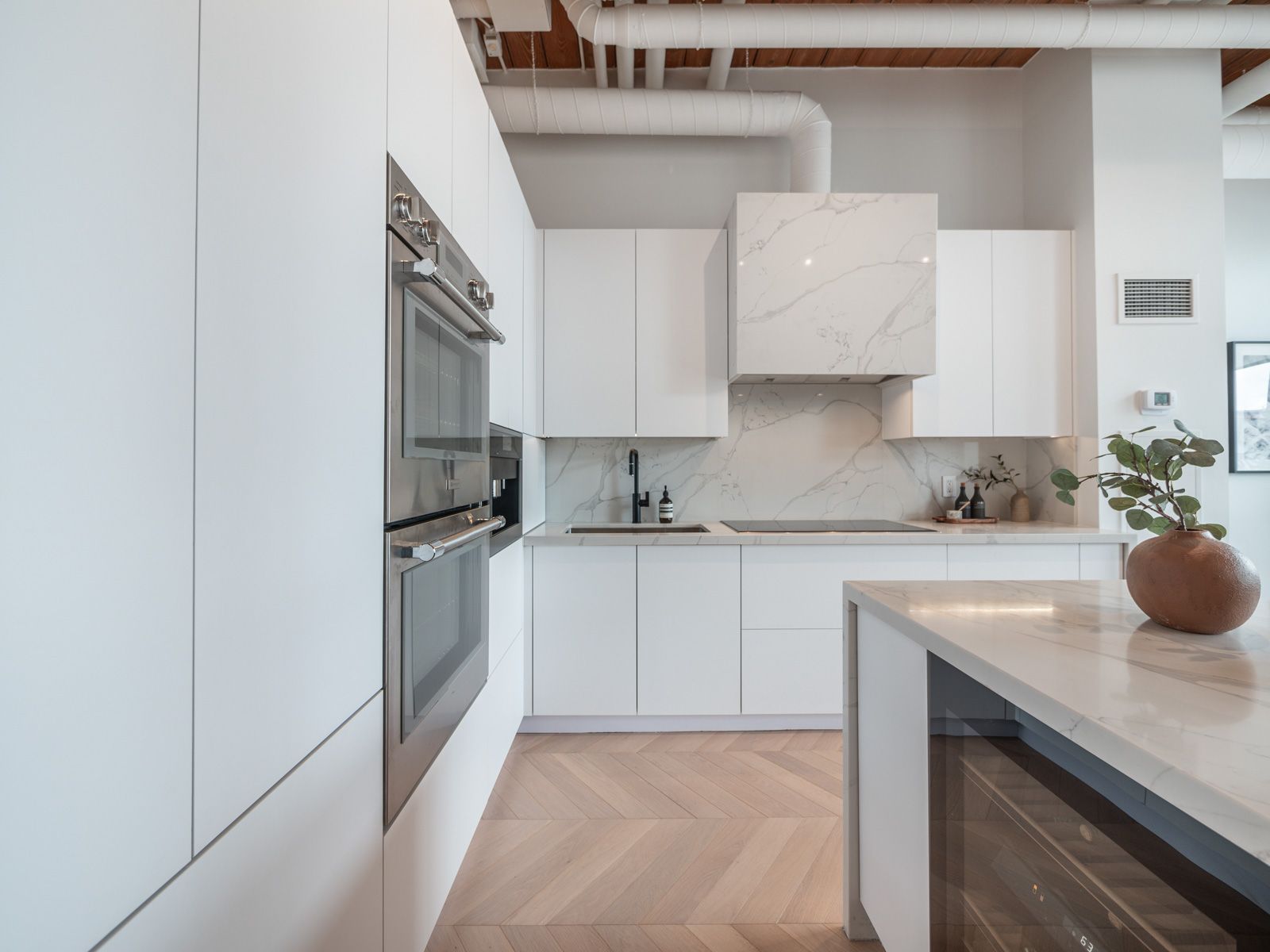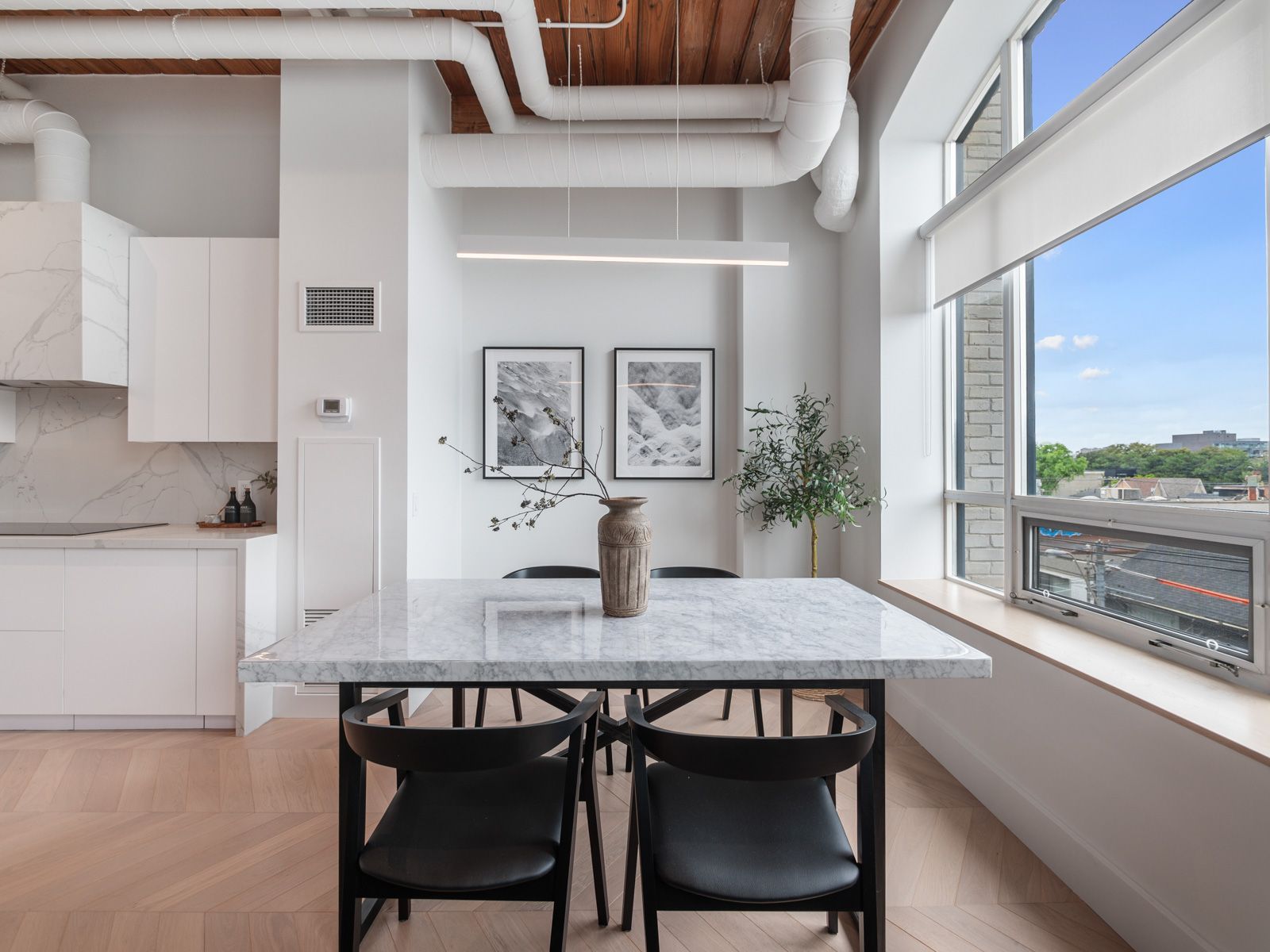 Calling all modern minimalists with a “sweet spot” for character and charm... Unwrap this rarely available opportunity at the Candy Factory Lofts! The building was converted in the early 2000s, and since then, many of the units have remained untouched. Suite 317 will set you apart from the rest, in this newly reimaged space. Expansive gallery walls welcome you in the space, perfect for hanging a collection of curated art. Chevron flooring will guide you down the corridor and into the open-concept living/entertaining room. The kitchen was remodeled to allow for extra storage while concealing the built-in fridge, Miele espresso machine, and wine bar. Caesarstone slabs flow from island to countertops and even wrap the rangehood. Entertain with friends in the dedicated dining space, or unwind in the TV area. In both spaces, ample natural light flows in from its arched windows. The lofted bedroom was redesigned to offer more space, and closets were customized to maximize storage!The one-of-a-kind bathroom is sweeter than any candy ever made in the building! From its marble-inspired slabs to its spacious shower – no expense was spared when it came to including its rainfall fixtures and illuminated mirror.