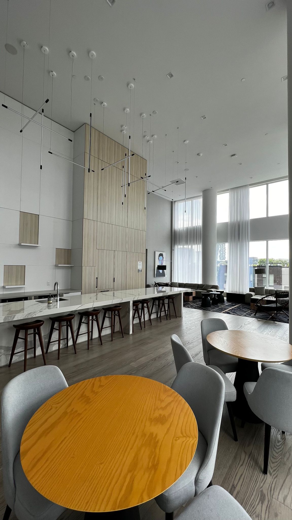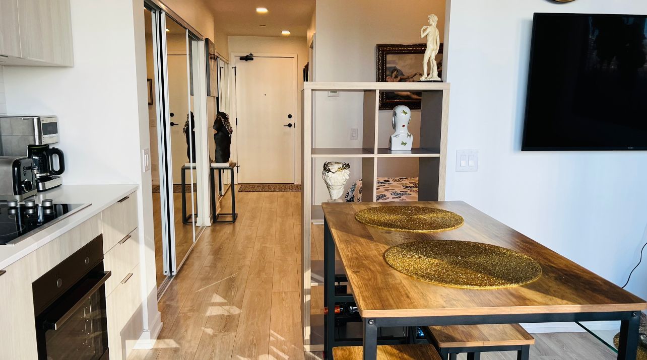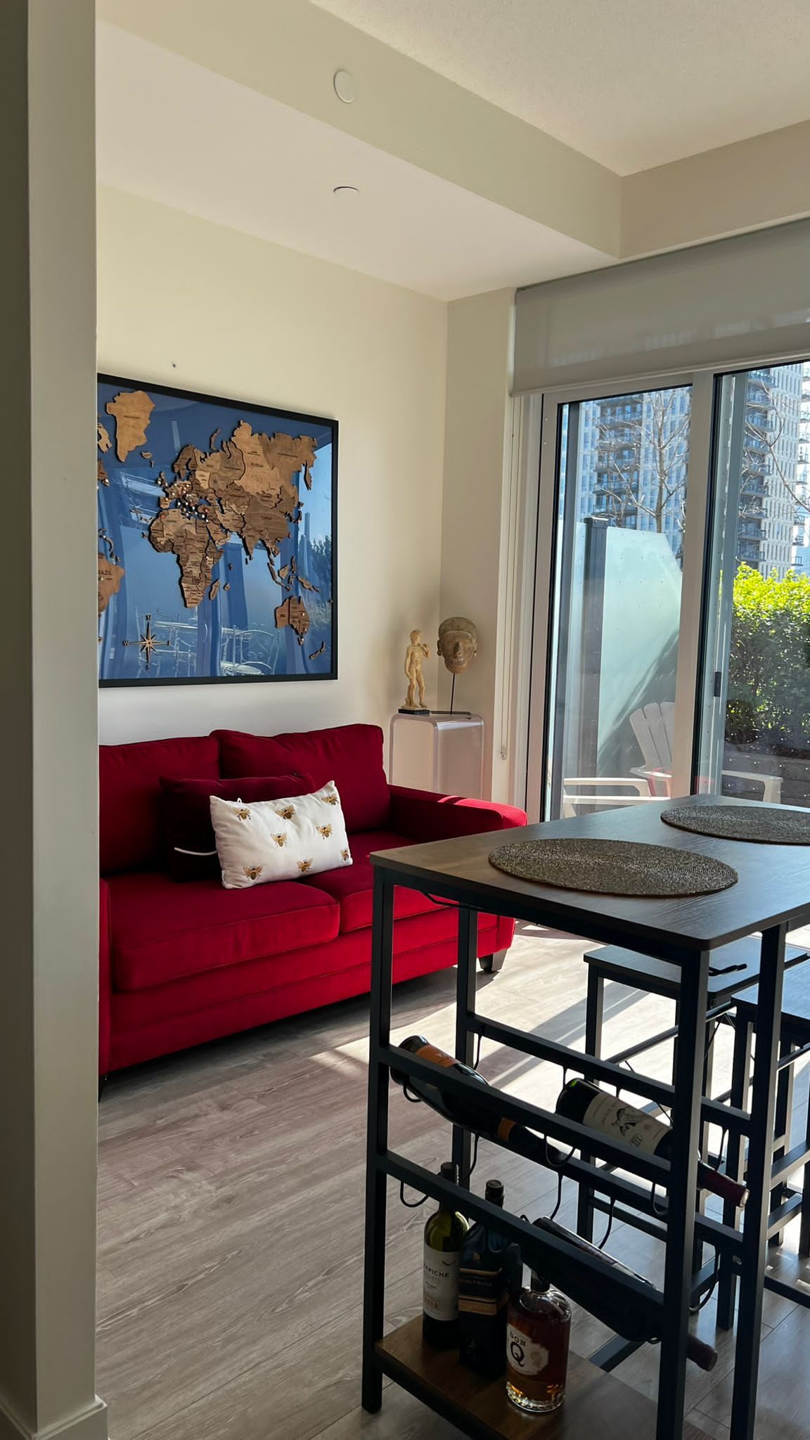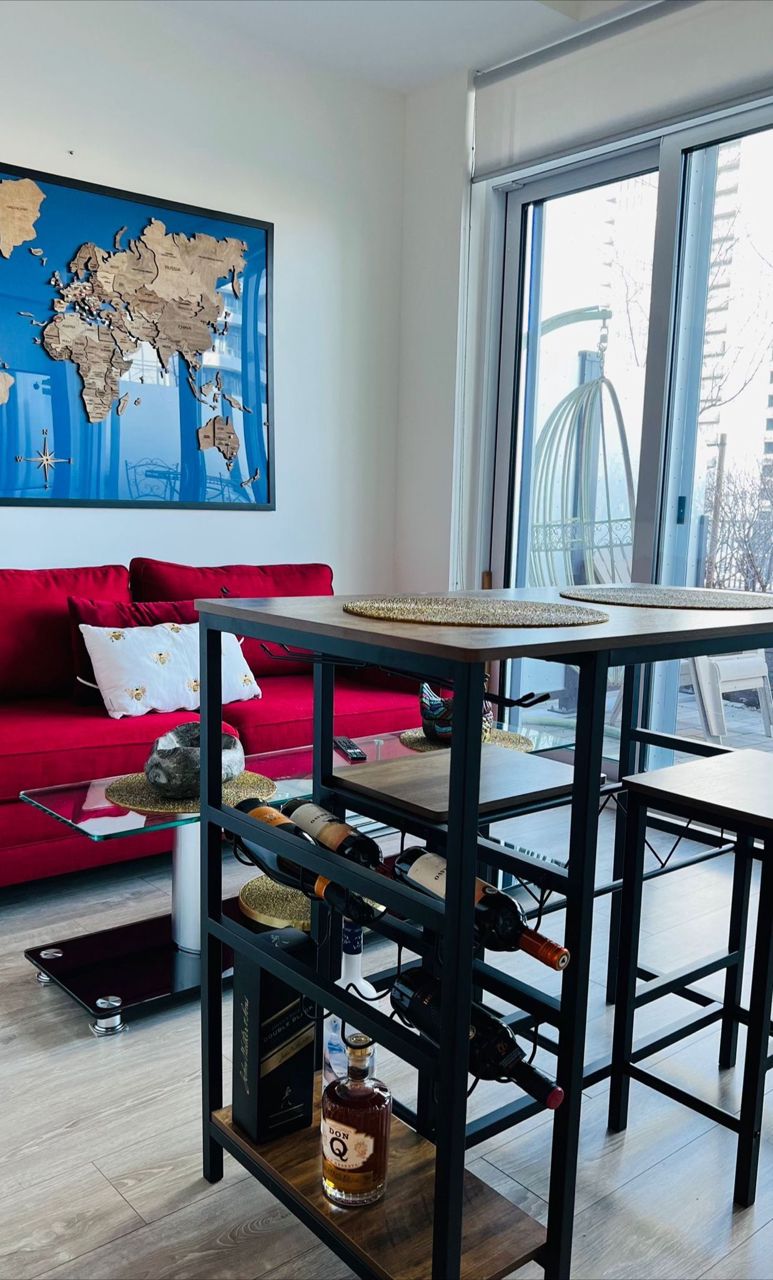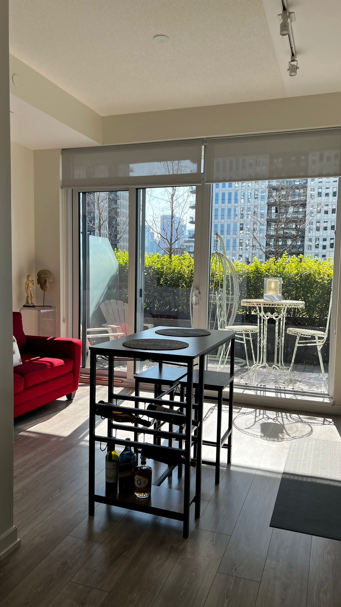 Extras: Excellent Building Amenities Include: Fitness Centre, Rock Climbing, Party Room, Lounge and Media Room, Outdoor Terrace with Barbecues, 24 Hour Concierge, Visitor Parking, Guest Suites, and Bike Storage.Fridge, Cooktop/Oven, Dishwasher, Washer, Dryer, Light Fixtures, Window Coverings, a beautiful Bed, Sony TV, high quality fabric sofa, beautiful paintings and accessories. High quality dishes from the bay! Dining Table Set With 2 Bar Stools
