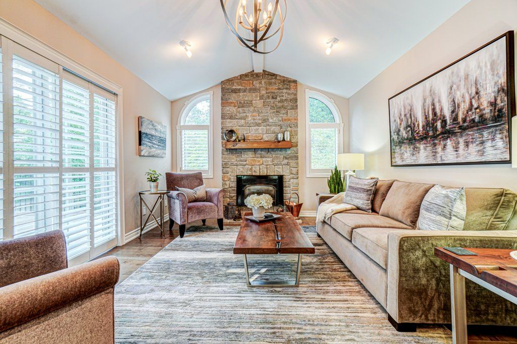 Hardwood Floor Brick Fireplace Vaulted Ceiling