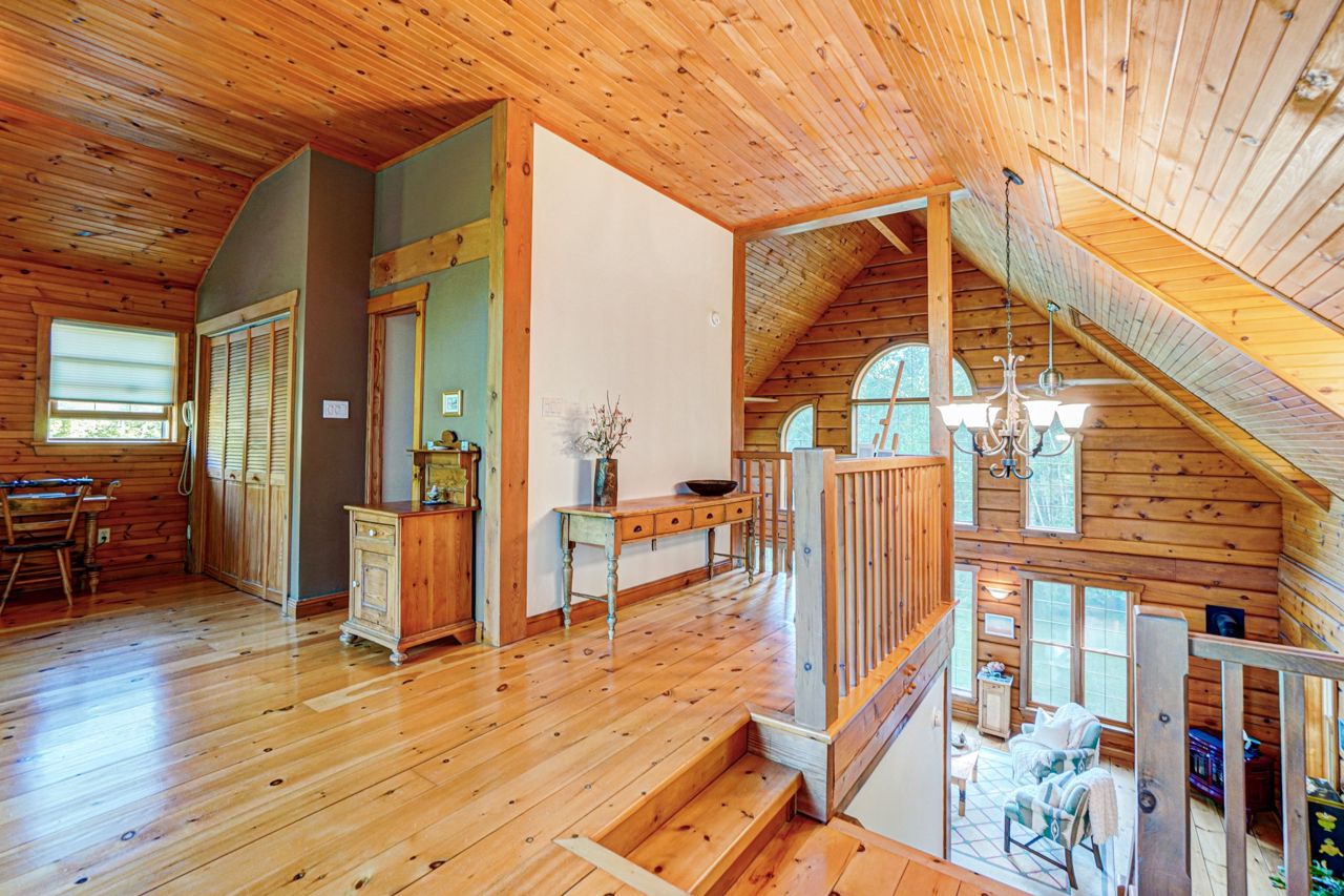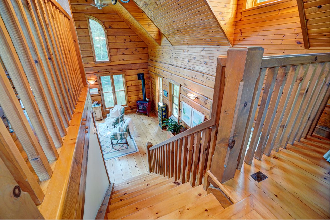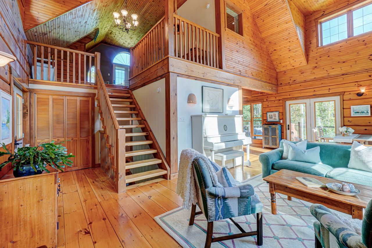 Within this move in ready home are 27' Cathedral Ceiling living and dinning room with breathtaking south / west exposure views. This home features Immaculate 9" pine floors throughout main and upper levels of the home, efficient radiant heat throughout main & lower level floors. 2 bedroom, 2 bathrooms, primary bedroom loft w/10' ceiling and 4 pc Ensuite, 2nd bedroom on Main level presently used as Office, 2nd 4pc bathroom on Ground level