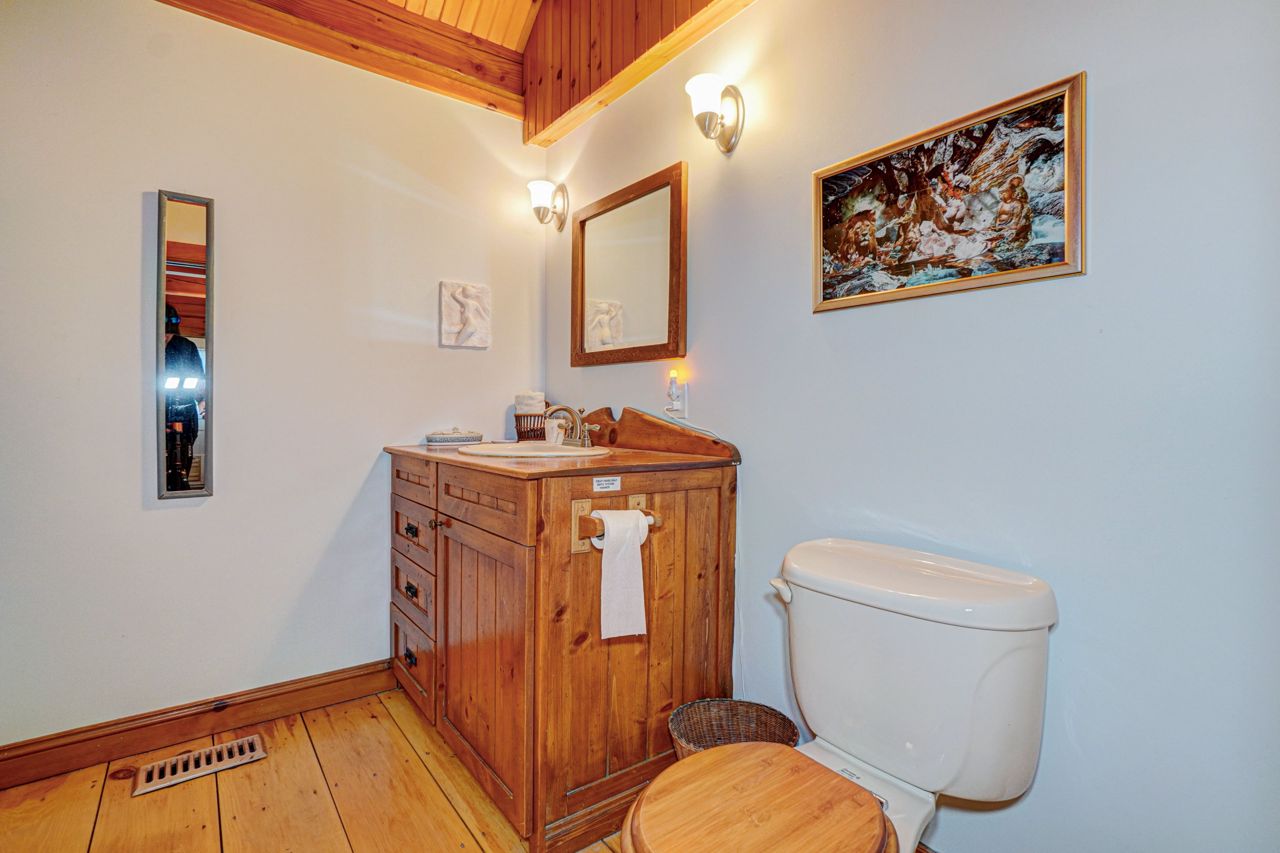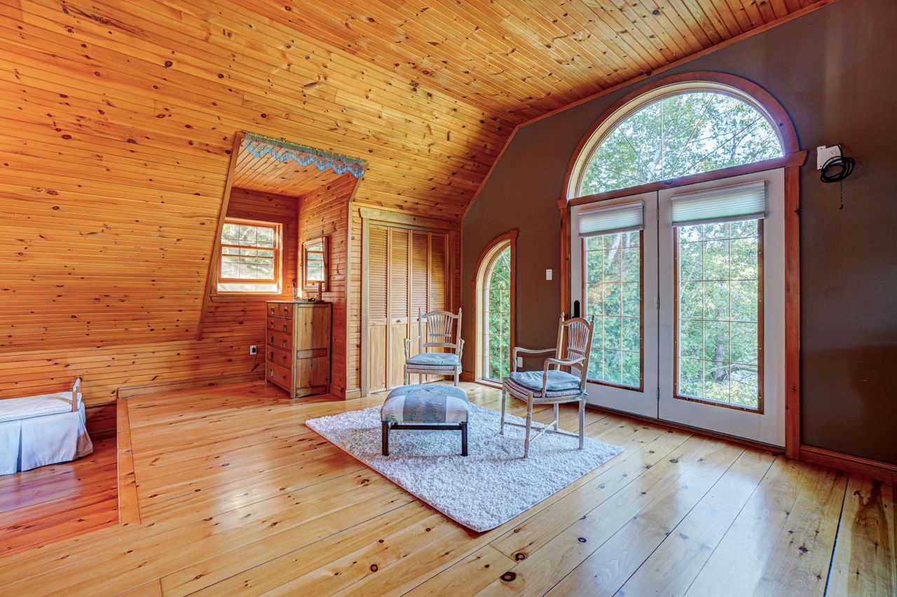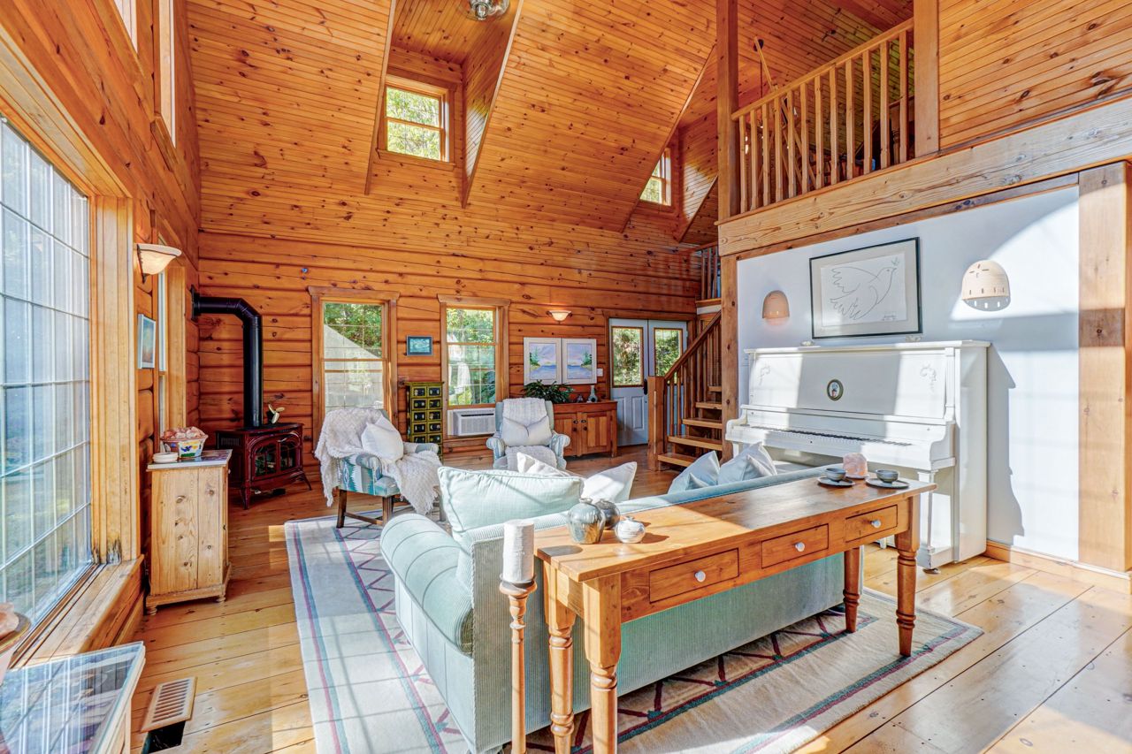 Within this move in ready home are 27' Cathedral Ceiling living and dinning room with breathtaking south / west exposure views. This home features Immaculate 9" pine floors throughout main and upper levels of the home, efficient radiant heat throughout main & lower level floors. 2 bedroom, 2 bathrooms, primary bedroom loft w/10' ceiling and 4 pc Ensuite, 2nd bedroom on Main level presently used as Office, 2nd 4pc bathroom on Ground level