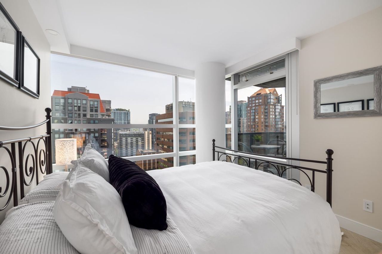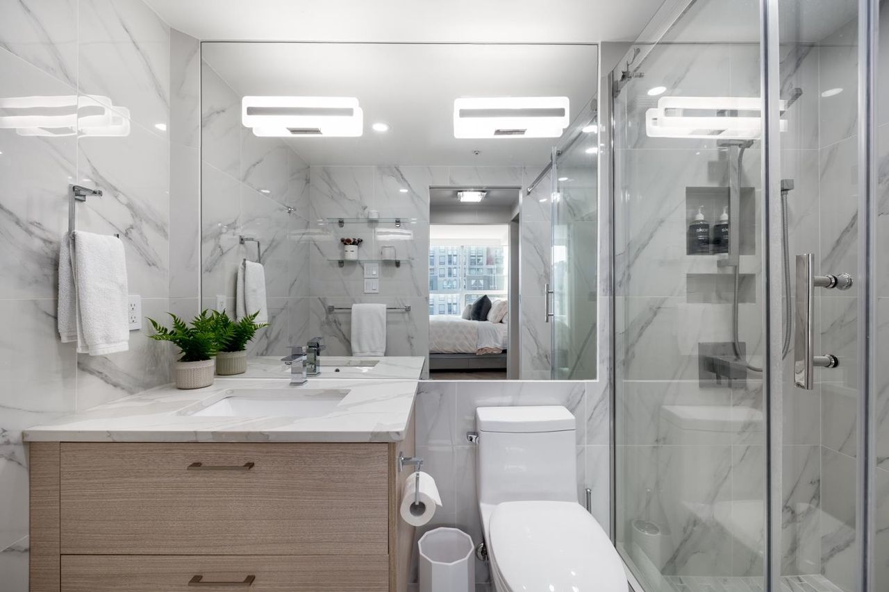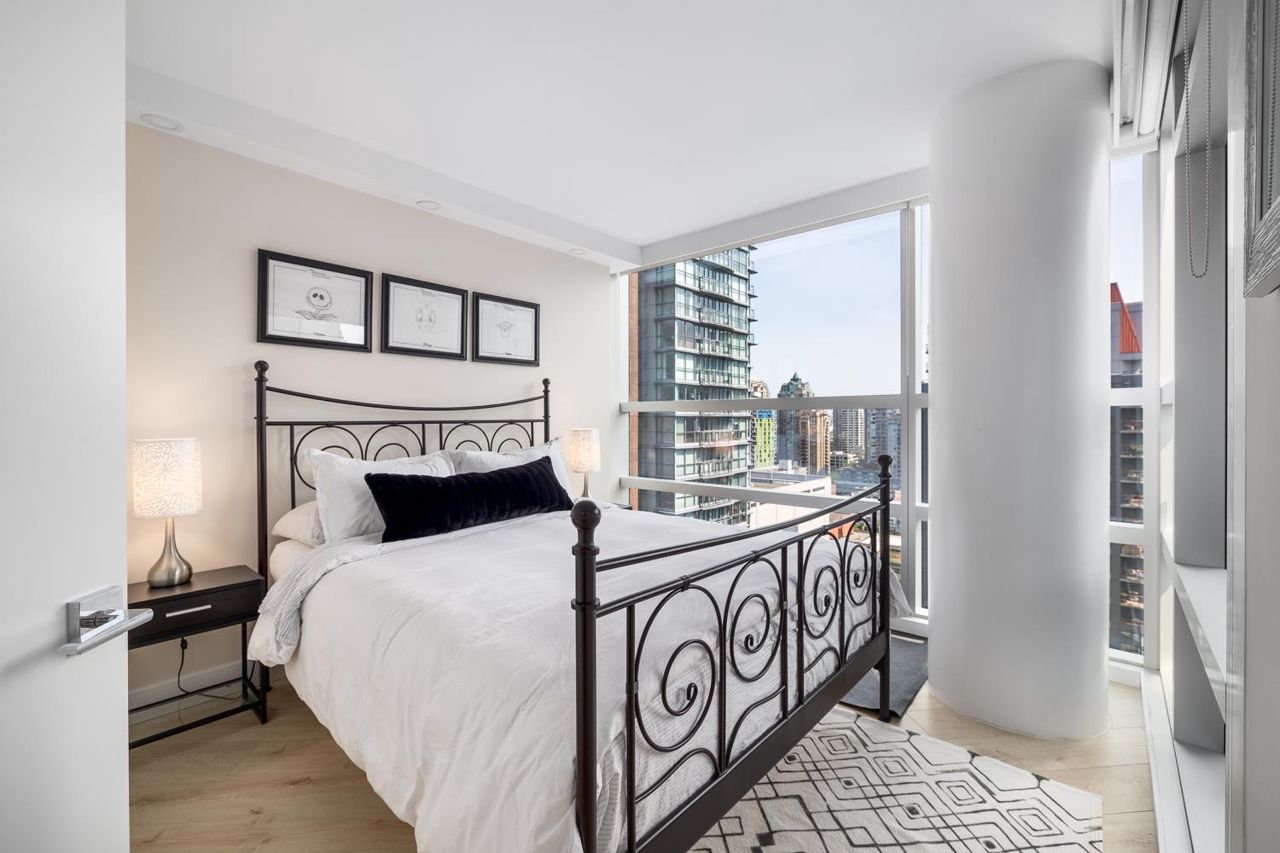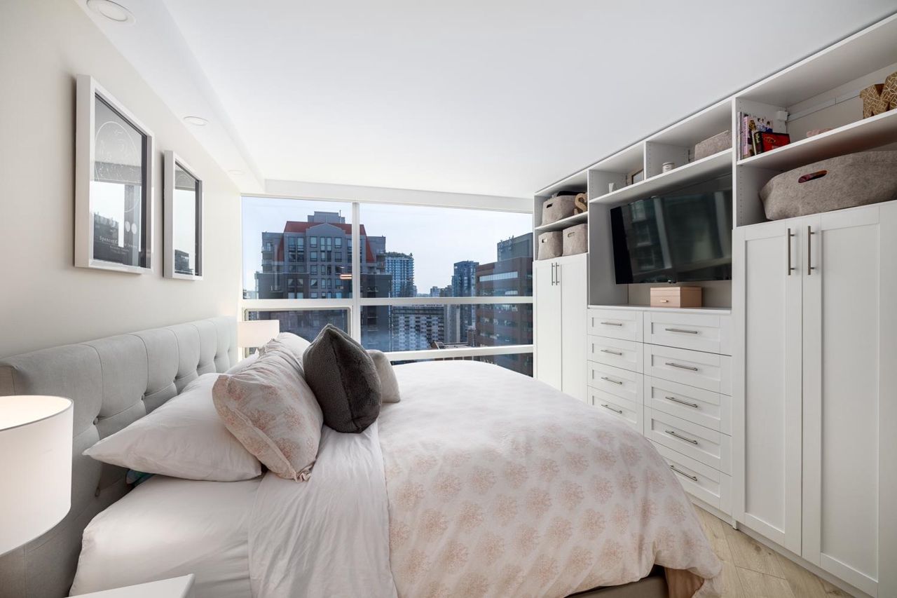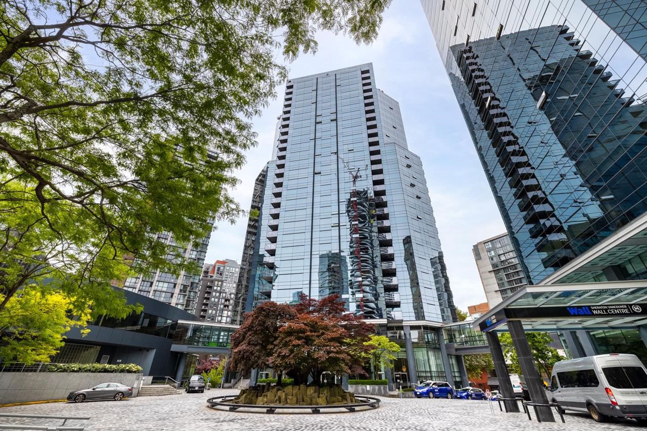 Welcome to the WALL CENTRE! Love this AIR CONDITIONED 2 bedroom 2 bathroom home perched high up in the sky. This dreamy urban chic airy apartment of 1,068 SF is tastefully renovated in a neutral calm colour palette with high end finishes throughout including: BOSCH built-in appliances, wine fridge, quartz counter tops, custom cabinetry, laminate flooring, spa-like baths clad in marble, built-in bedroom wall storage, automated roller shades, new heat pump & more. This iconic building is centrally located in the heart of downtown close to top rated dining, shopping, entertainment & sporting venues, the seawall & skytrain. The Wall Centre grants residences access to the hotel health club for a small fee. Parking, storage, pets & short term rentals allowed.
