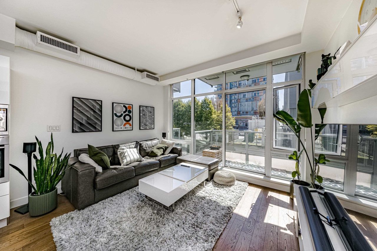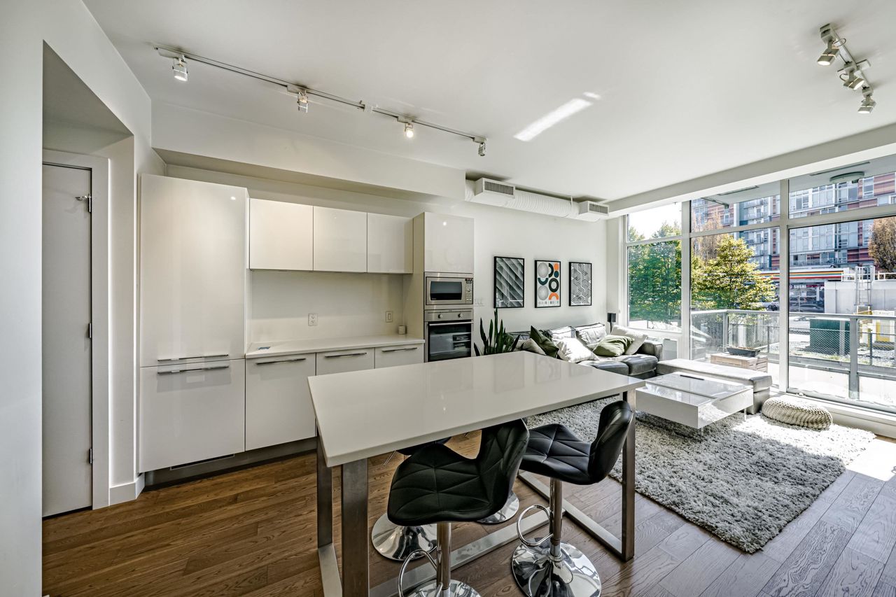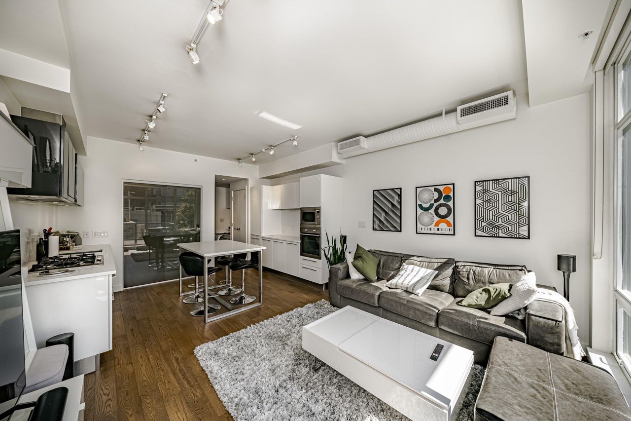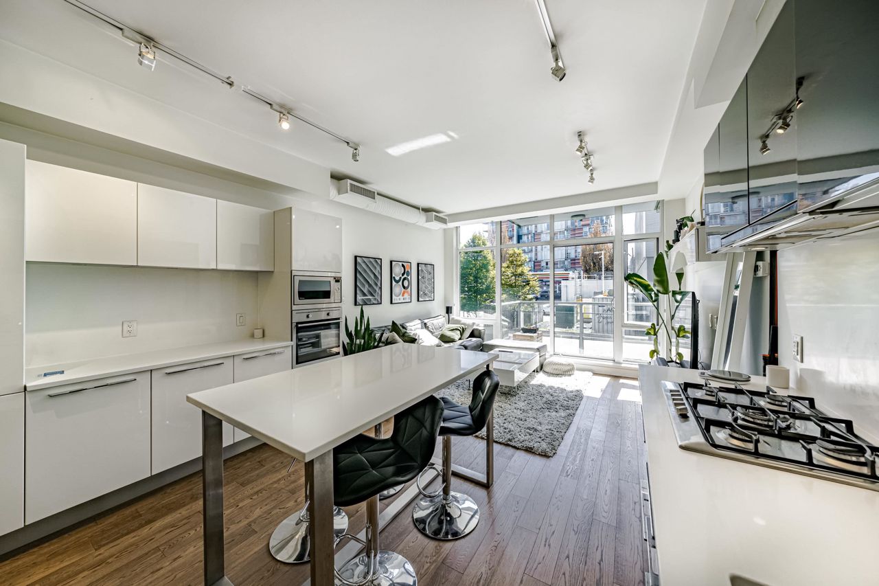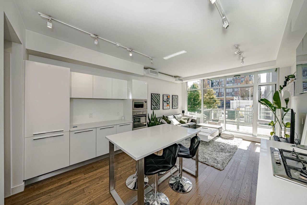 This is it! 638 square feet of living space - built by Cressey - you're HOME! This 1 bedroom boasts a spacious living & dining area perfect for entertaining. Classic and tasteful features like gorgeous walnut wood flooring, sleek high gloss cabinets, integrated AEG appliances, built in office nook, luxurious quartz counters & backsplash. The home is heated & cooled w/ a heat pump system & has a good sized balcony. LOTS of closet and storage space, including separate laundry room! This SE False Creek community is walking distance to Olympic Village, Main & Cambie Skytrain, & coffee shops. All the amenities you need: Lounge w/ kitchen, Meeting room, Gym, Rooftop patio.... opportunity knocks!