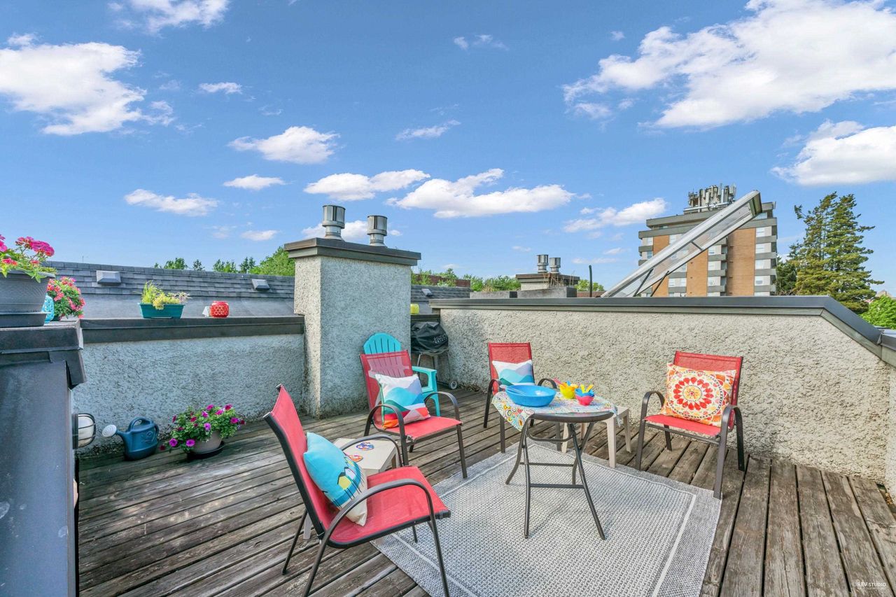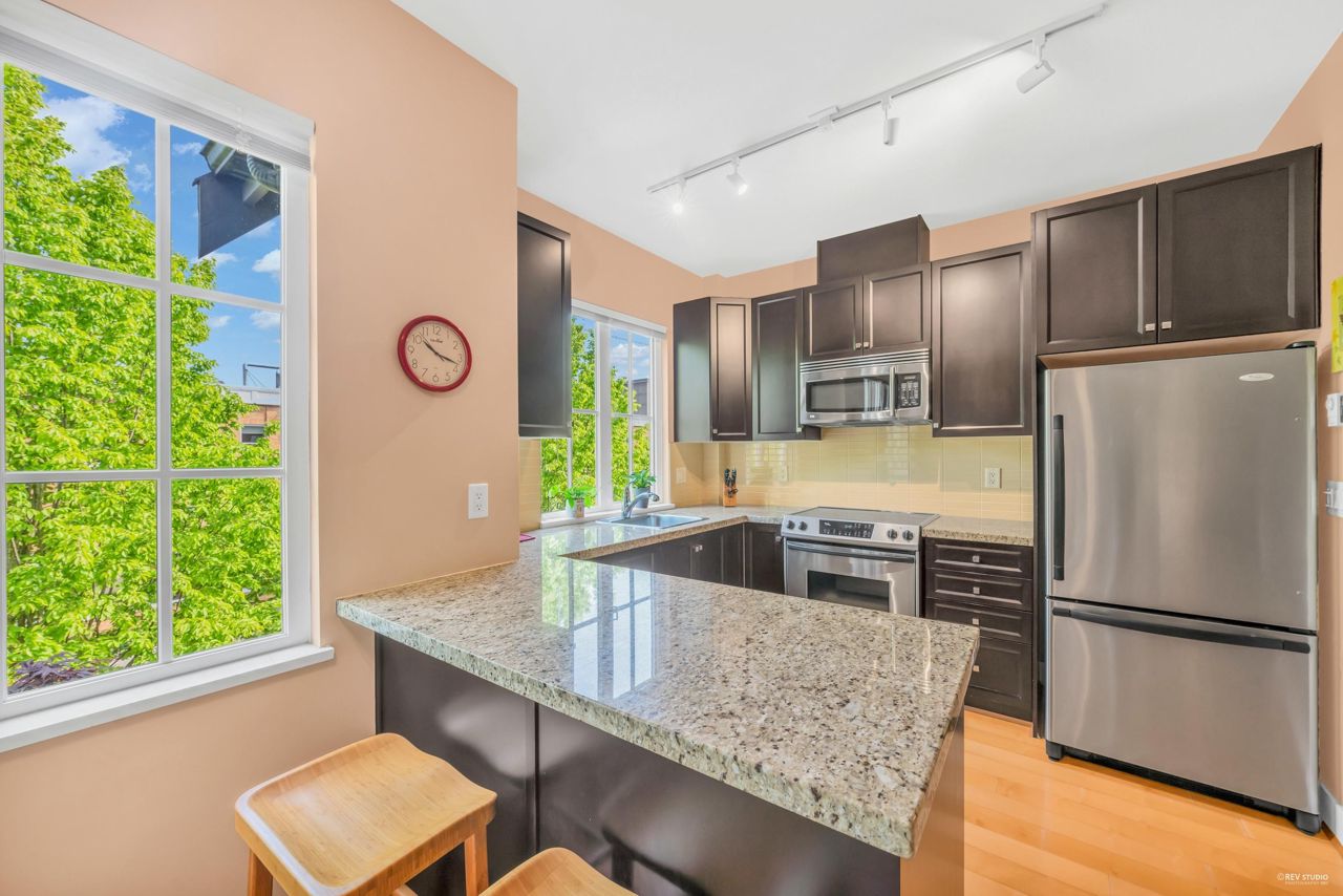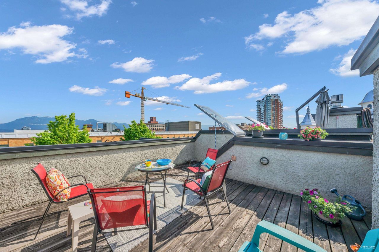 Rarely available 2 Bed. & Den townhouse at Maison in the heart of SOMA. Heritage style boutique complex, crafted by Formwerks. 1 of only 3 units with roof deck & view of North Shore Mountains & Downtown. Layout is great for privacy of your teenager or guests, as bedrooms are separated. Den next to the primary bedroom makes a lovely nursery. A cook's kitchen offers a winter mountain view. Extremely well cared for home. Small friendly strata, with excellent maintenance history. Ditch the car, and shop local - everything you need including future Skytrain station is a short walk away. Quiet treed street with dedicated bike route. A location to be envied. 2 pets OK (cats or dogs). All showings by appointment.