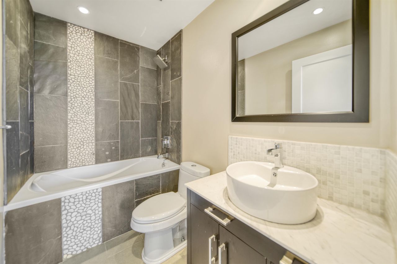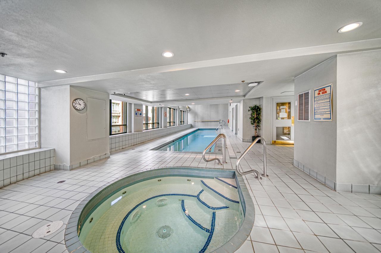 Amazing sunny south facing w/ peek a boo water view spacious 2BR+ Enclosed Solarium home to a high level of finish! 100% renovated from the grounds up with open floor plans, 9" ceiling height,This home is great for entertaining with a top-of-the-line European kitchen, featuring Bosch appliances and top of the line Samsung Fridge, silestone countertops, hardwood flooring throughout and don't forget about the master ensuite spa washroom, featuring shower jets, heated floors & a built-in stereo system. Bldg offers fabulous amenities: Indoor pool, hot-tub, sauna, fitness room and just a block from the seawall, steps to the Canada Line & close to the best restaurants & shopping.