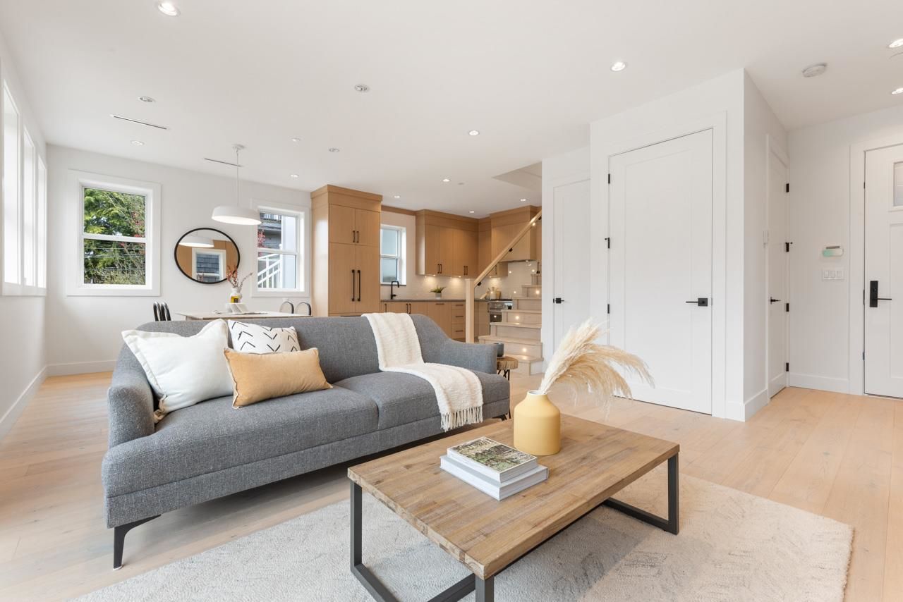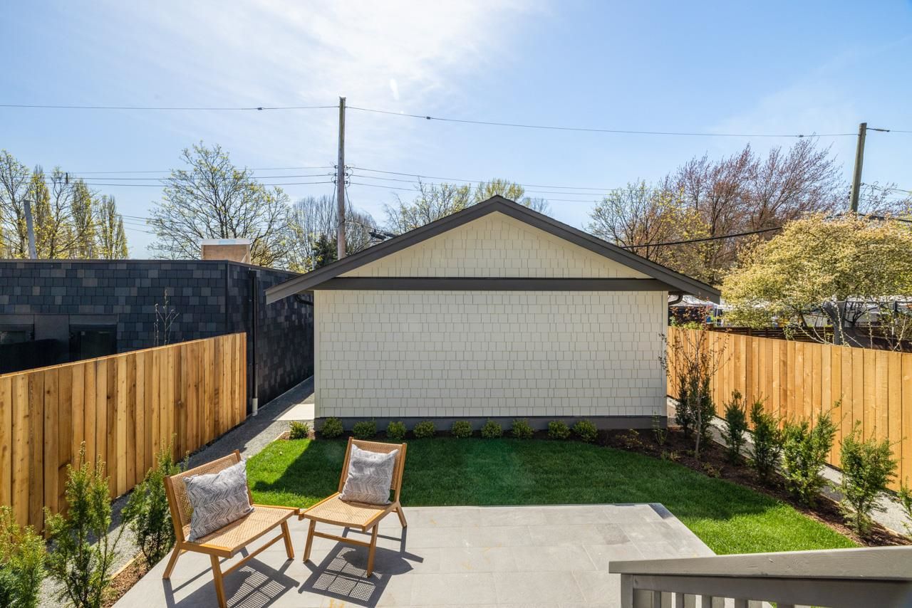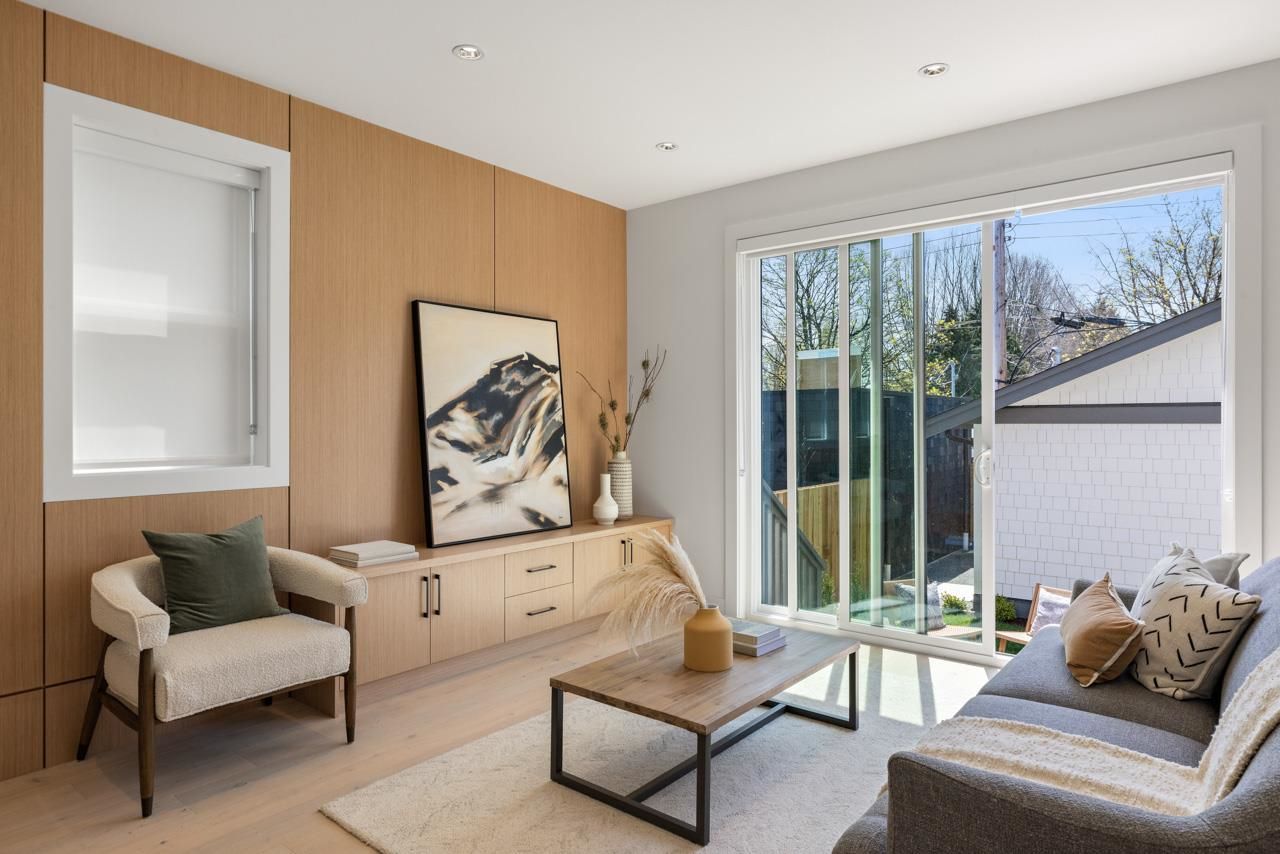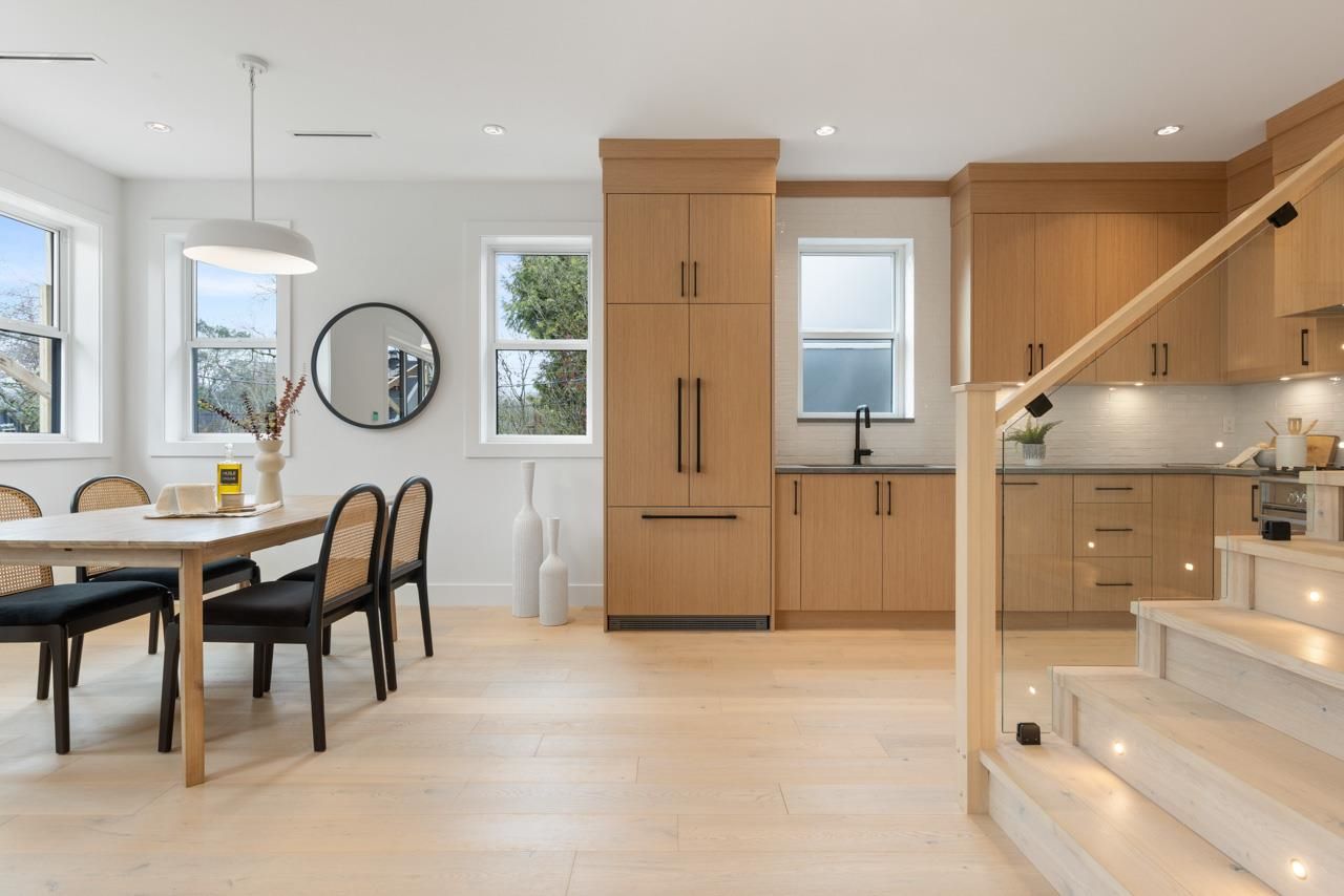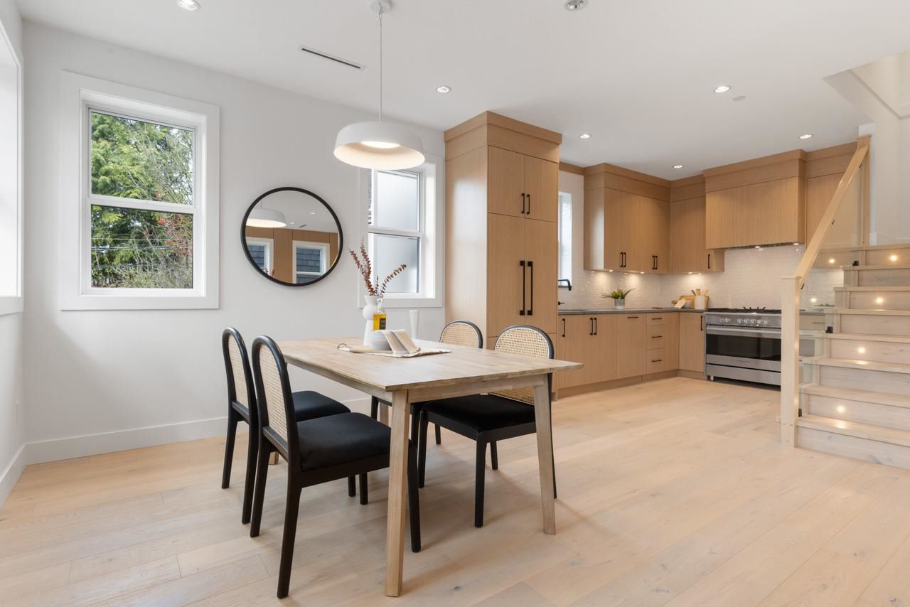 The one you have been waiting for! This spacious, well-appointed back 1/2 duplex offers 1657 SQFT over 3 levels. The bright & open main living space has oversized sliders to the South facing backyard, large dining area & luxurious kitchen complete with integrated appliances & 36" gas Fisher Paykel range. Upstairs you will find the primary bedroom with custom storage & sparkling ensuite, 2nd bedroom, 4 pc bath, laundry & 3rd bedroom. The top floor has the 4th bedroom that also makes a great primary with beautiful ensuite and private balcony overlooking Trout Lake. This exceptional home is sure to impress with hardwood throughout, radiant in-floor heat, A/C, crawlspace storage, 1 car garage all in a fantastic neighbourhood close to parks, schools, transit and Commercial Drive. Come see!